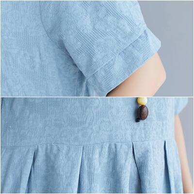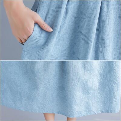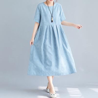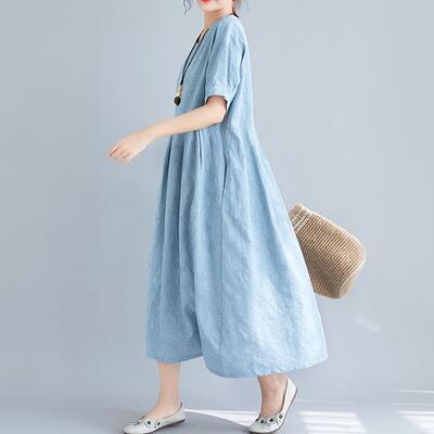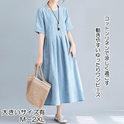 ゆったり 体型カバーリネン ワンピース ナチュラル 半袖 薄手 涼しい コットン おしゃれ 春 夏 きれいめ 袖あり ミモレ丈 エレガント 夏 春夏 秋 レディース ロング丈 ワンピ ドレス 花柄 カジュアル ハイウエスト シンプル リラックス ブルー 麻 綿 リネン混 20代 30代 40代 50代