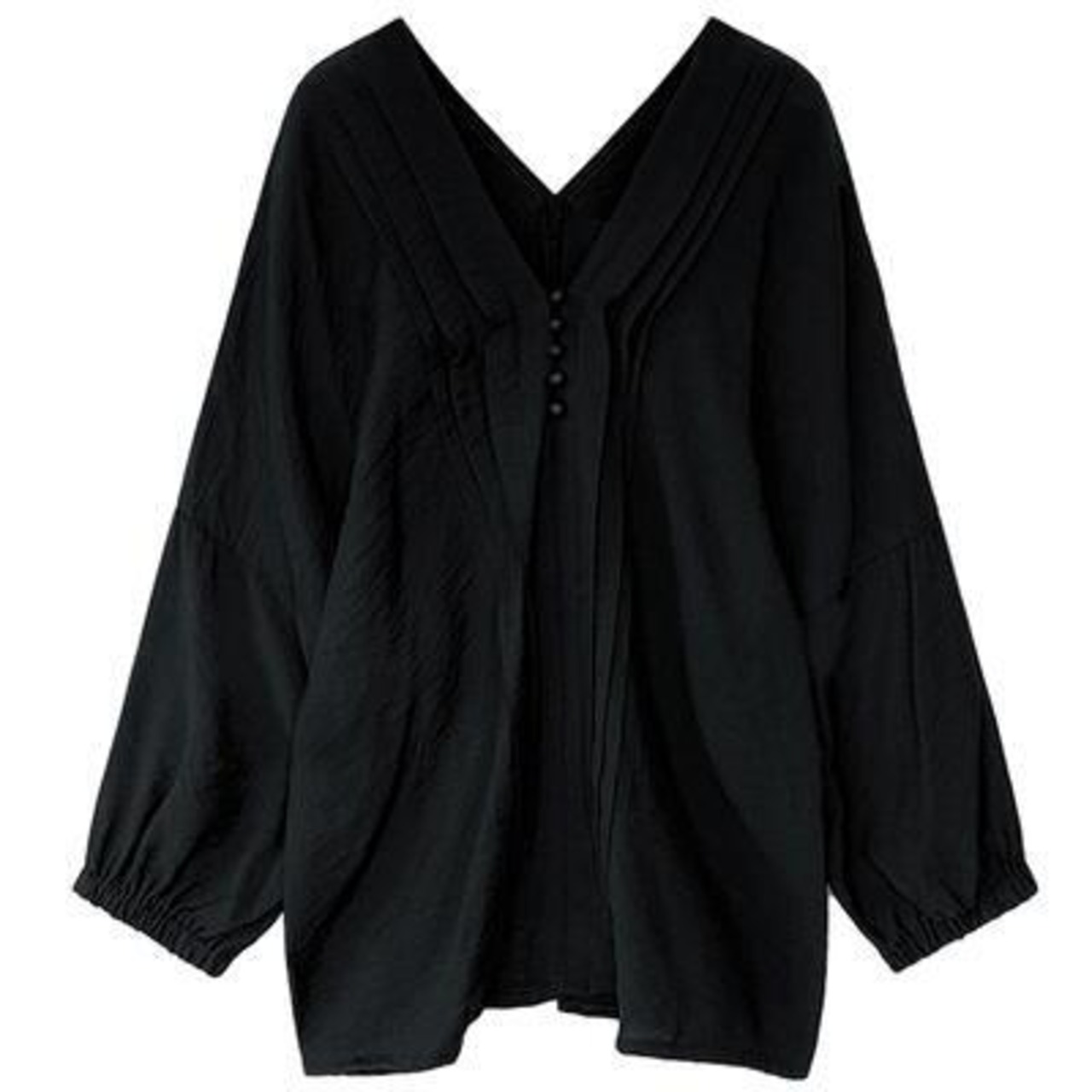 全3色 ゆったり こなれ感トップス レディース ブラウス きれいめ シャツ おしゃれ 袖あり パフスリーブ ドロップショルダー 長袖 Vネック くるみボタン 無地 体形カバー 通勤 オフィス カジュアル フェミニン 大きいサイズ 白 ホワイト イエロー 黒 ブラック 春 夏 春夏 秋 20代 30代 40代 50代