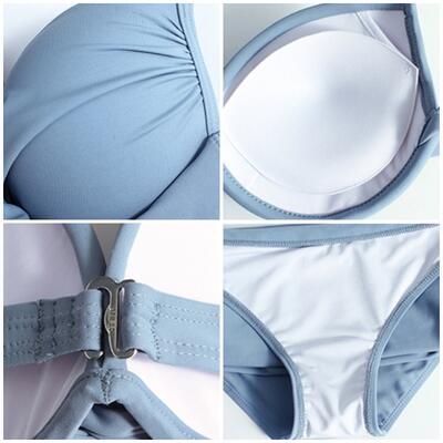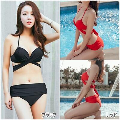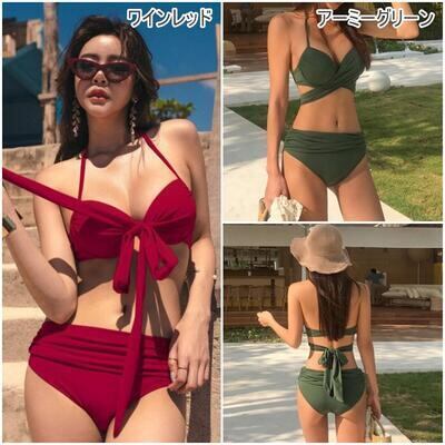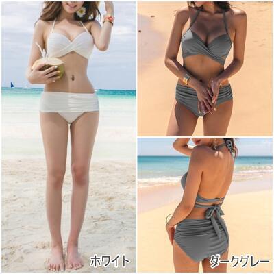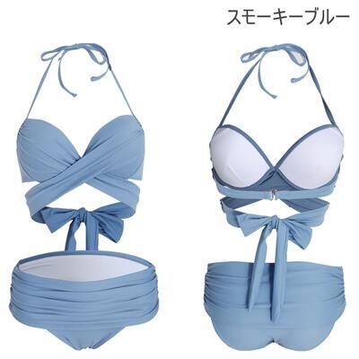 全9色 レディース 水着 ビキニ おしゃれ スイムウェア 上下 2点セット ホルターネック クロス ワイヤー リボン 無地 体形カバー 可愛い シンプル カジュアル 夏 大きいサイズ 白 ホワイト ブルー 青 カーキ 黒 ブラック レッド 赤 グリーン グレー 20代 30代 40代 50代