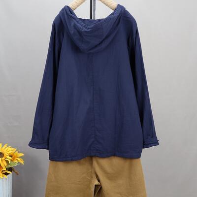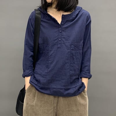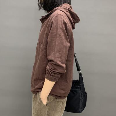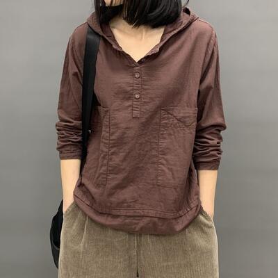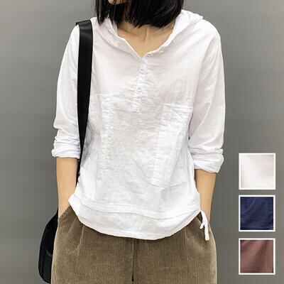 全3色 麻 リネン トップス レディース ブラウス きれいめ カジュアル コットン シャツ おしゃれ 春 春夏 春秋 可愛い シンプル 長袖 フーディー ヘンリーネック ナチュラル プルオーバー リラックス ゆったり 体型カバー ホワイト 白 ブルー ブラウン 綿 リネン混 20代 30代 40代