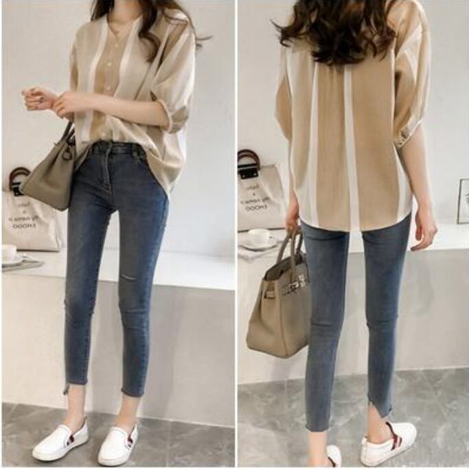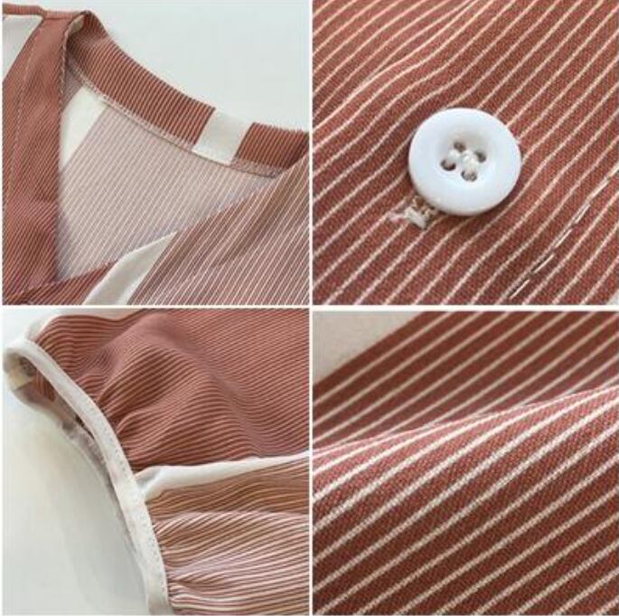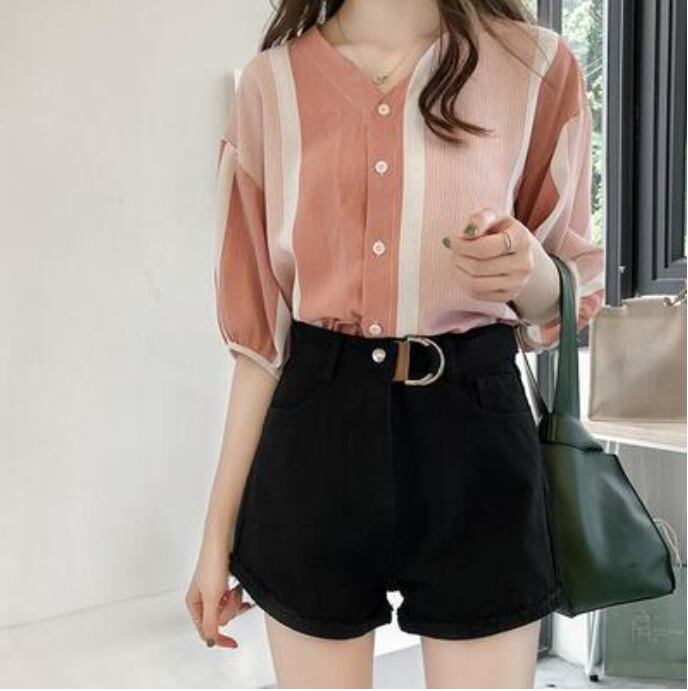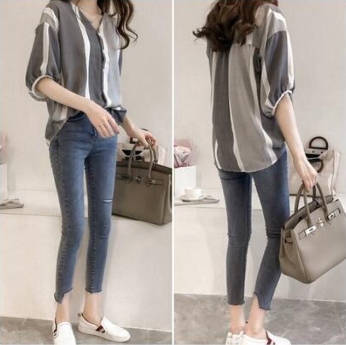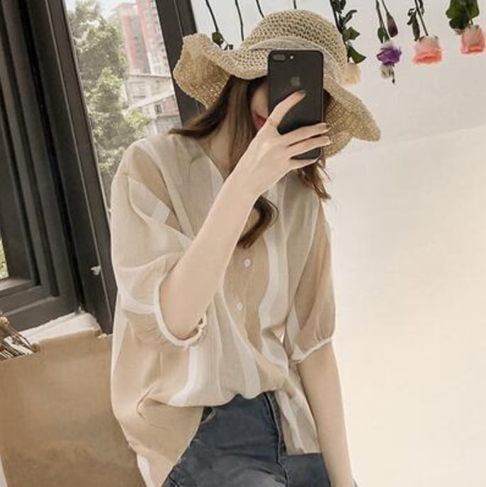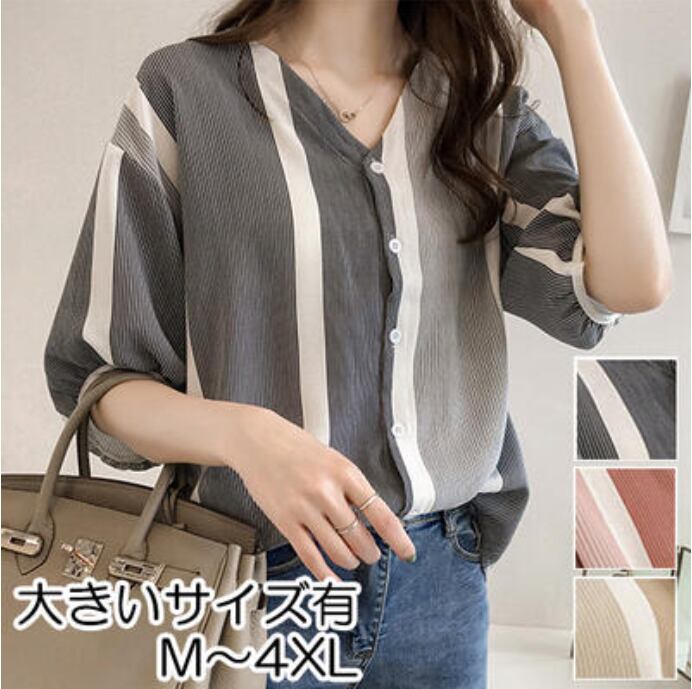 全3色 トップス レディース ブラウス きれいめ カジュアル シャツ おしゃれ 春 春夏 春秋 可愛い Vネック 半袖 5分袖 ストライプ フェミニン エレガント ドロップショルダー ナチュラル オフィス 大きいサイズ ブラック 黒 グレー ピンク イエロー 20代 30代 40代 50代