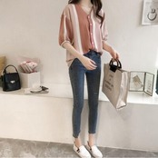 上品なストライプ柄のVネックシャツです。