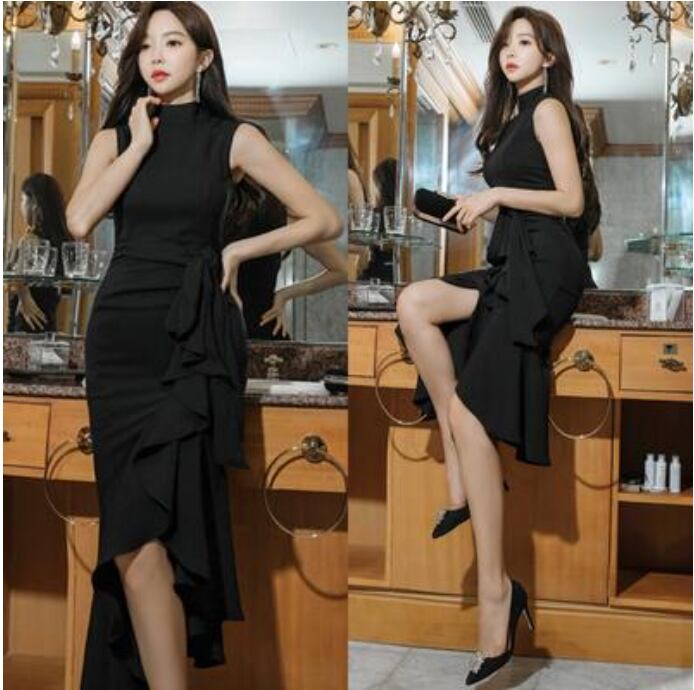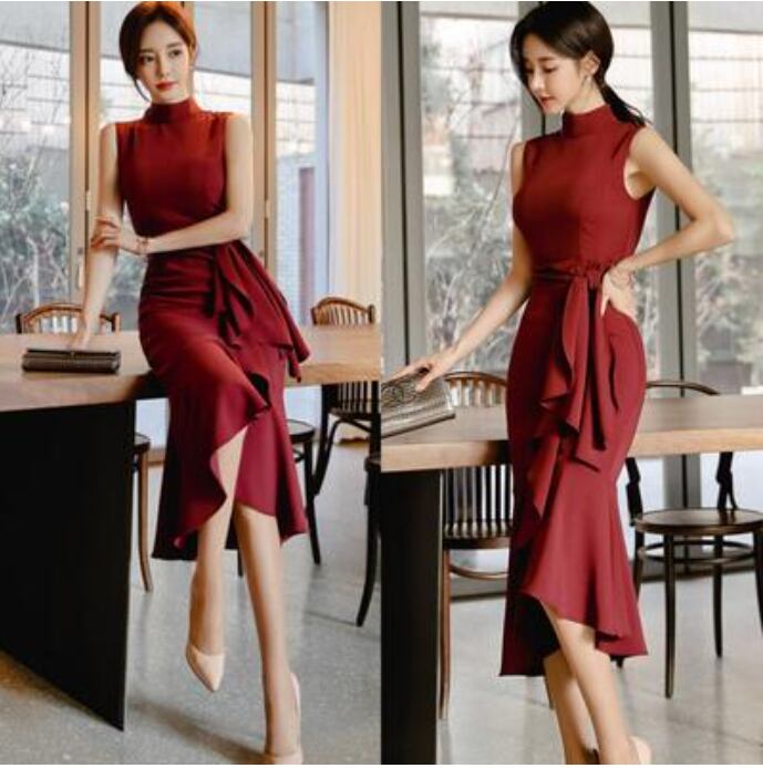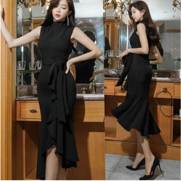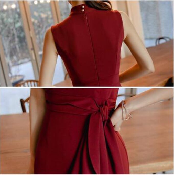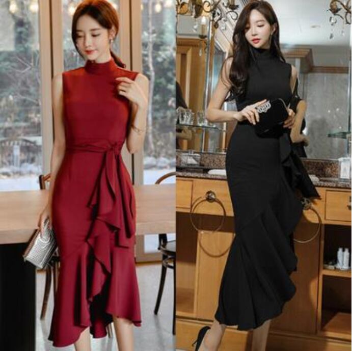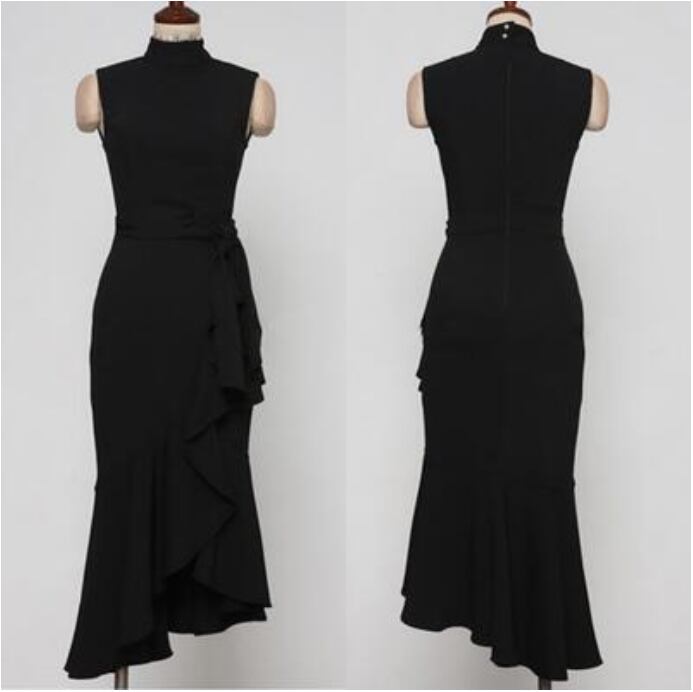 全2色 黒 ワンピース ひざ丈 ミモレ丈 エレガント 夏 ノースリーブ おしゃれ レディース 可愛い フェミニン ワンピ ドレス フリル ウエストリボン スタンドカラー パーティー ハイウエスト きれいめ タイト フォーマル ブラック レッド 赤 春夏 秋 20代 30代 40代 50代