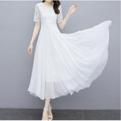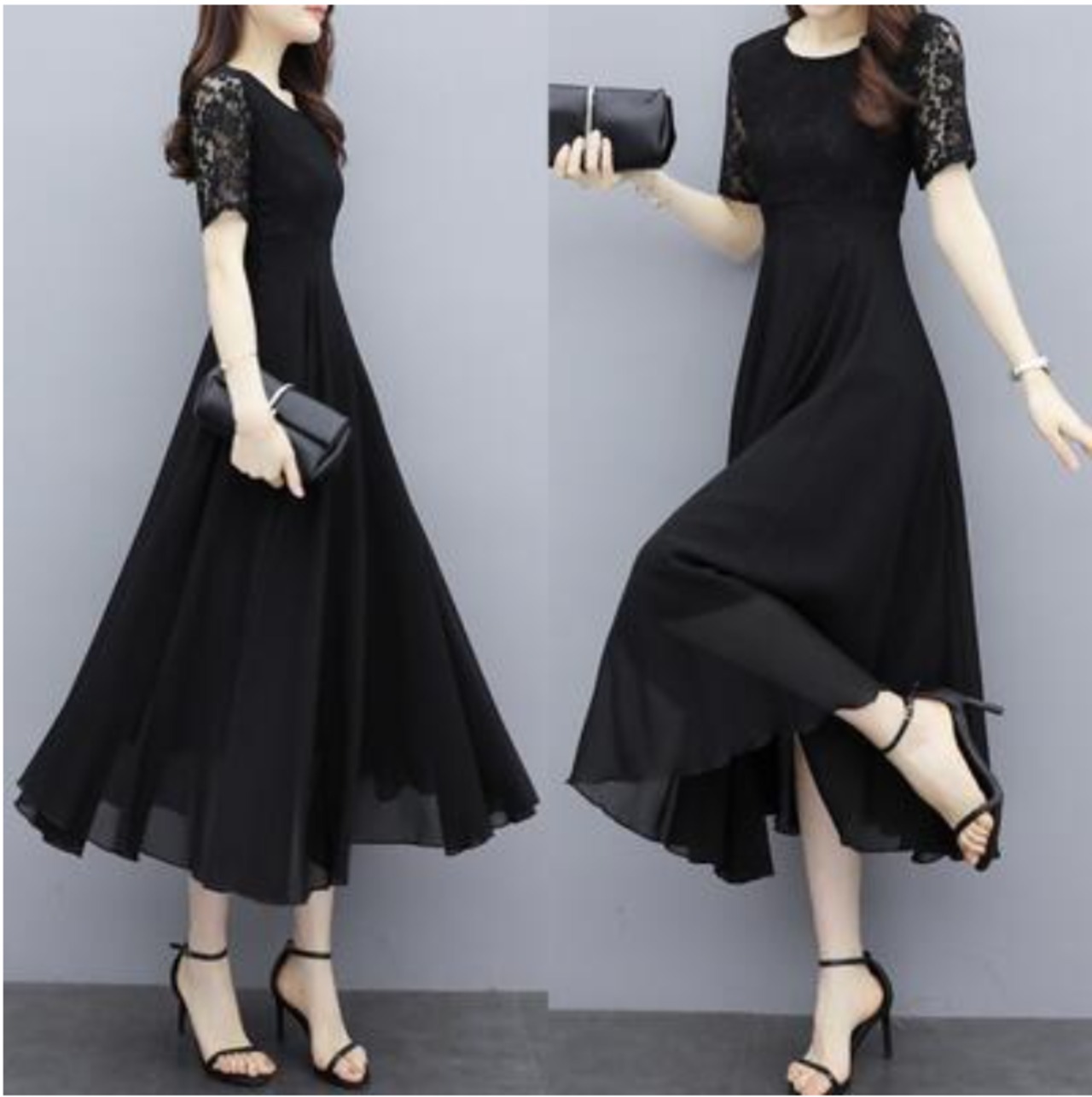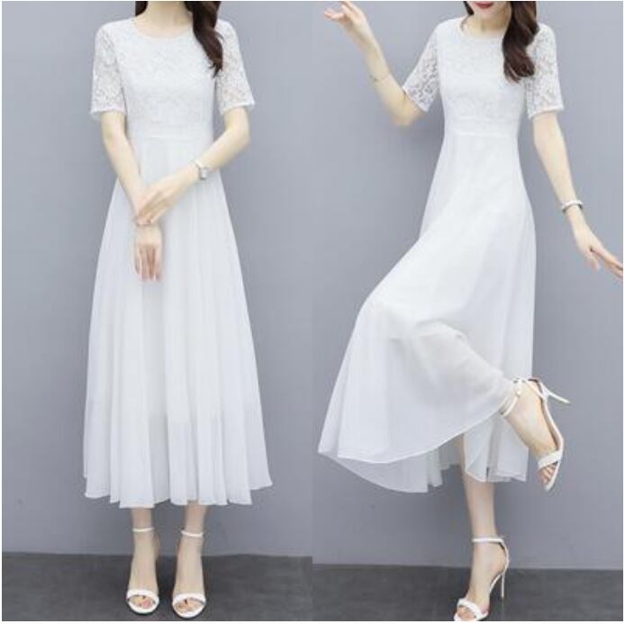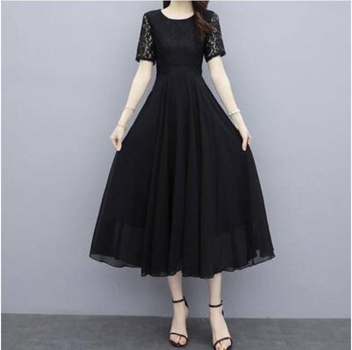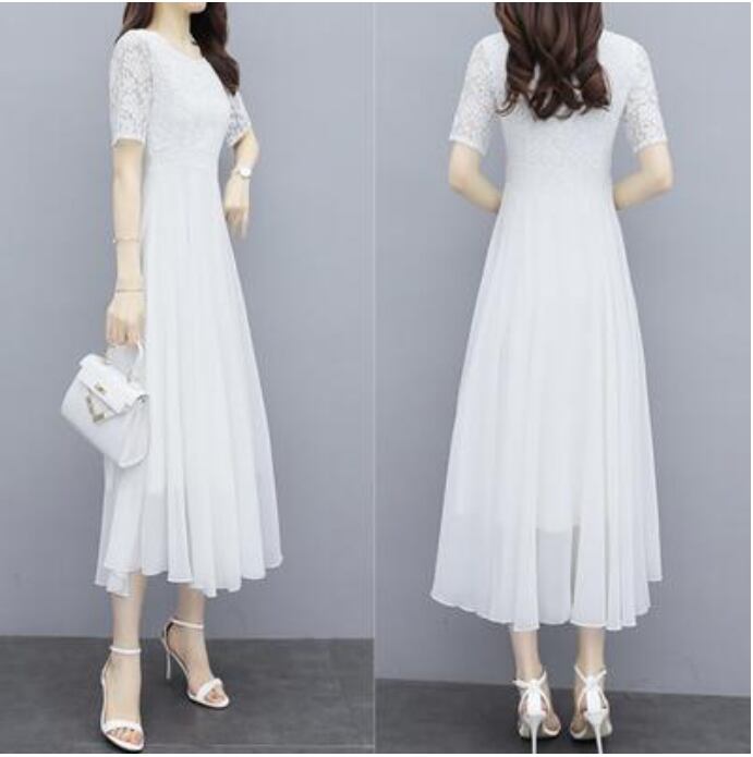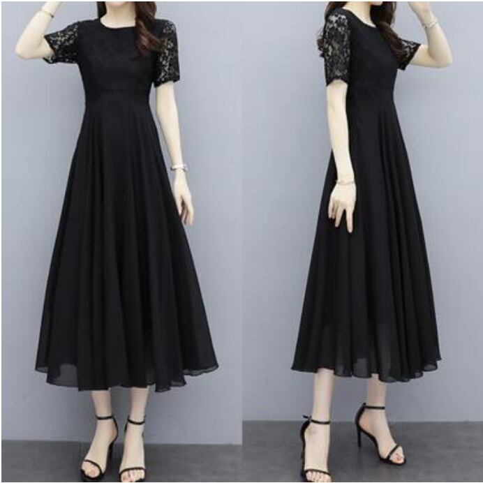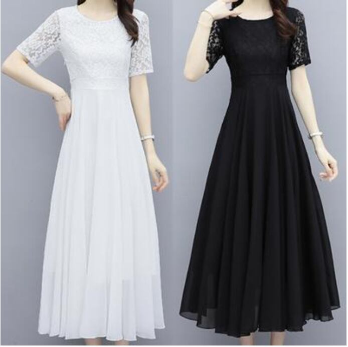 全2色 白 黒 ワンピース 袖あり ミモレ丈 エレガント 夏 半袖 おしゃれ レディース 可愛い フェミニン ワンピ ドレス レース シフォン 結婚式 パーティー ハイウエスト きれいめ Aライン フォーマル お呼ばれ 大きいサイズ ブラック ホワイト 春夏 秋 20代 30代 40代 50代