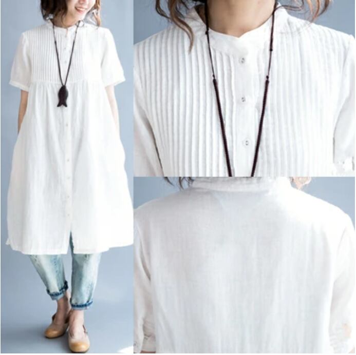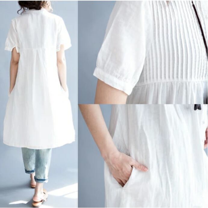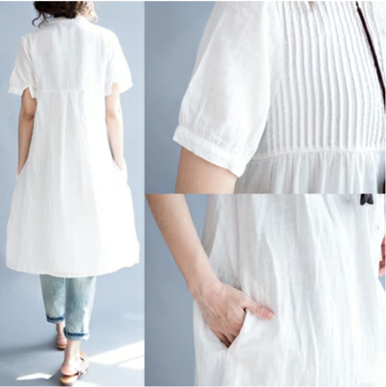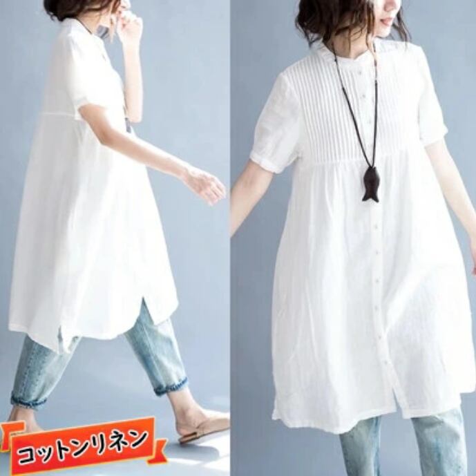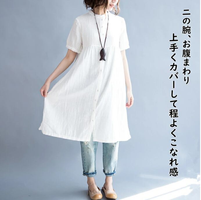 体型カバー ゆったり カジュアル かわいいリネン ワンピース ナチュラル 半袖 薄手 涼しい シャツワンピース ロングシャツ コットン 綿 麻 フロントボタン クルーネック 袖あり ミモレ丈 Aライン 大人 リゾート リラックス オーバーサイズ 白 ホワイト ティアード ワンピ レディース リネン混 春 夏 30代 40代 50代