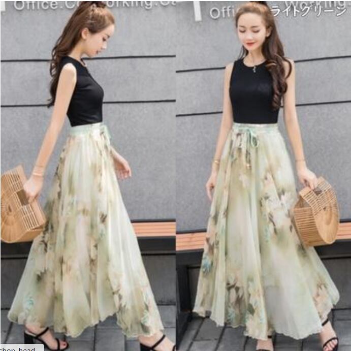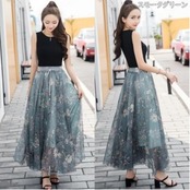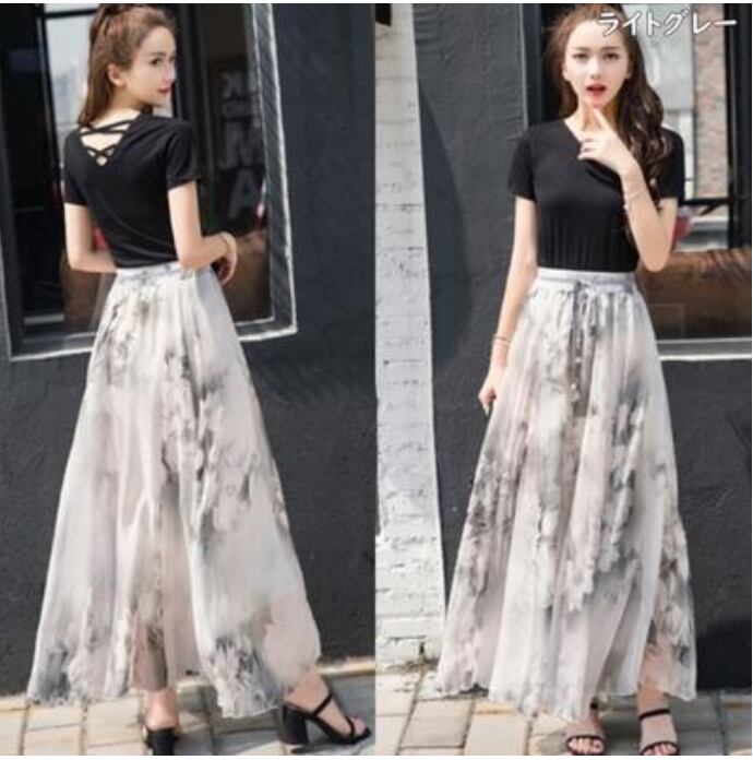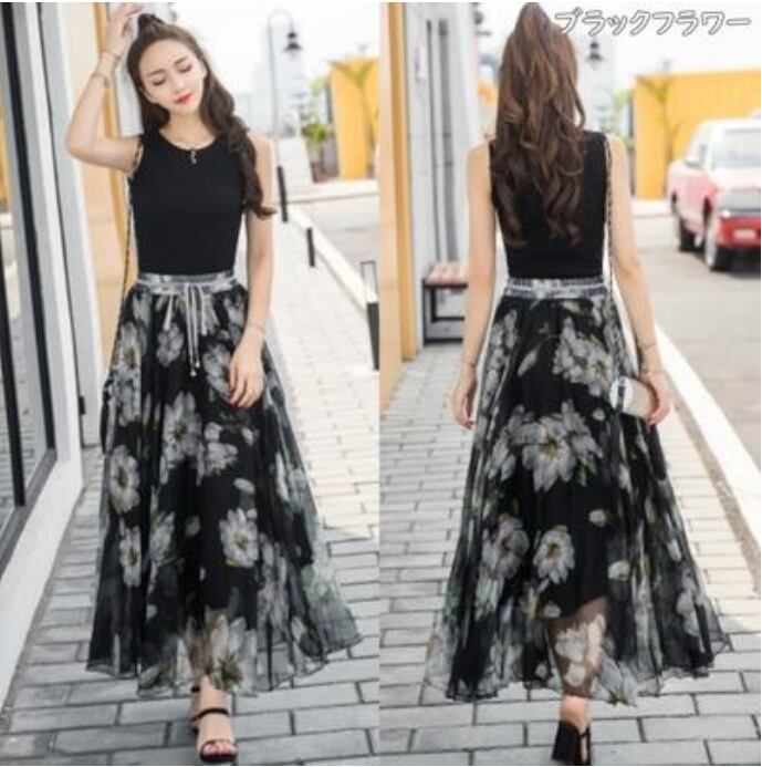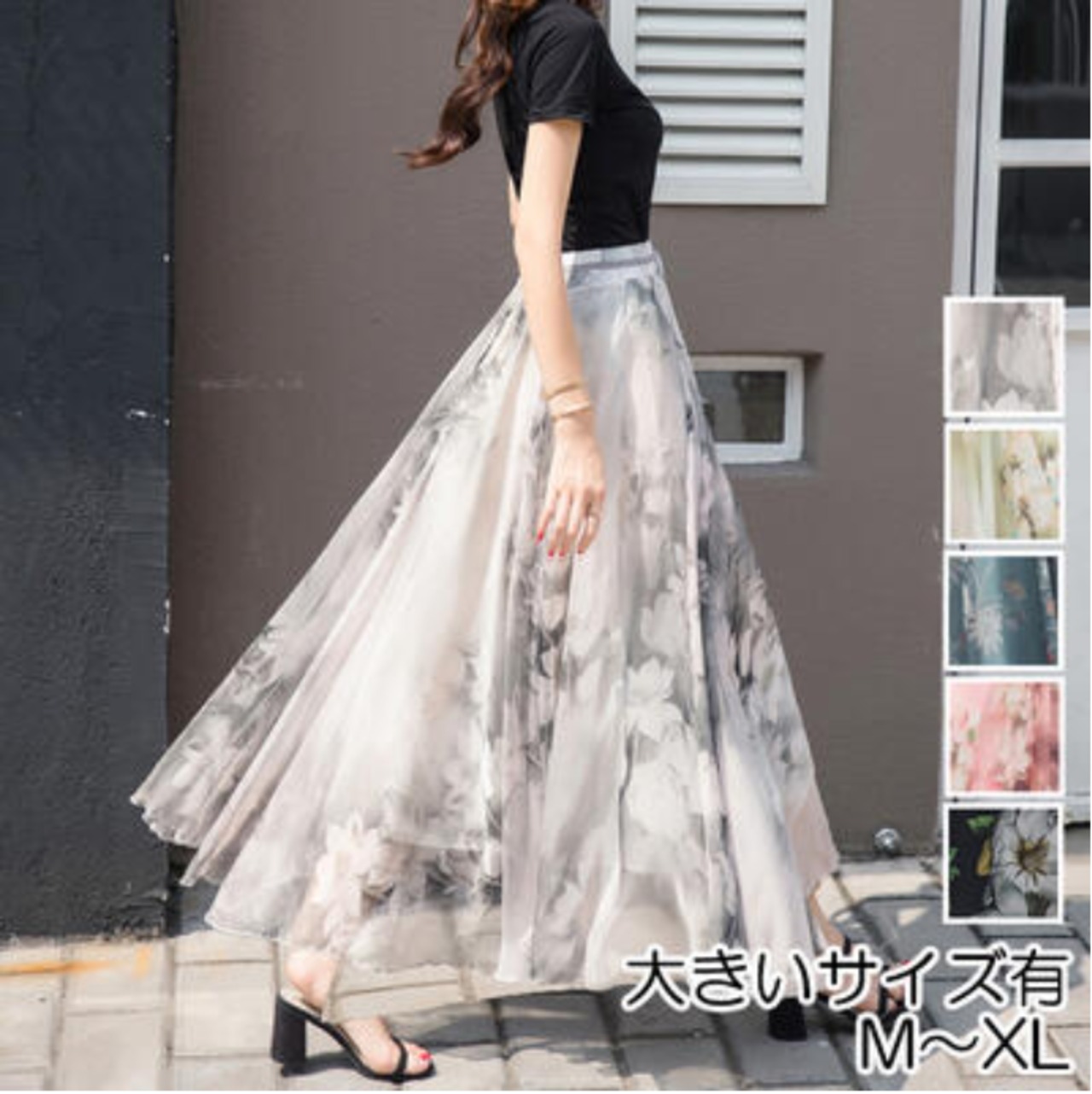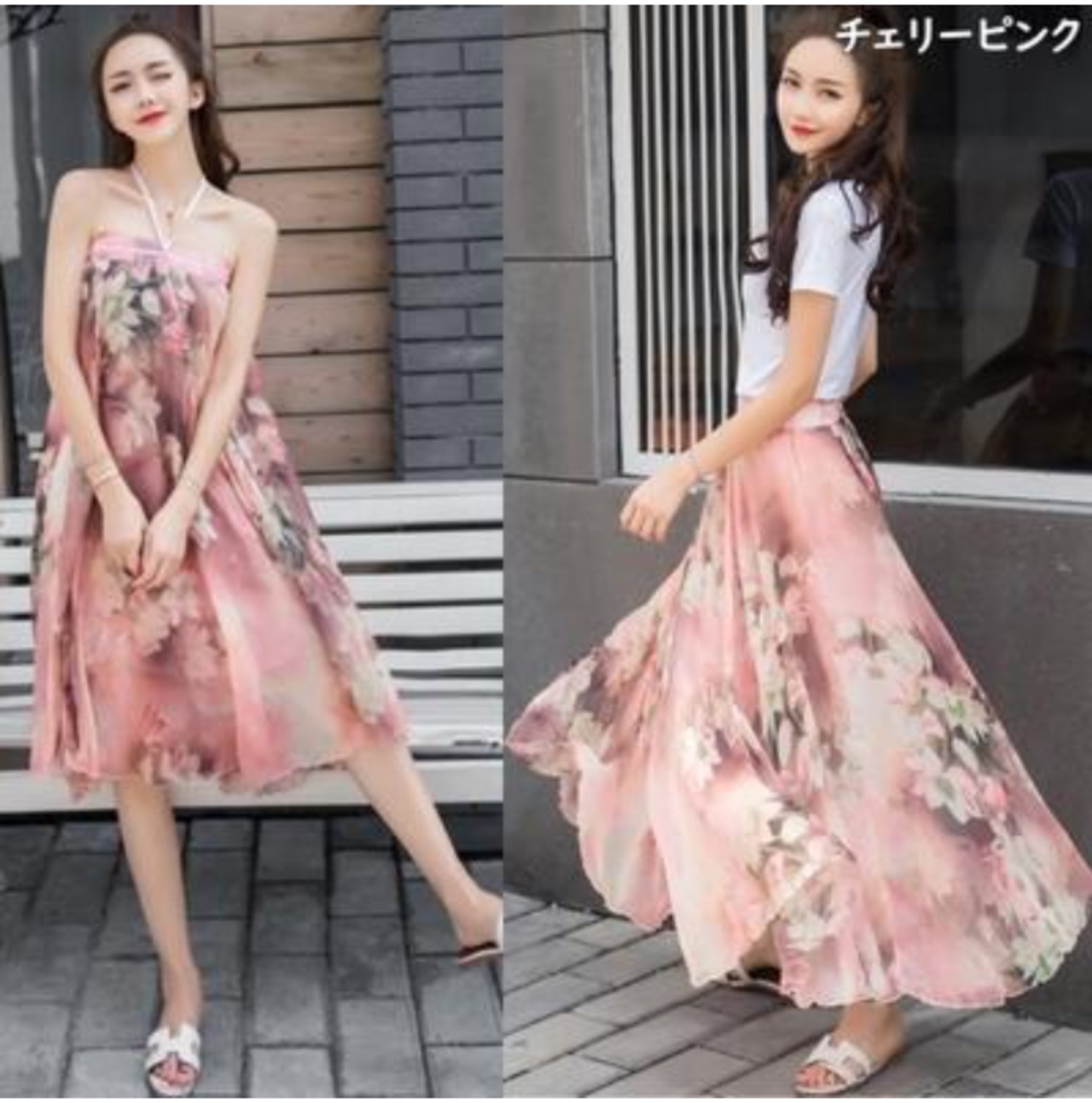 全5色 黒 ワンピース スカート 2Way リゾートワンピ ロング丈 マキシ丈 レディース 夏 きれいめ カジュアル ボトムス ロングスカート ウエストゴム 楽ちん シフォン フレア ガーリー フェミニン 春夏 秋 大きいサイズ ピンク ブラック グレー グリーン 20代 30代 40代 50代