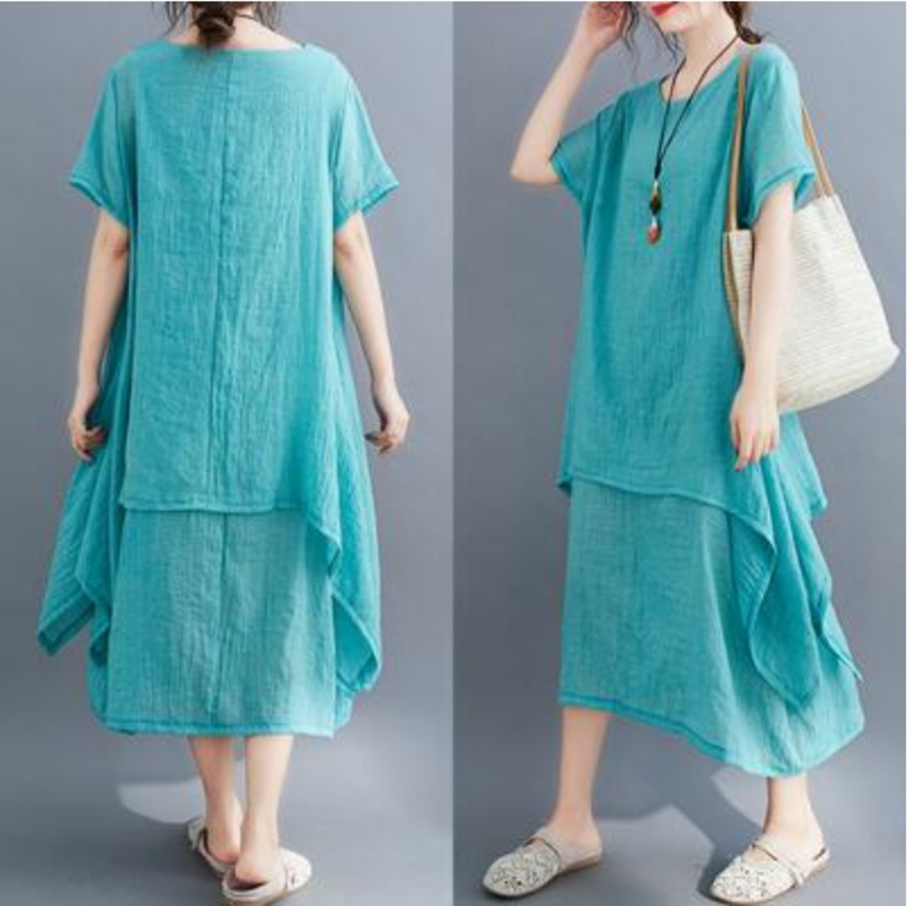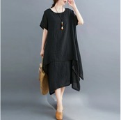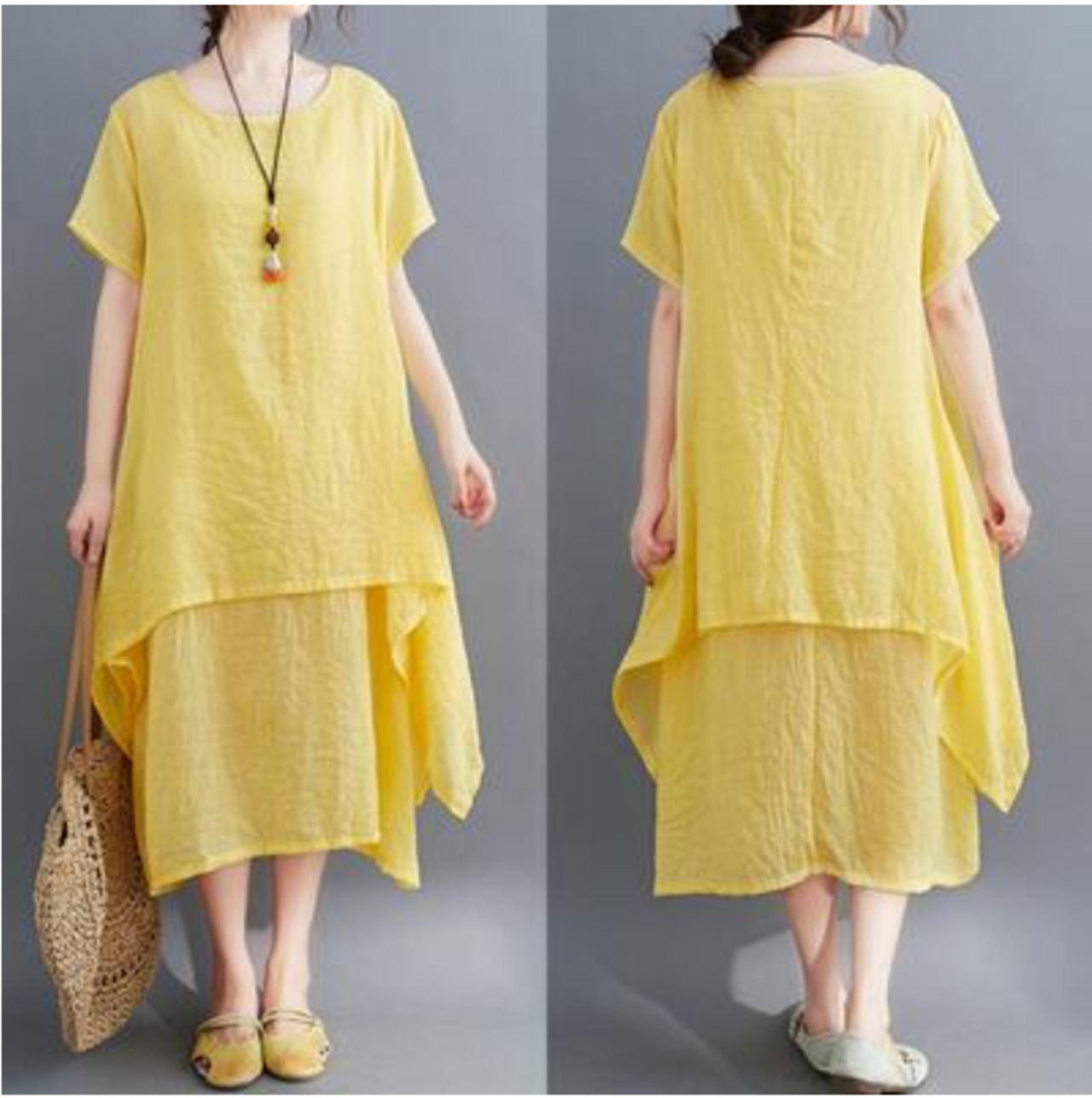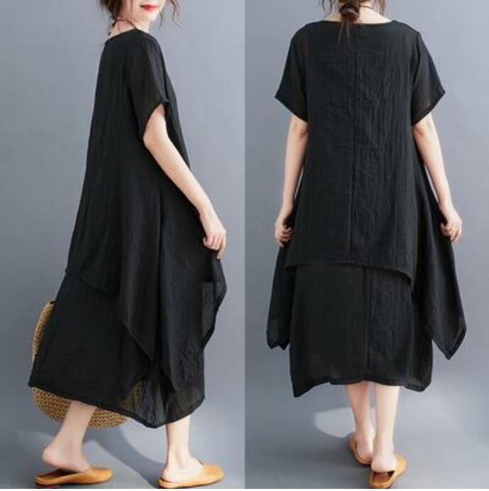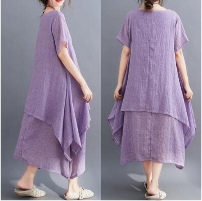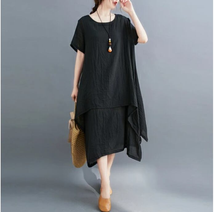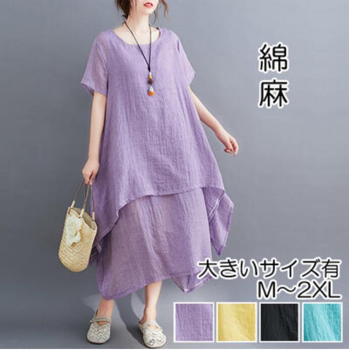 全4色 ゆったり 大きいサイズ XL 2XL リラックスリネン ワンピース ナチュラル 半袖 薄手 コットン 涼しい 袖あり ロング丈 ミモレ丈 カジュアル 麻 綿 春 夏 春夏 おしゃれ レディース 可愛い フェミニン ワンピ ドレス レイヤード デイリー ブラック 黒 イエロー パープル グリーン リネン混 20代 30代 40代 50代