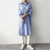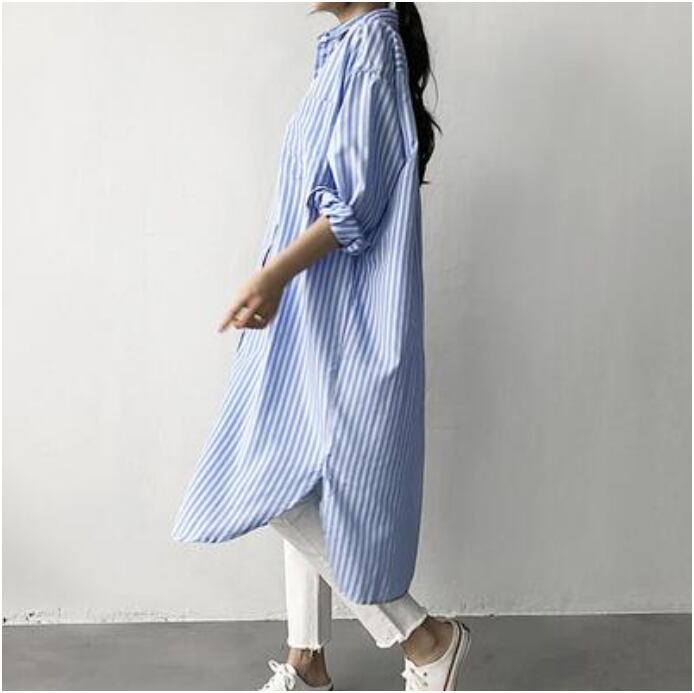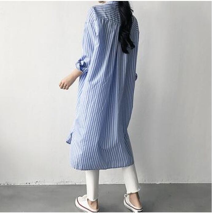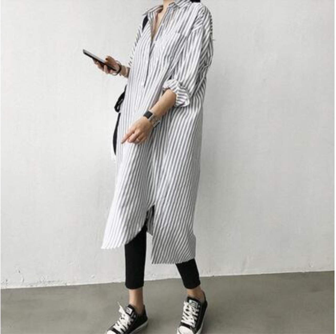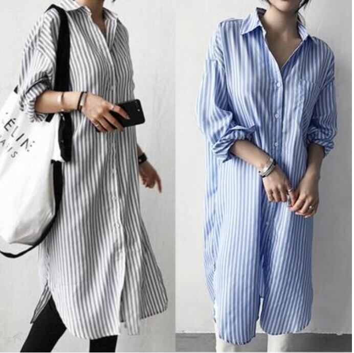 全2色 ワンピース ミモレ丈 カジュアル 春 春夏 春秋 長袖 おしゃれ レディース 可愛い マニッシュ ワンピ ドレス デイリー リラックス ストライプ シャツワンピース 体型カバー ゆったり 大きいサイズ シンプル ブルー ブラック 黒 20代 30代 40代 50代