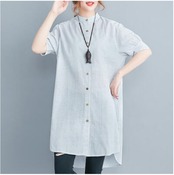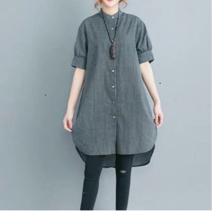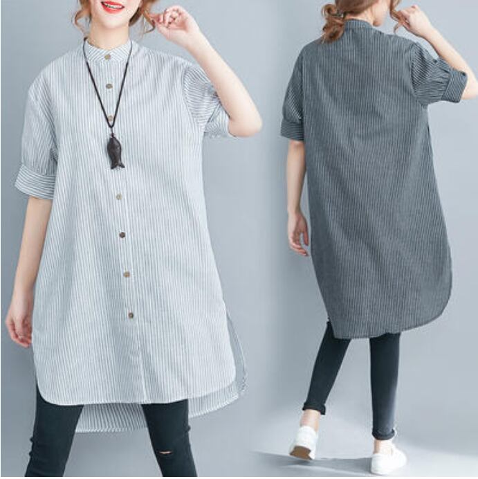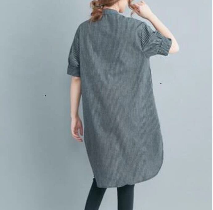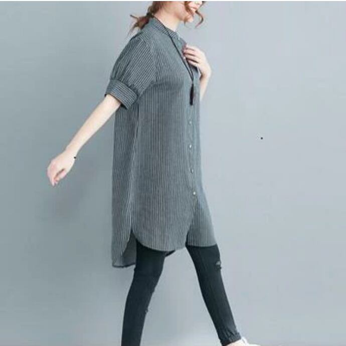 全2色 大きいサイズ XL 2XL オルチャン カジュアル麻 リネン シャツ ブラウス 薄手 コットン トップス レディース 袖あり きれいめ チュニック ワンピース ひざ丈 夏 きれいめ 半袖 おしゃれ シャツワンピ Aライン 着痩せ 体型カバー 春夏 春 春秋 秋 ストライプ 韓国 オーバーサイズ 綿 リネン混 ナチュラル 20代 30代 40代