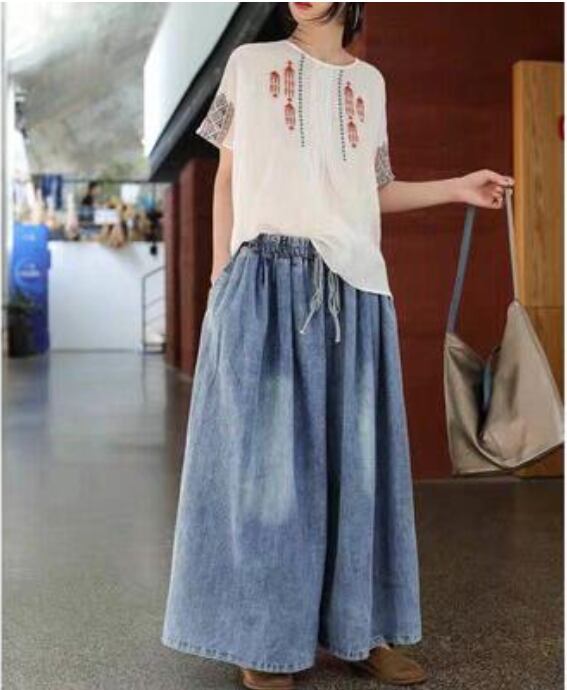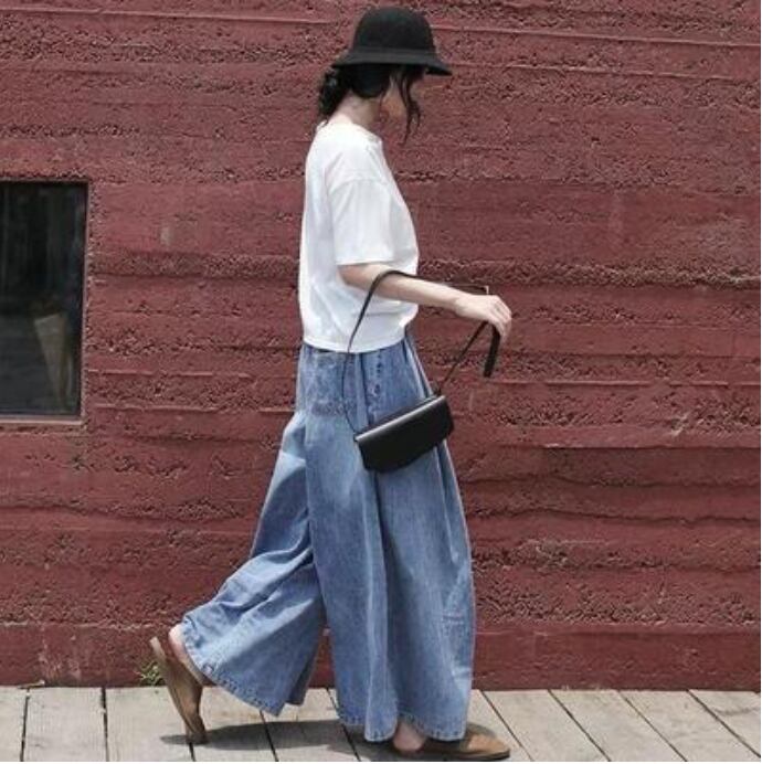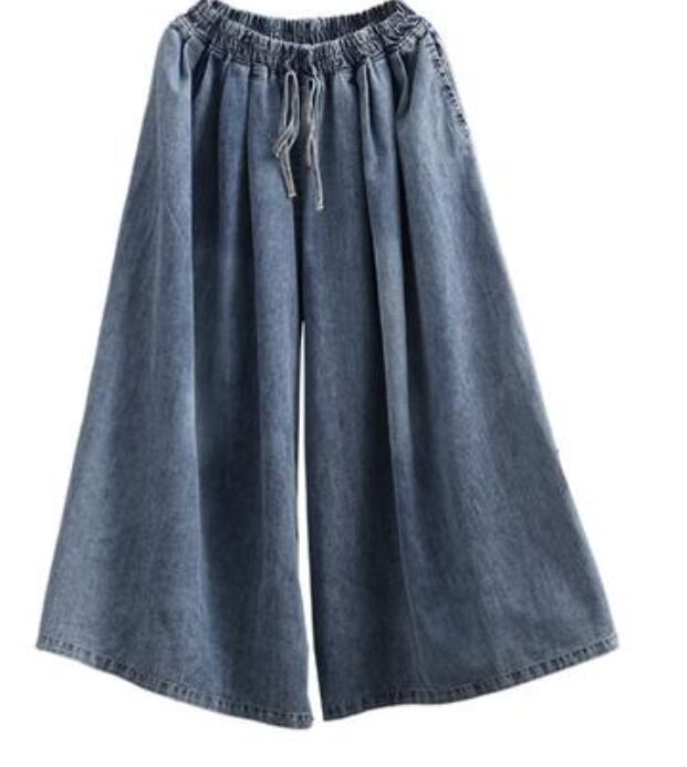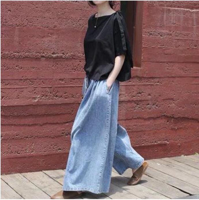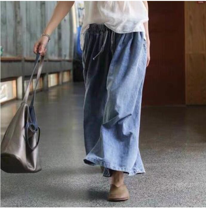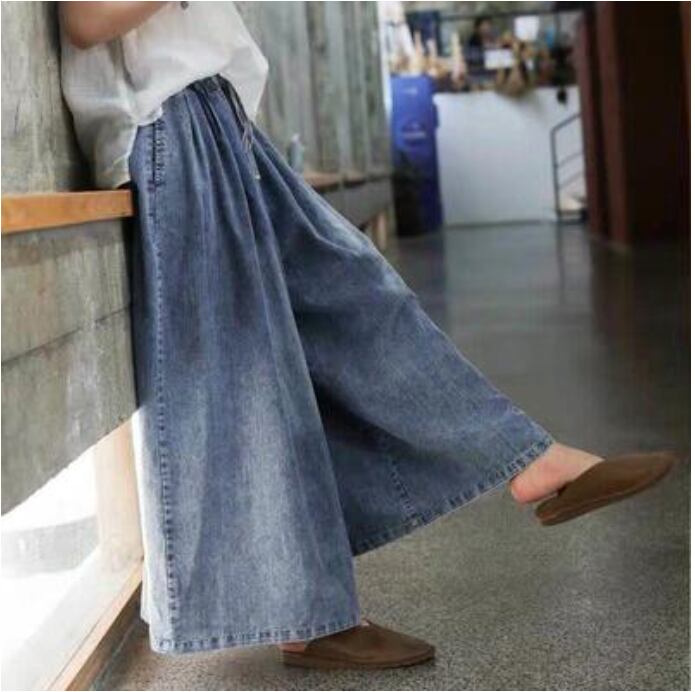 ワイドパンツ レディース カジュアル ロング丈 春 おしゃれ ゆったり デニム ワイドレッグ パンツ ボトムス 春夏 春秋 ウエストゴム 楽ちん オールシーズン デイリー シンプル お尻カバー ヴィンテージ ガウチョ ブルー 20代 30代 40代 50代