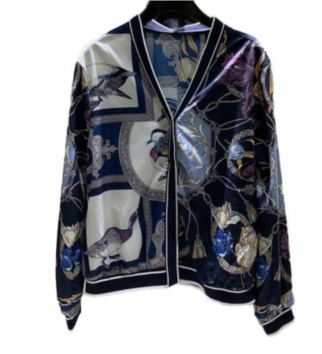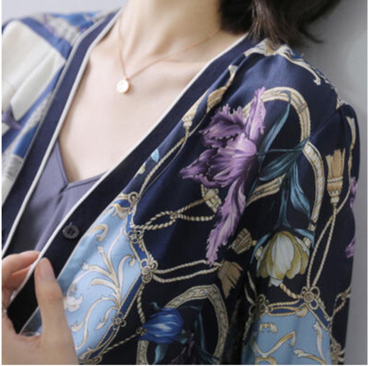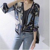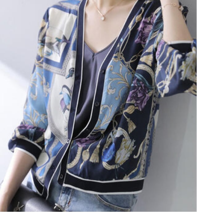 カーディガン トップス レディース 春コート ミセス ジャケット アウター 春 ミディアム 春秋 シフォン おしゃれ カジュアル 薄手 長袖 スカーフ柄 かっこいい 大きいサイズ 体型カバー フェミニン きれいめ エレガント XL 2XL 3XL ブルー 20代 30代 40代 50代