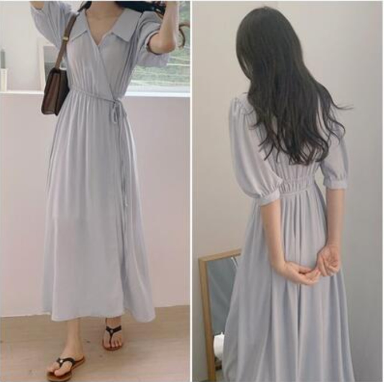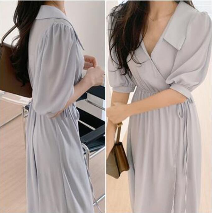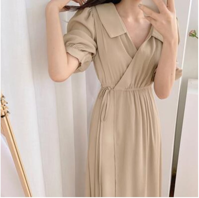 全2色 ワンピース ロング丈 マキシ丈 カジュアル 夏 半袖 おしゃれ レディース 襟あり 可愛い フェミニン ワンピ ドレス カシュクール ウエストリボン ハイウエスト Aライン エレガント 体型カバー ゆったり シンプル カーキ ブルー 春夏 秋 20代 30代 40代 50代