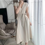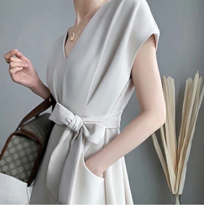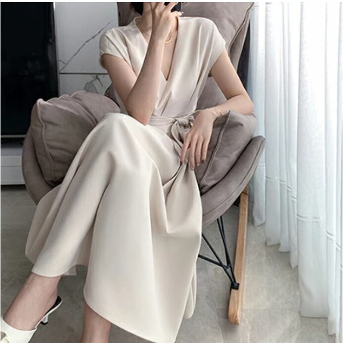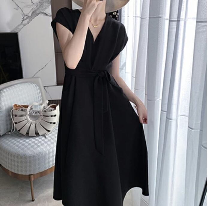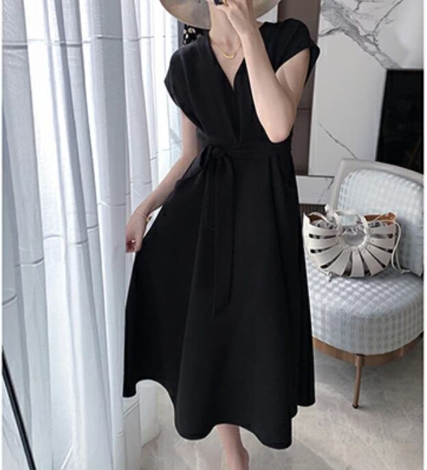 全2色 フレンチスリーブ ウエストリボン きれいめ黒 ワンピース ロング カジュアル 春 夏 おしゃれ 袖あり ミモレ丈 春夏 秋 半袖 レディース ロング丈 ワンピ かっこいい ドレス Vネック フレア 大きめサイズ シンプル 通勤 お呼ばれ デート ホワイト ブラック ブルー 白 青 XL 2XL 3XL 4XL 20代 30代 40代 50代