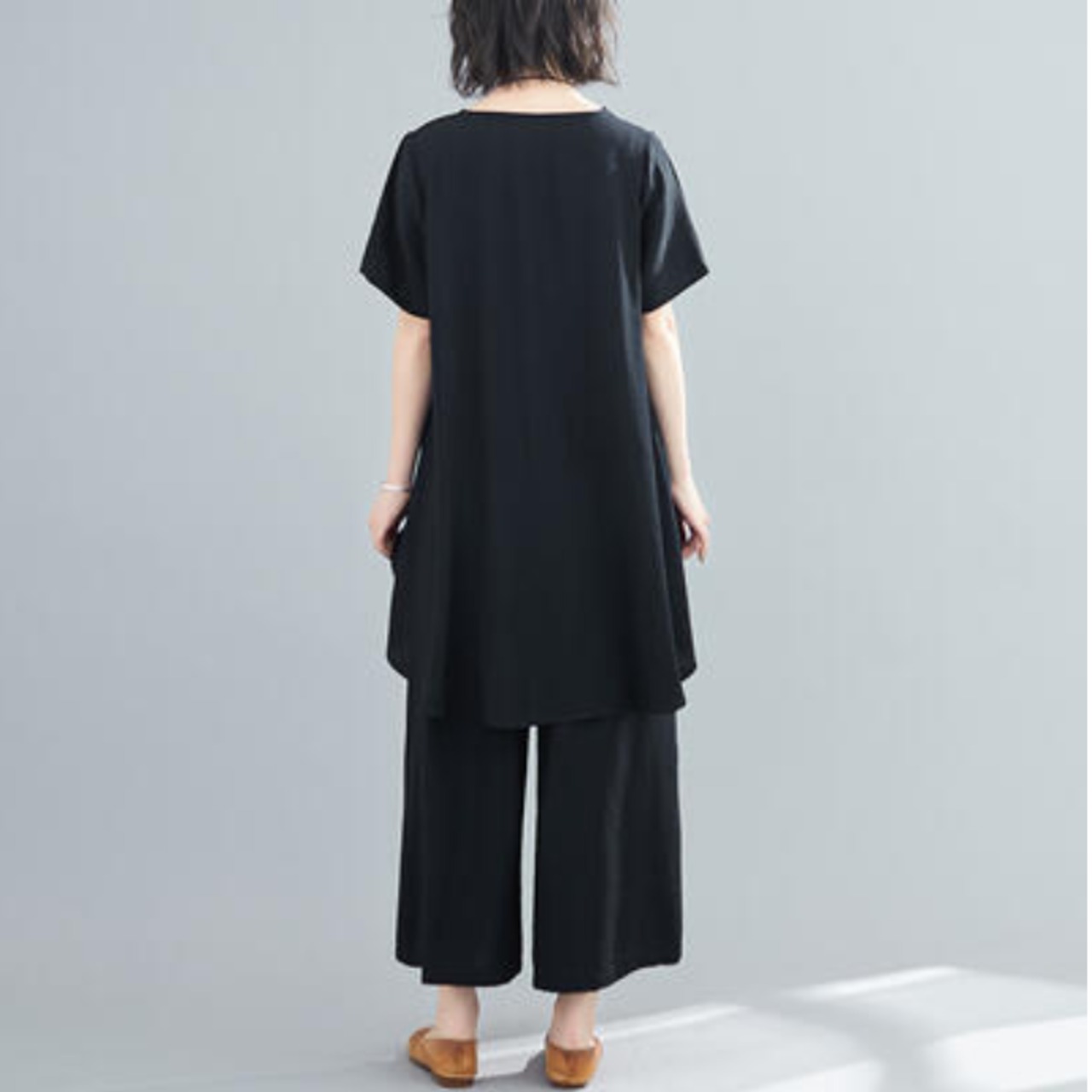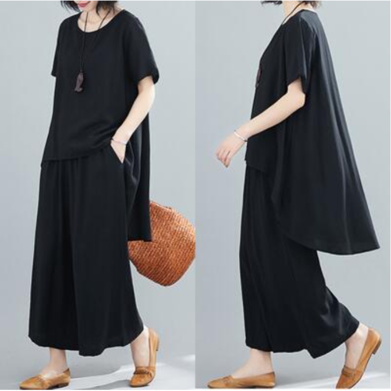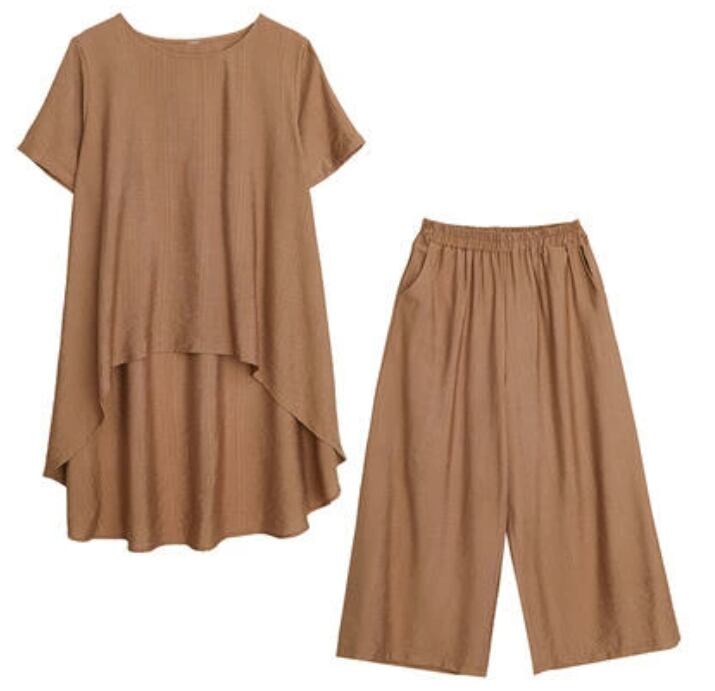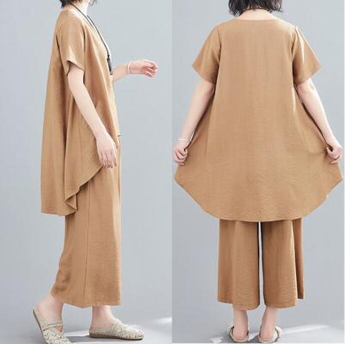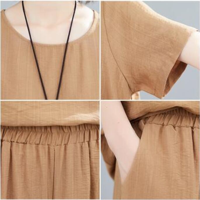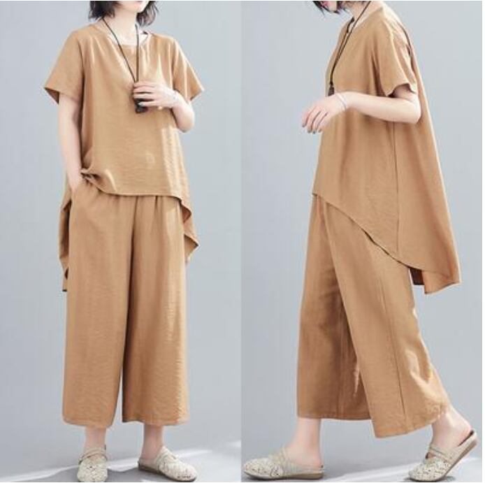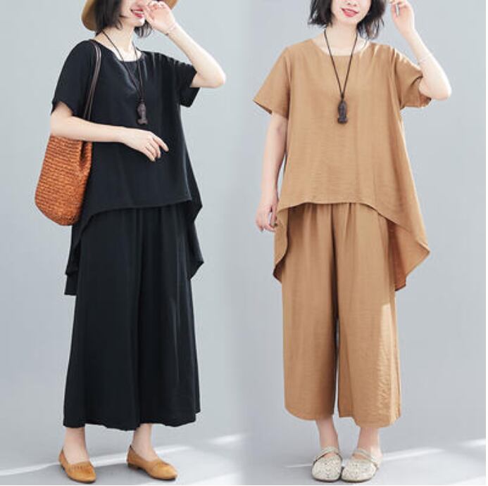 全2色 リラックス ゆったり 体型カバーリネン ナチュラル セットアップ コットン レディース カジュアル おしゃれ 2点セット 春 夏 秋 パンツセット 麻 綿 Tシャツ カットソー 着回し 半袖 ガウチョ クロップド ルームウェア 大きいサイズ 2XL カーキ ブラック 黒 リネン混 20代 30代 40代 50代