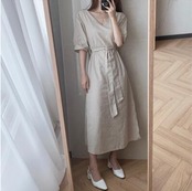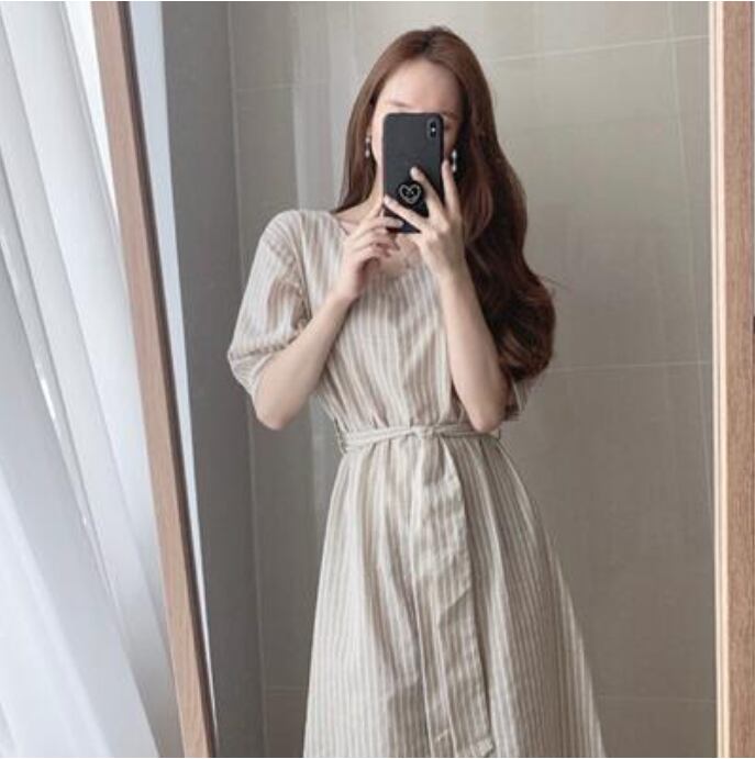 全2色 ゆったり こなれ感 かっこいい ワンピ ドレスワンピース ロング カジュアル 春 夏 ストライプ きれいめ 袖あり おしゃれ カジュアル レディース 大人可愛い ベージュ ブルー ストライプ ウエストリボン 足長効果 体型カバー ぬけ感 青 お出かけ お呼ばれ 半袖 Vネック ミモレ丈 20代 30代 40代 50代