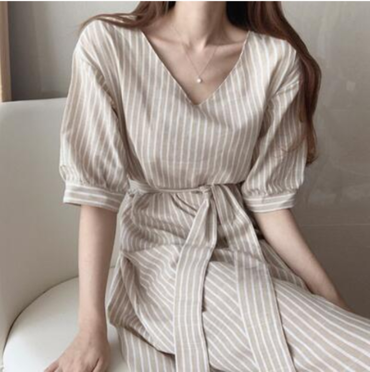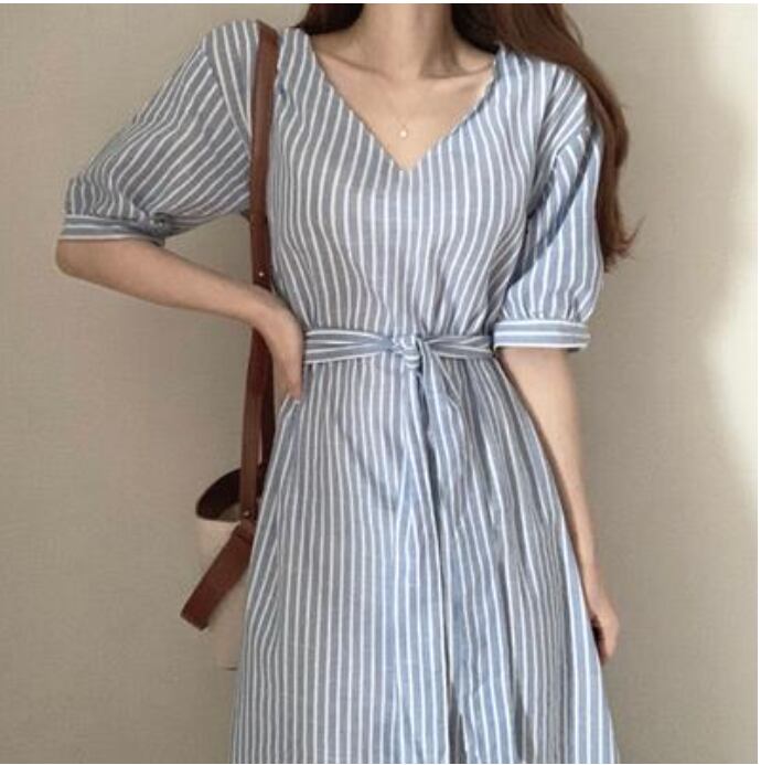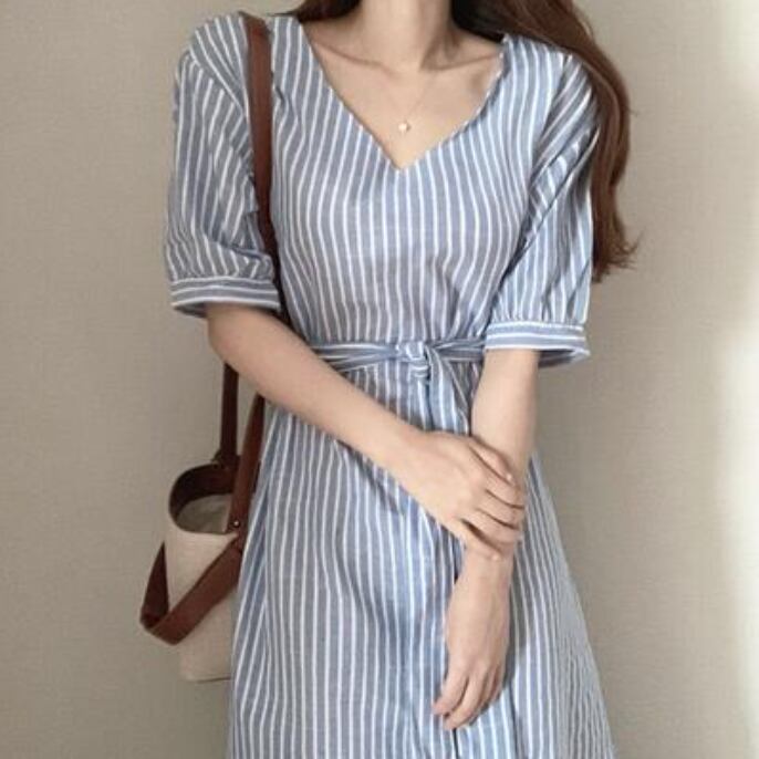 涼しげで爽やかなVネックでストライプ柄のワンピース。