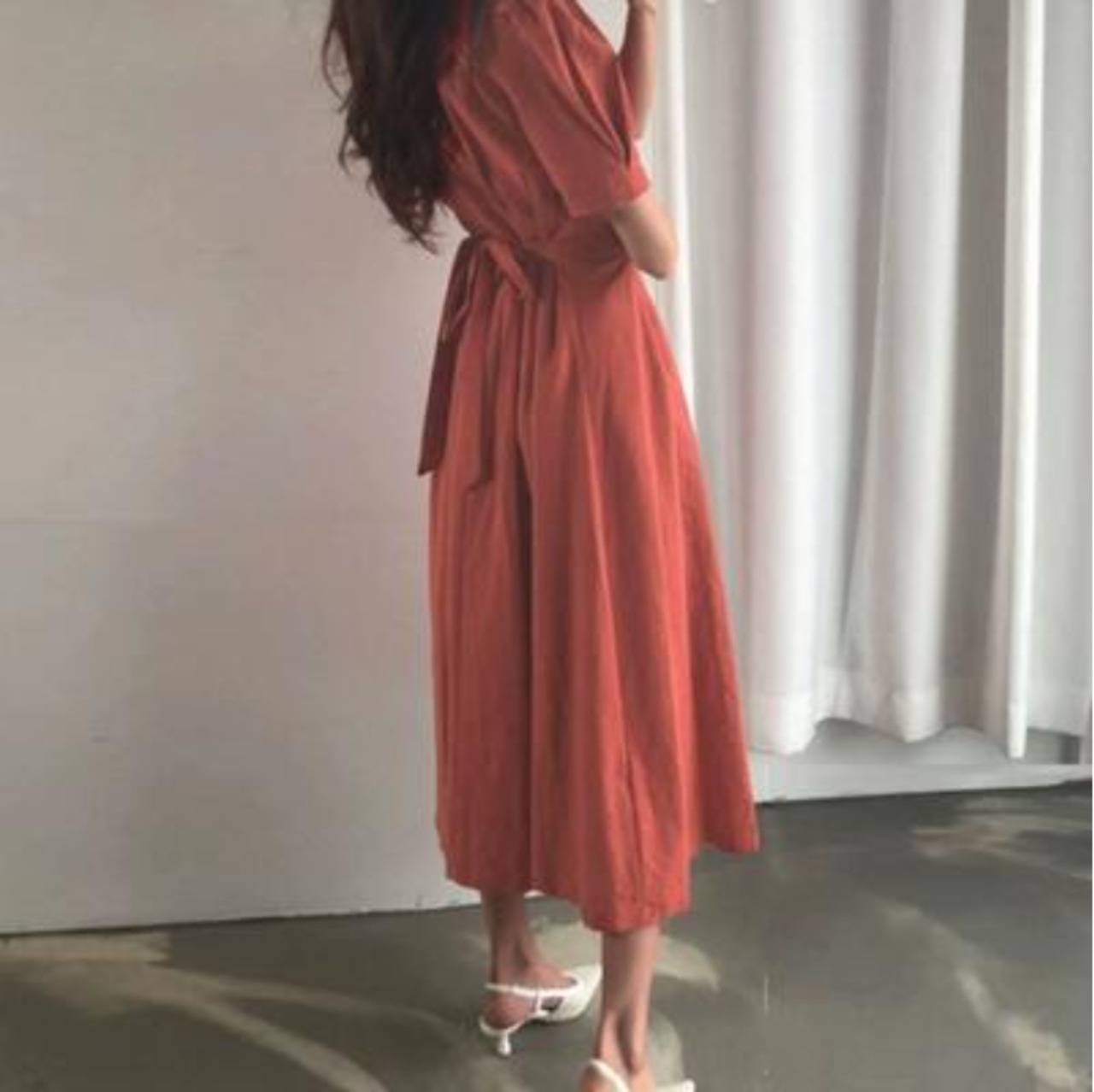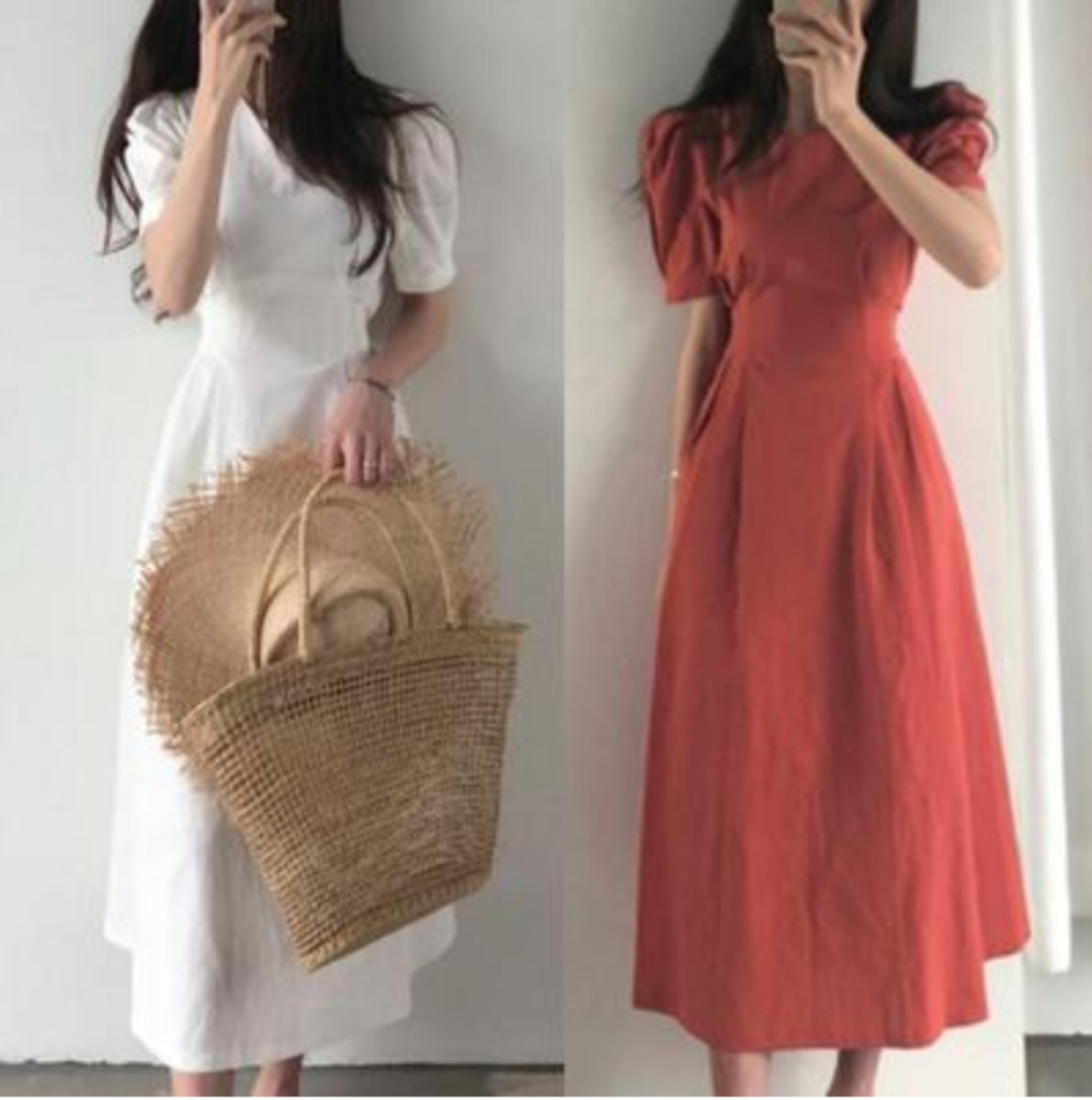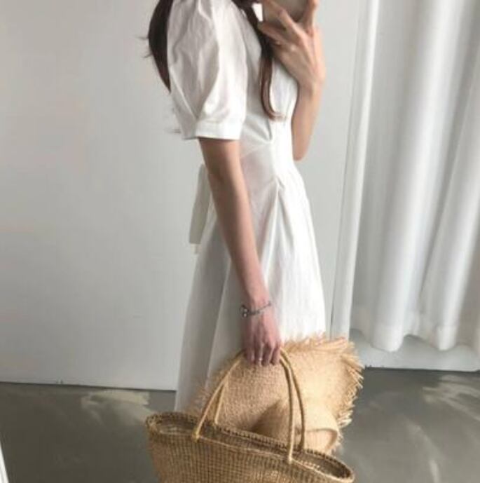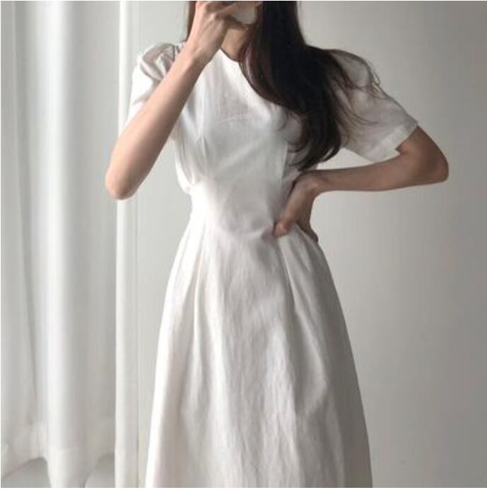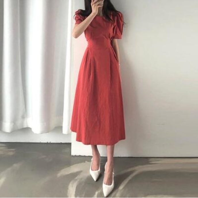 全2色 大きいサイズ XL 体型カバー バックリボン白 ワンピース ロング カジュアル 春 夏 ひざ下丈 ミモレ丈 春夏 秋 おしゃれ レディース きれいめ 可愛い フェミニン ワンピ ドレス 半袖 パフスリーブ ヴィンテージ ウエストリボン お出かけ ホワイト レッド 赤 20代 30代 40代 50代