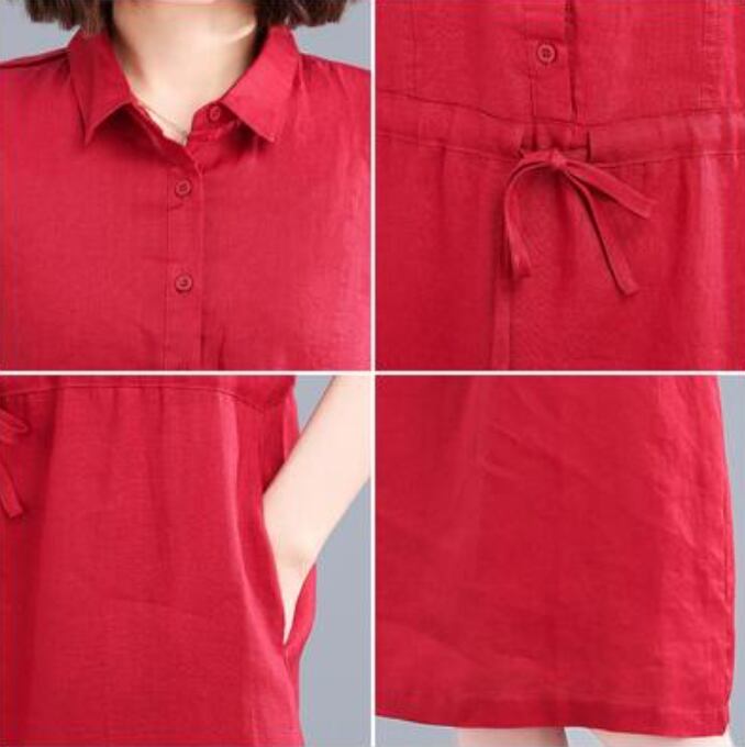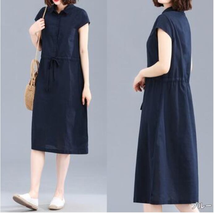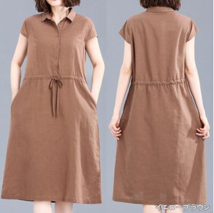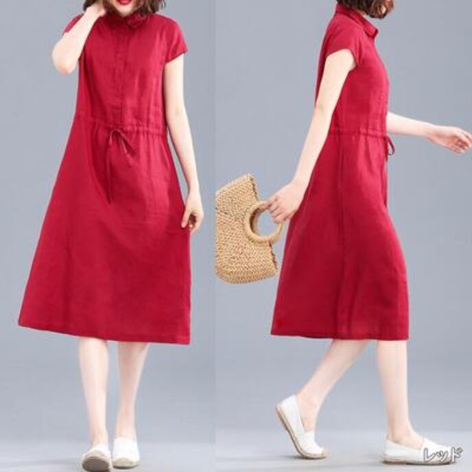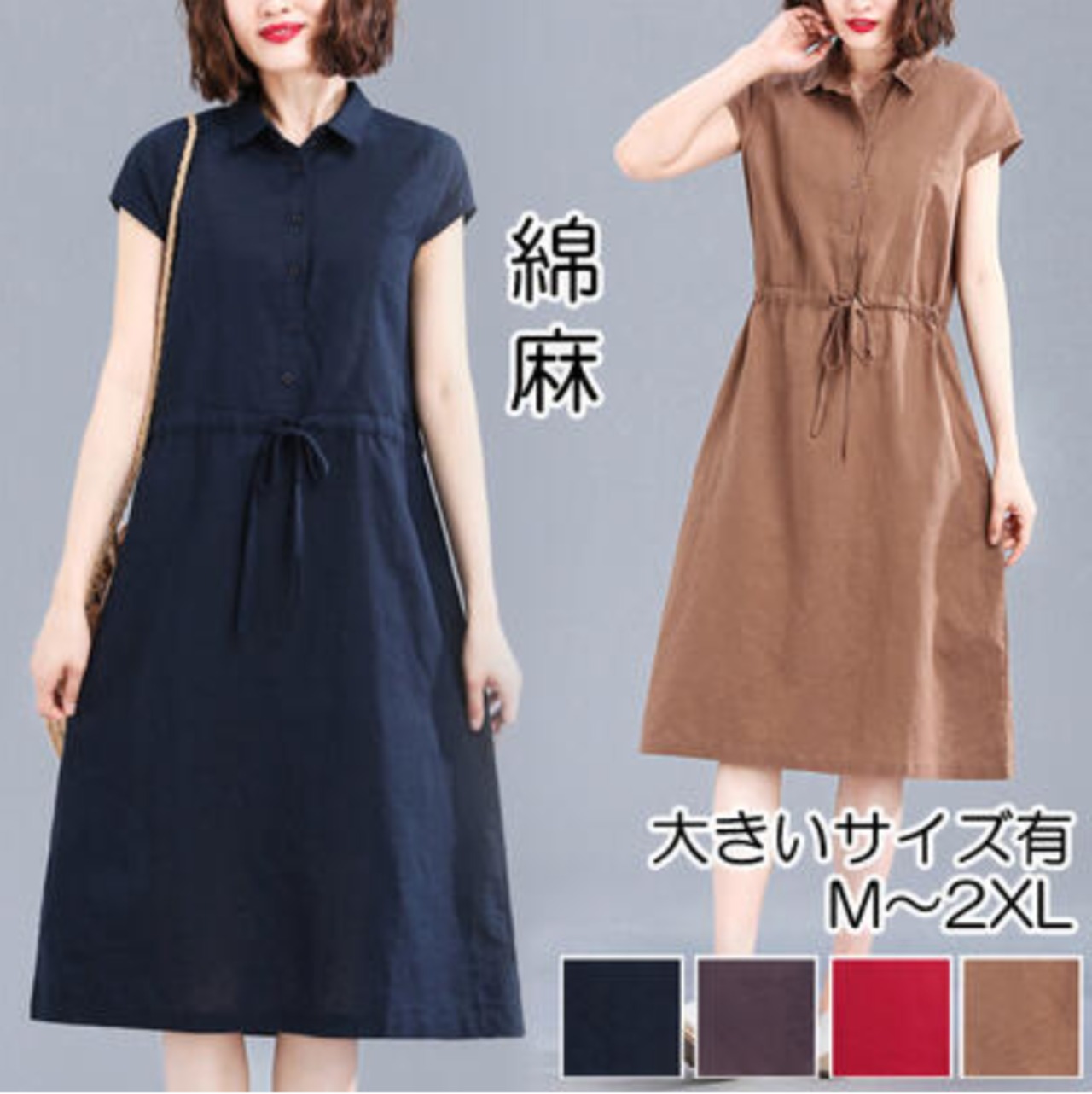 全4色 体型カバー ゆったり リラックスリネン ワンピース ナチュラル 半袖 薄手 涼しい コットン リネン混 綿 麻 春 夏 レディース ワンピ ドレス ウエストリボン カジュアル ハイウエスト カーキ ブラウン レッド ネイビー 大きいサイズ XL 2XL 20代 30代 40代 50代