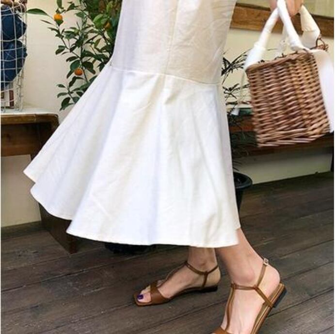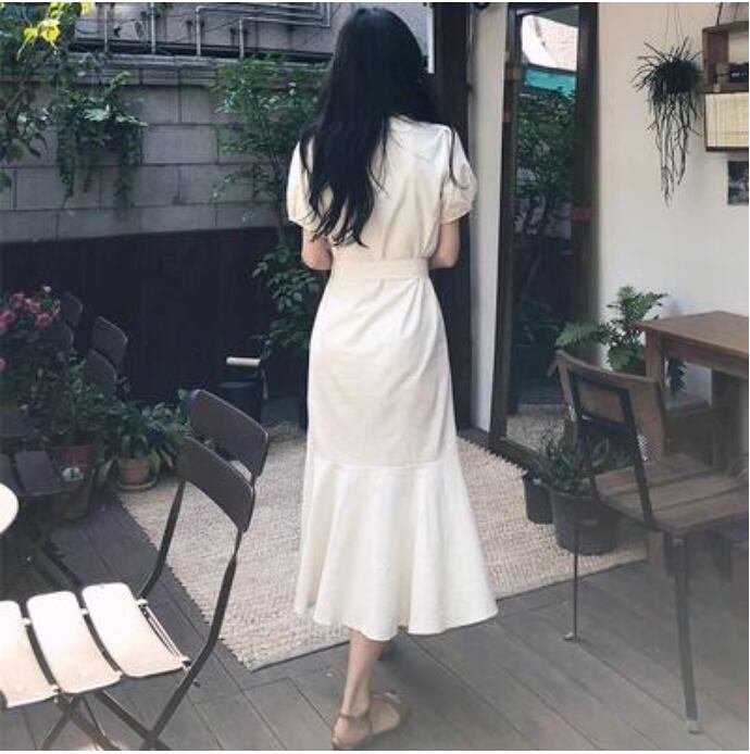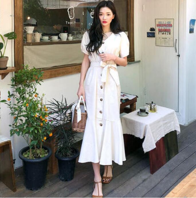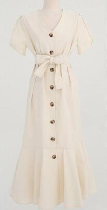 ボリューム袖 マーメイドスカート ワンピリネン ワンピース ナチュラル 半袖 薄手 涼しい コットン カジュアル きれいめ おしゃれ レディース リネン コットン 麻 綿 春 夏 秋 可愛い ドレス ミモレ丈 ティアード ウエストリボン スリム 大きいサイズ XL ホワイト リネン混 20代 30代 40代 50代