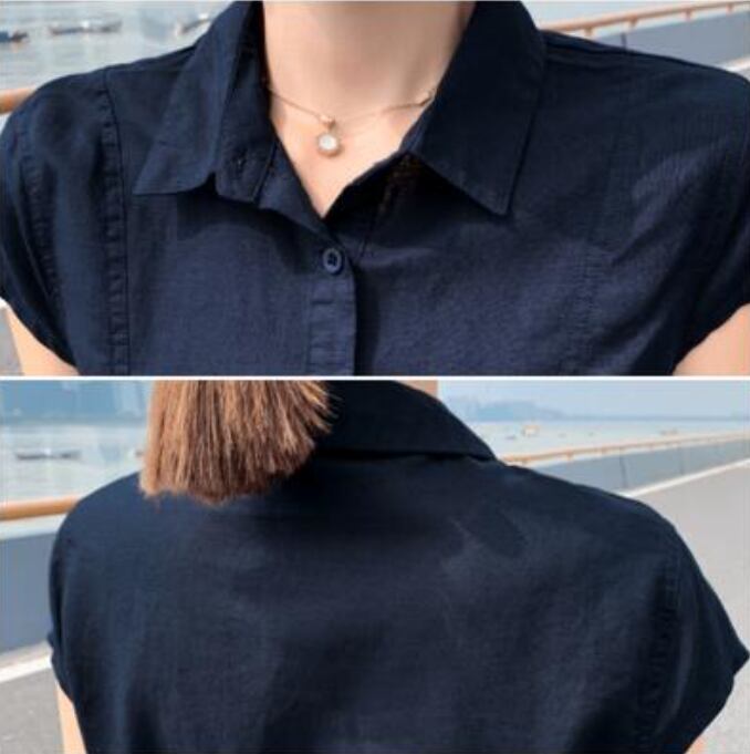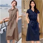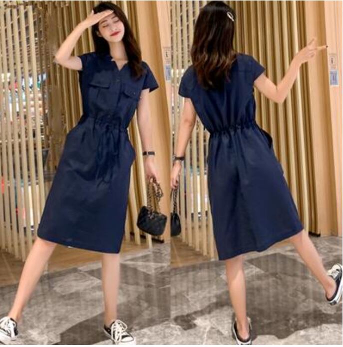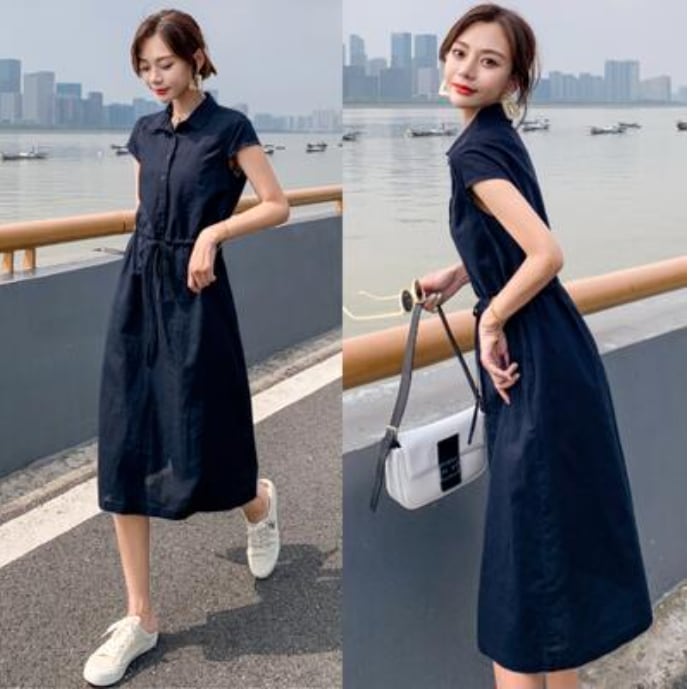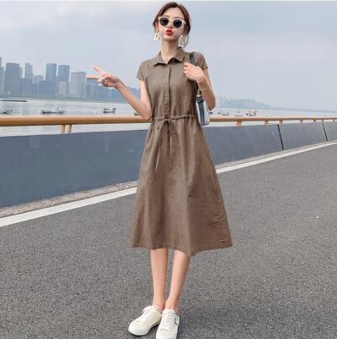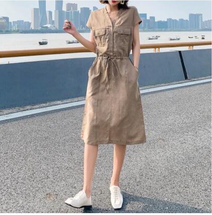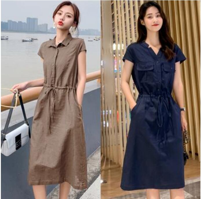 全2種2色 ゆったり 体型カバー ロング ワンピリネン ワンピース ナチュラル 半袖 薄手 涼しい コットン カジュアル きれいめ おしゃれ レディース 麻 綿 春 夏 秋 可愛い ドレス ひざ丈 ハイウエスト シャツワンピ ウエストリボン Vネック Aライン 大きいサイズ XL 2XL カーキ ネイビー リネン混 20代 30代 40代 50代