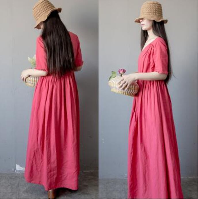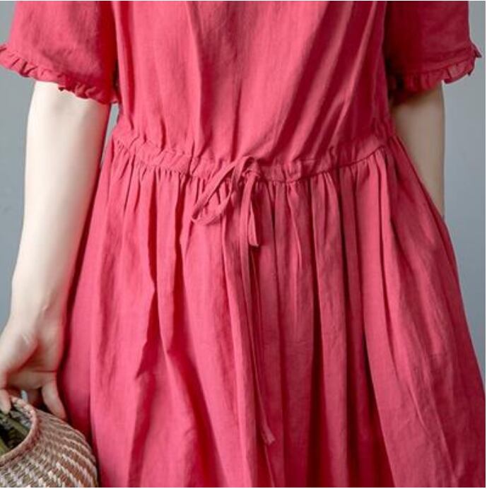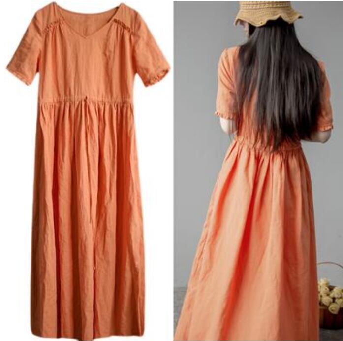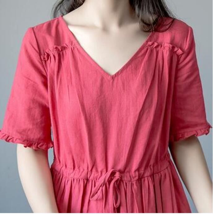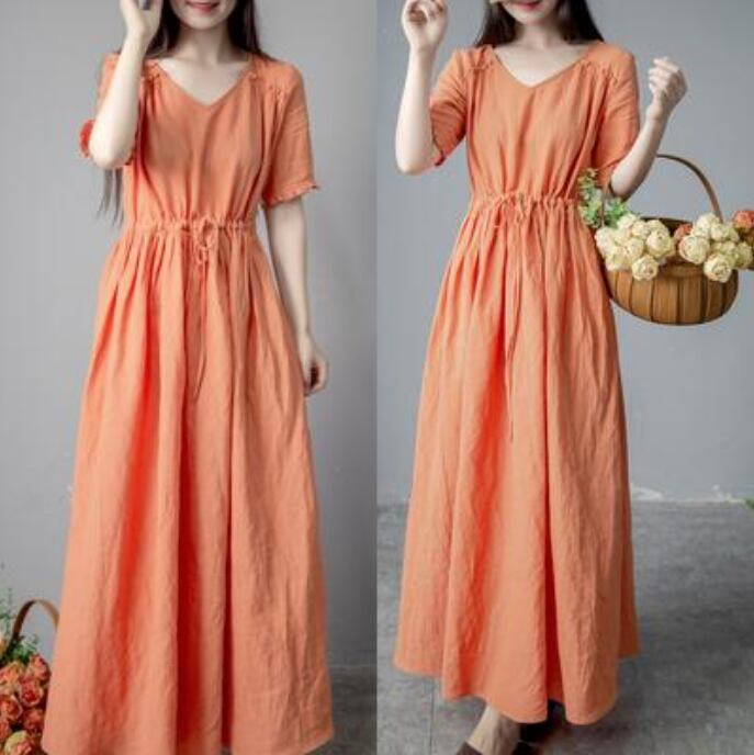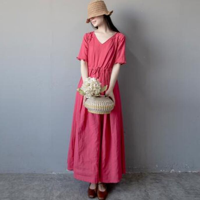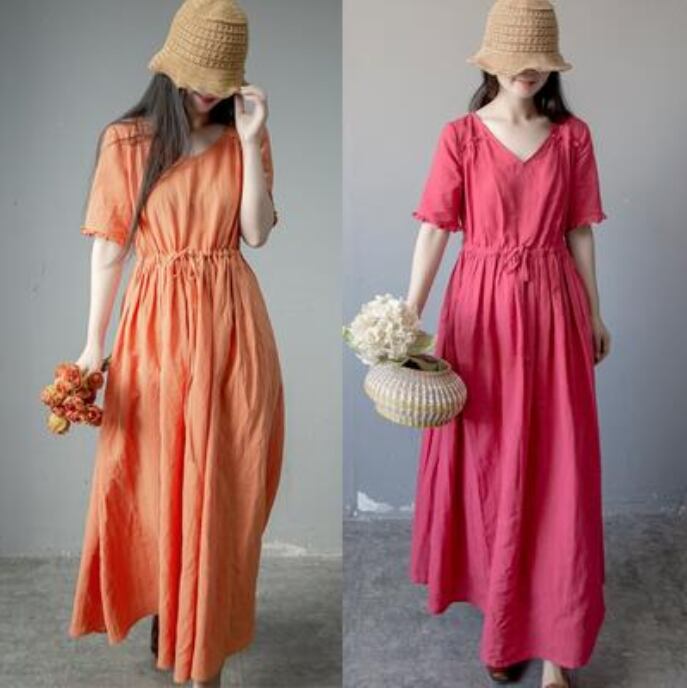 全2色 おしゃれ ゆったり 体型カバー リゾートリネン ワンピース ナチュラル 半袖 薄手 涼しい コットン カジュアル レディース 麻 綿 春 夏 秋 可愛い ワンピ ドレス ロング丈 マキシ丈 フリル Vネック ナチュラル ウエストリボン フェミニン シンプル 大きいサイズ XL オレンジ 赤 リネン混 20代 30代 40代 50代