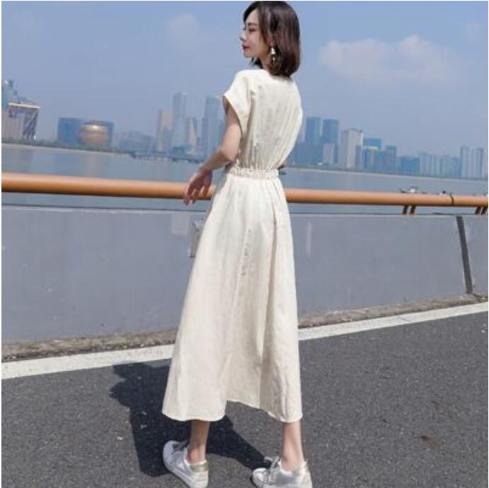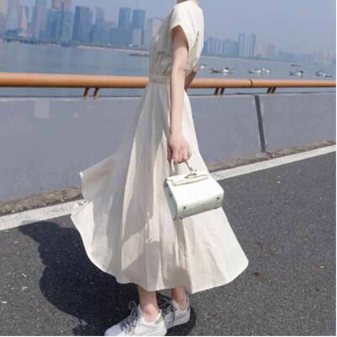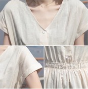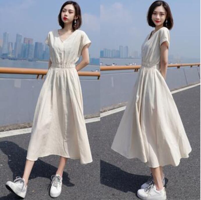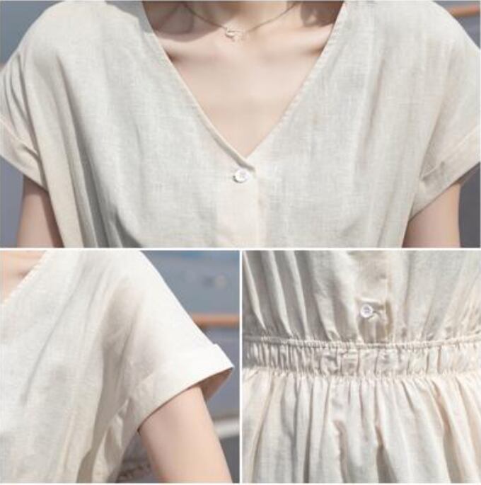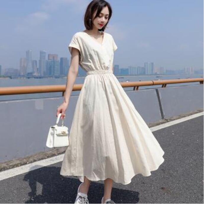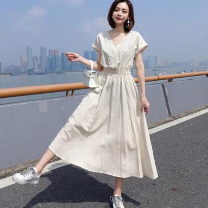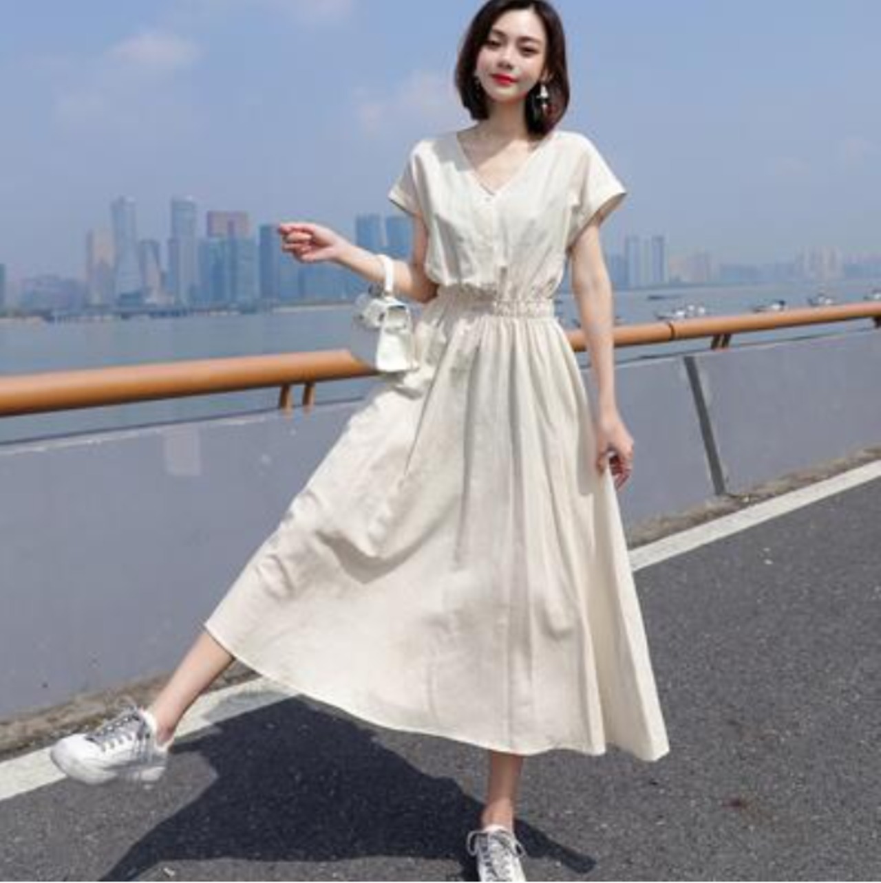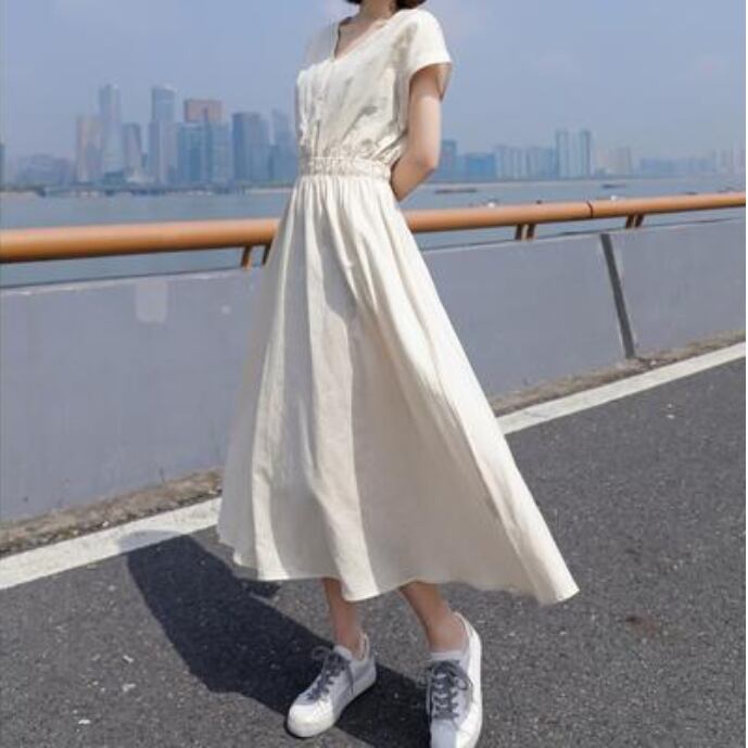 シンプル ロング丈 おしゃれ ワンピリネン ワンピース ナチュラル 半袖 薄手 涼しい コットン エレガント きれいめ レディース 麻 綿 春 夏 秋 可愛い ドレス ミモレ丈 Vネック Aライン フェミニン ウエストゴム 大きいサイズ XL ホワイト リネン混 20代 30代 40代 50代
