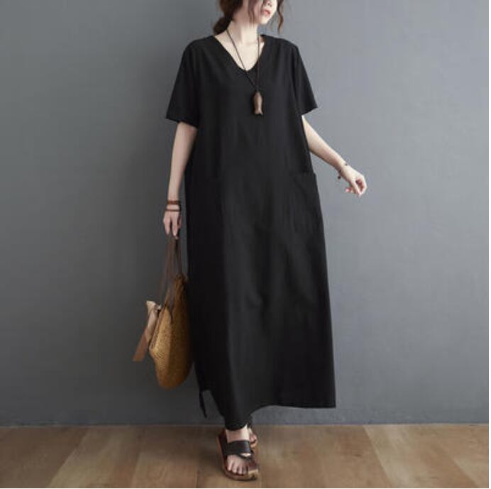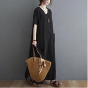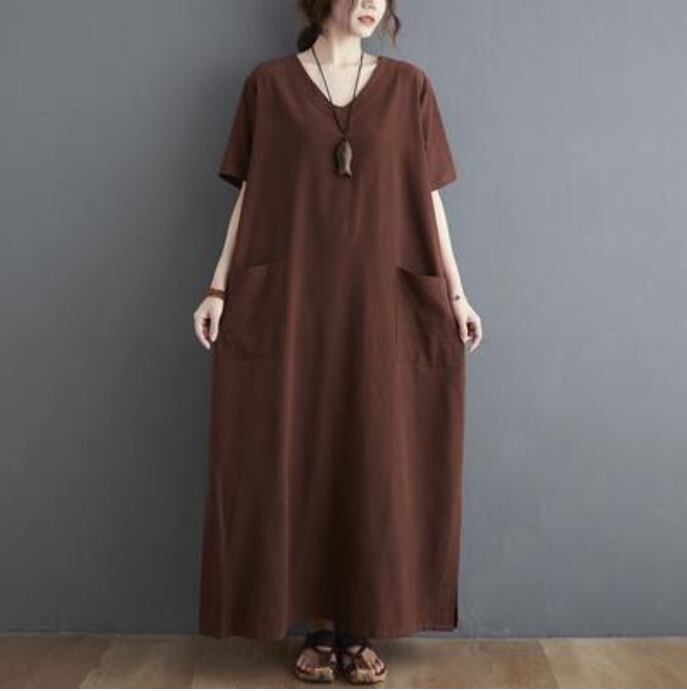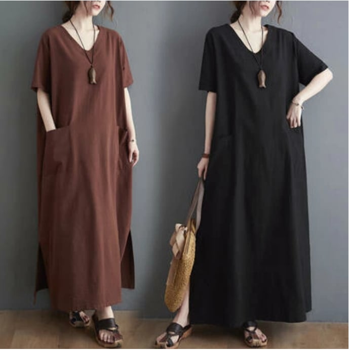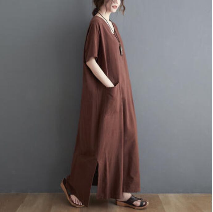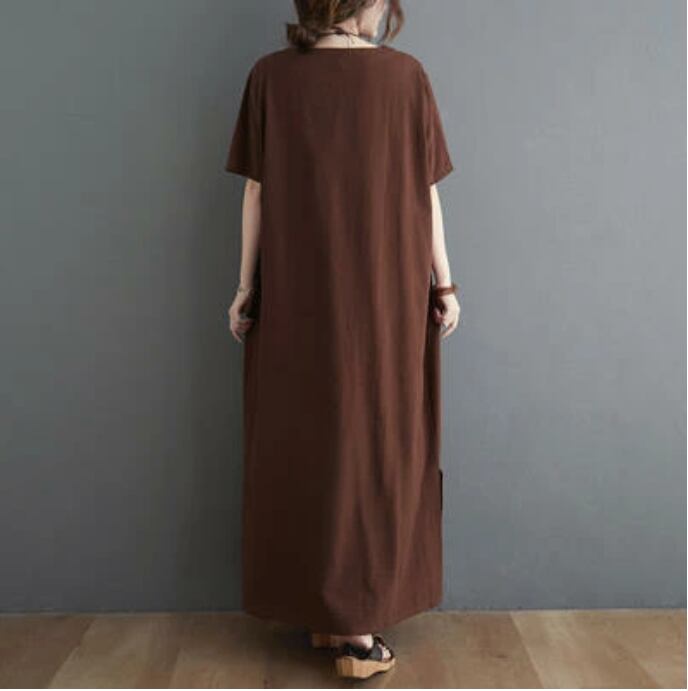 全2色 ロング丈 体型カバー ワンピリネン ワンピース ナチュラル 半袖 薄手 涼しい コットン カジュアル おしゃれ レディース 麻 綿 春 夏 秋 可愛い かっこいい ドレス ビッグシルエット マキシ丈 ゆったり リラックス フェミニン 大きいサイズ ブラウン ブラック 黒 リネン混 20代 30代 40代 50代
