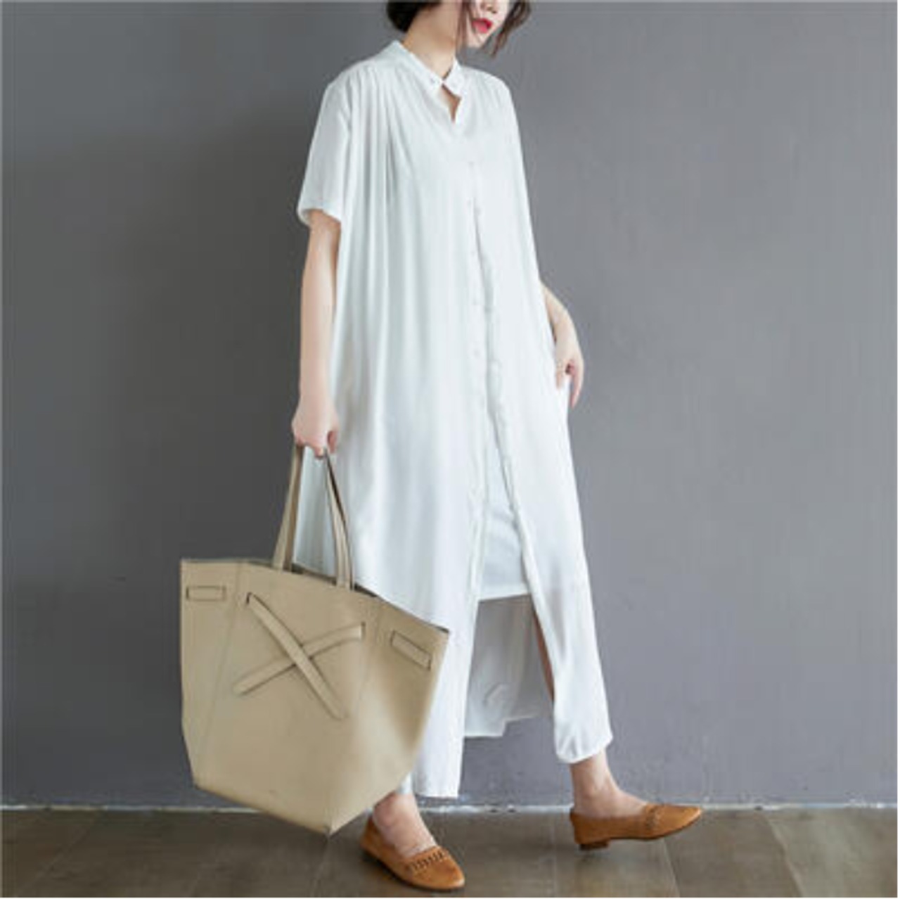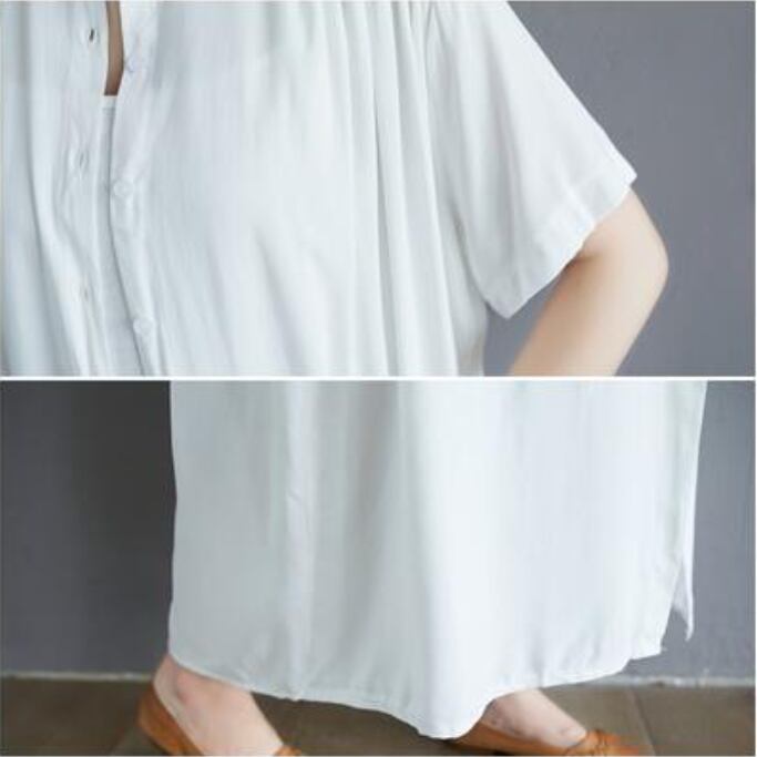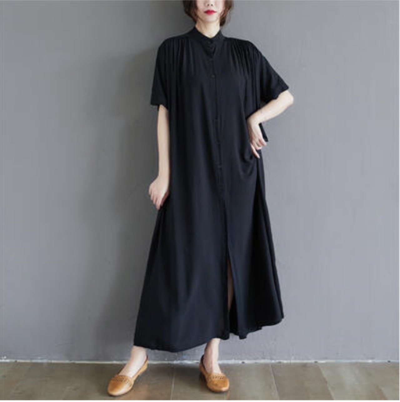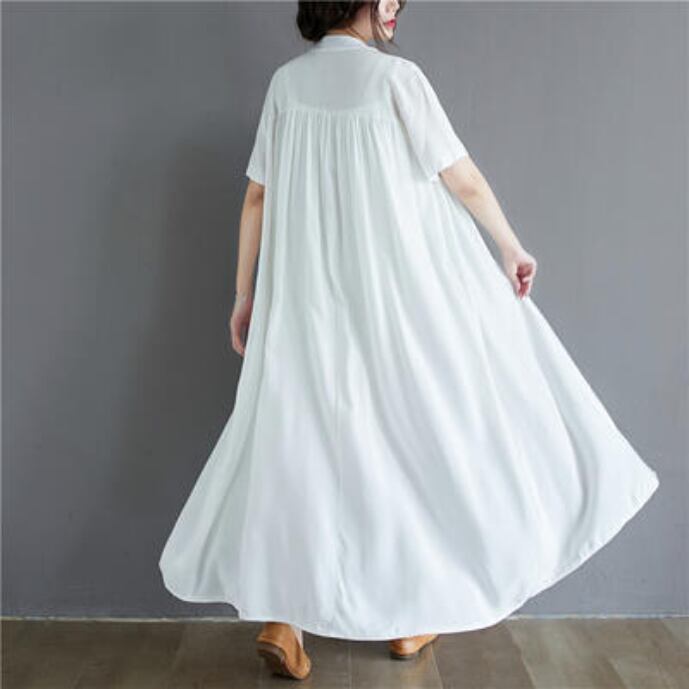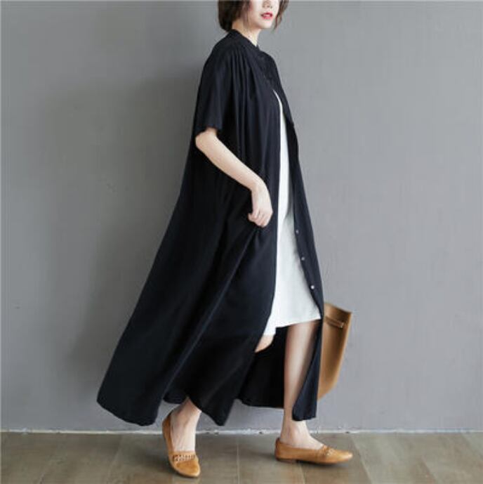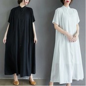 全2色 涼しい かっこいい アウター シャツワンピースワンピース ロング カジュアル 春 夏 半袖 おしゃれ レディース 大きいサイズ 秋 可愛い ノーカラー ロング丈 ワンピ ドレス マキシ丈 バンドカラー ティアード ゆったり ブラック ホワイト 白 コットン 綿 20代 30代 40代 50代