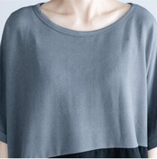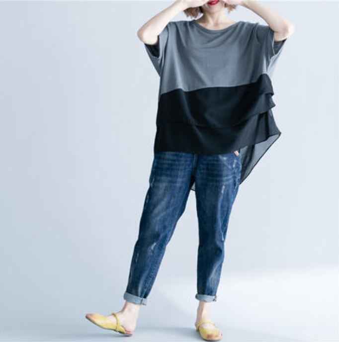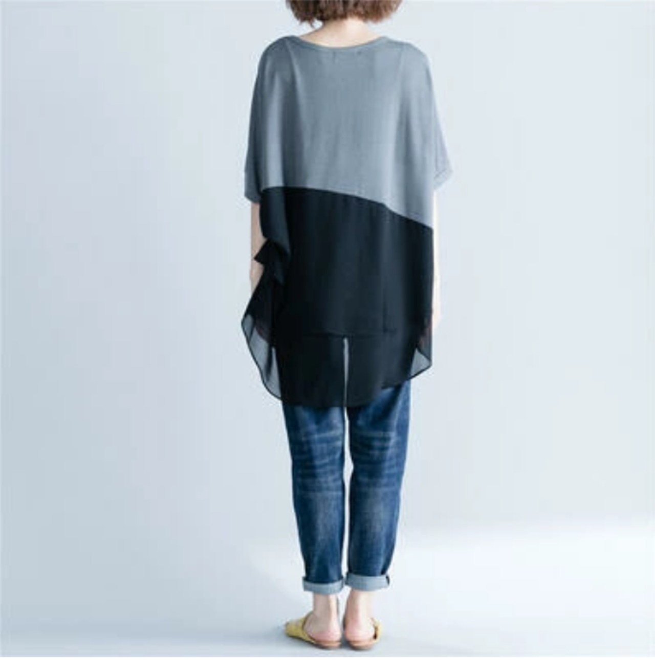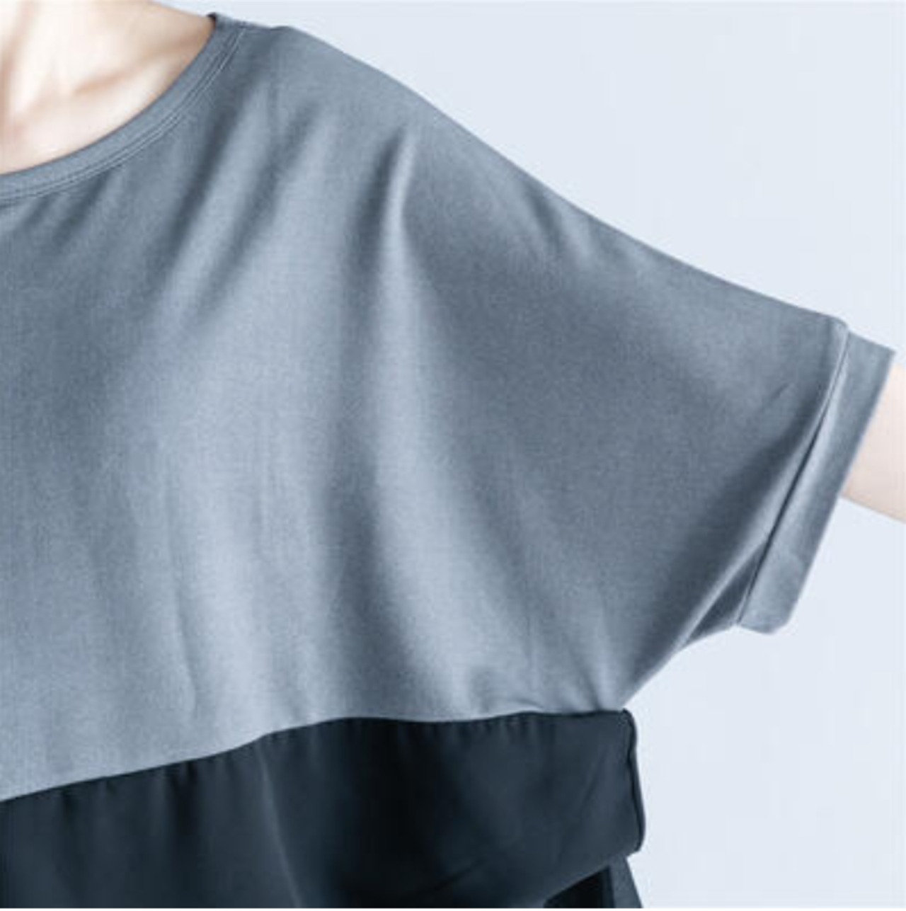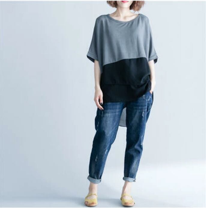 かっこいい バイカラー 部分 シアートップス レディース シャツ きれいめ カジュアル 袖あり 春 夏 春夏 秋 Tシャツ おしゃれ シフォン ドルマンスリーブ 半袖 こなれ感 抜け感 体型カバー お尻カバー フェミニン ゆったり ビッグシルエット グレー ブラック 黒 20代 30代 40代 50代
