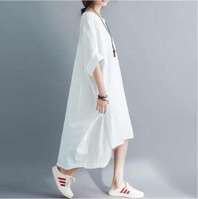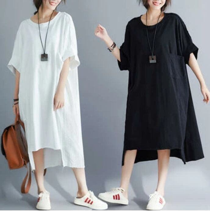 全2色 リネン ワンピース ナチュラル 半袖 薄手 涼しい コットン リネン混 綿 麻 体型カバー ゆったり リラックス 春 夏 春夏 ひざ丈 カジュアル おしゃれ レディース ワンピ ドレス ミモレ丈 シンプル 大きいサイズ XL ホワイト 白 ブラック 黒 20代 30代 40代 50代