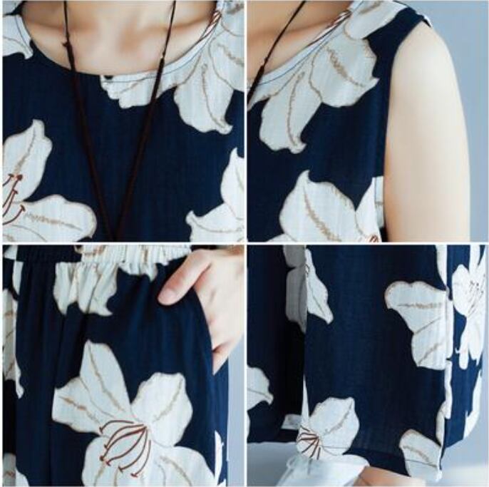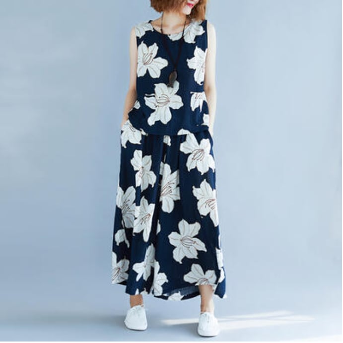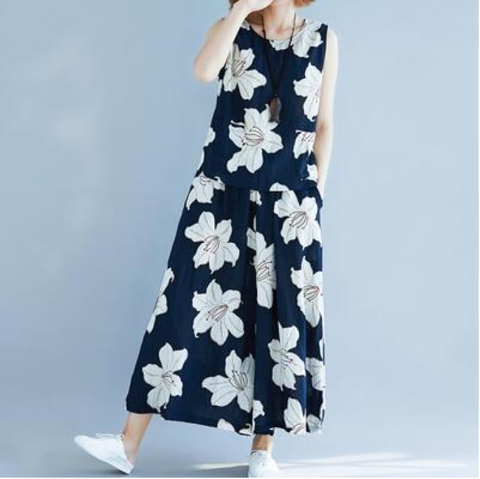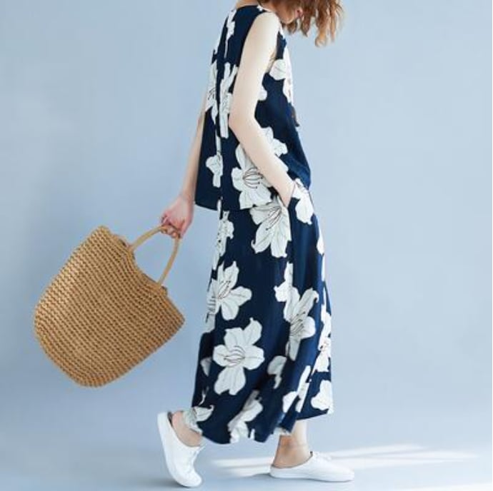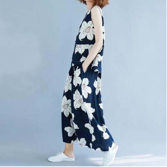 リネン セットアップ 2点セット レディース カジュアル おしゃれ 春 夏 パンツセット ロング丈 ワイドパンツ ナチュラル ノースリーブ 花柄 ウエストゴム 薄手 涼しい コットン リネン混 綿 麻 リラックス リゾート 春夏 体型カバー ネイビー 20代 30代 40代 50代