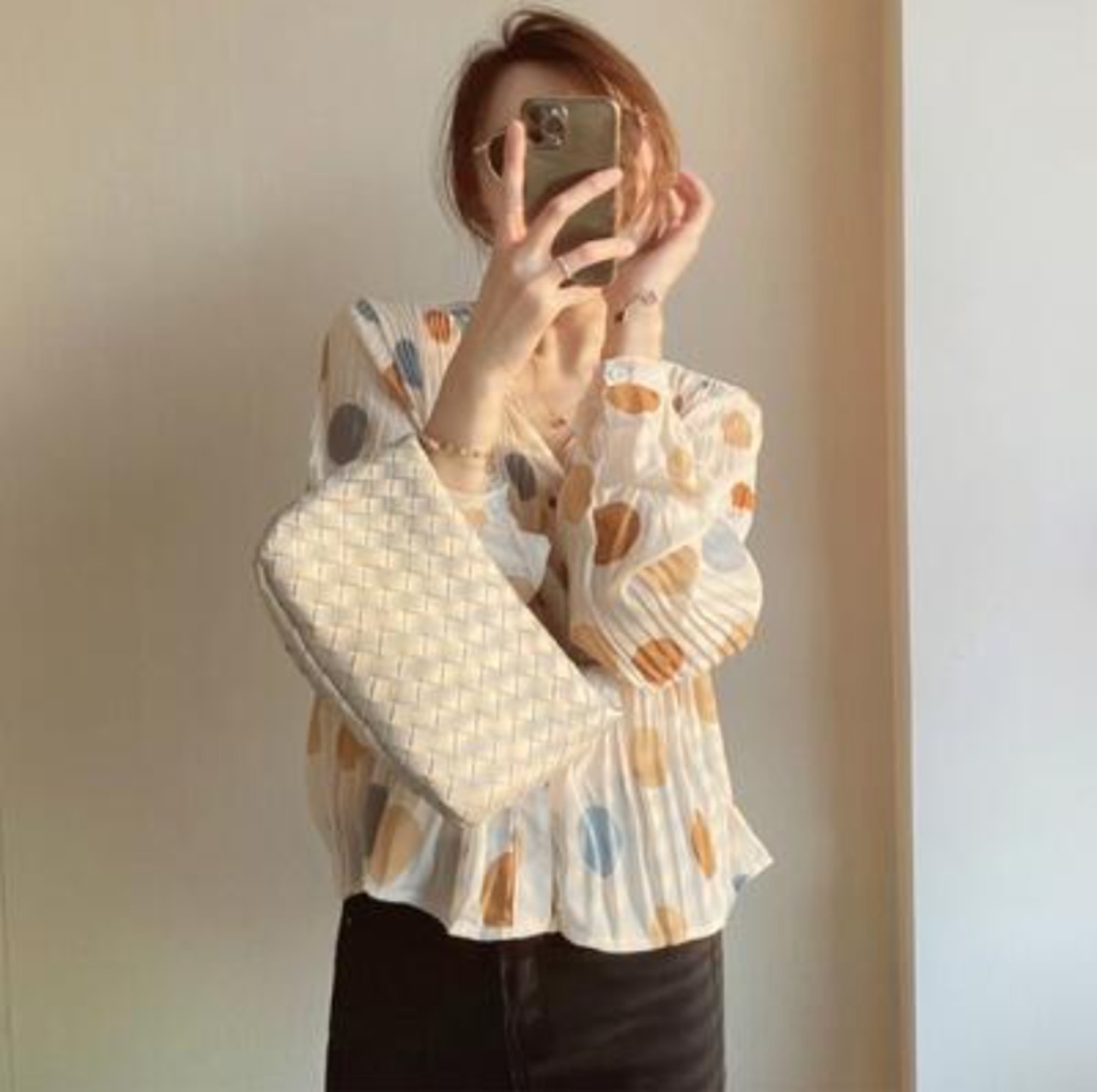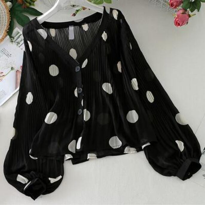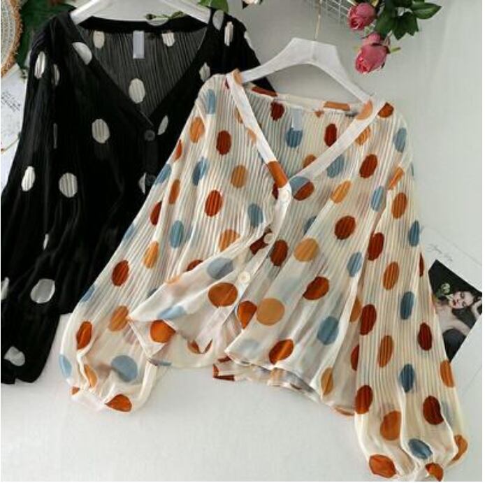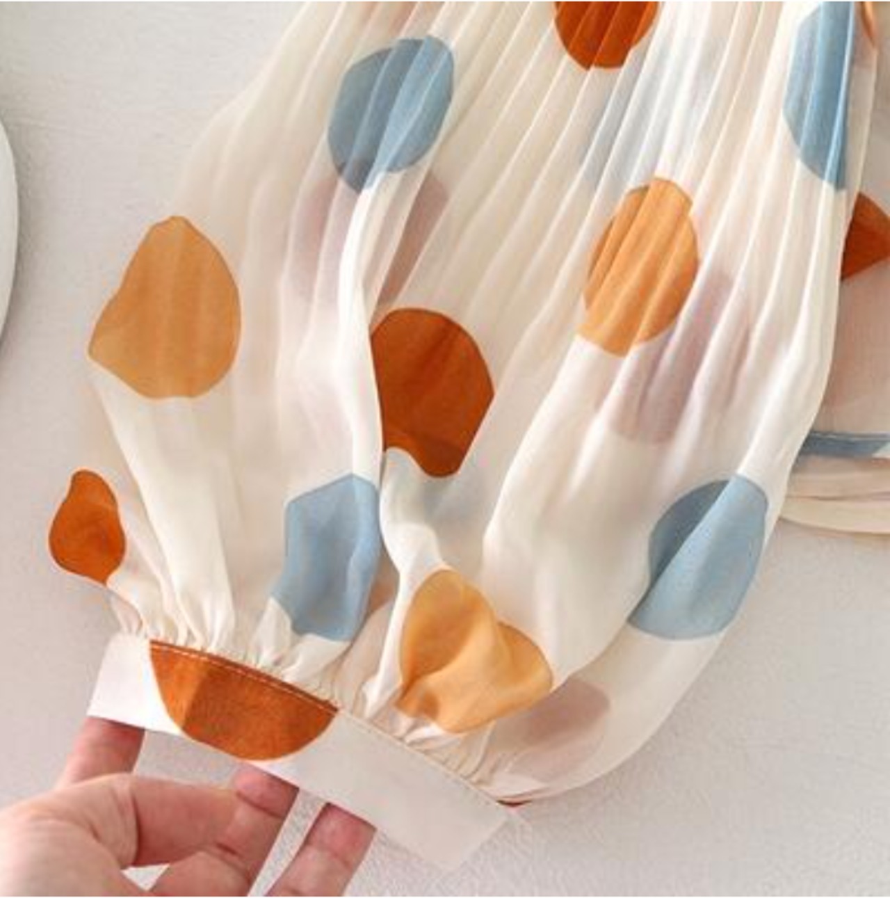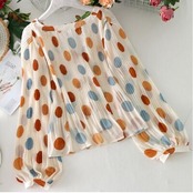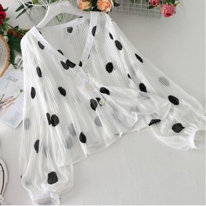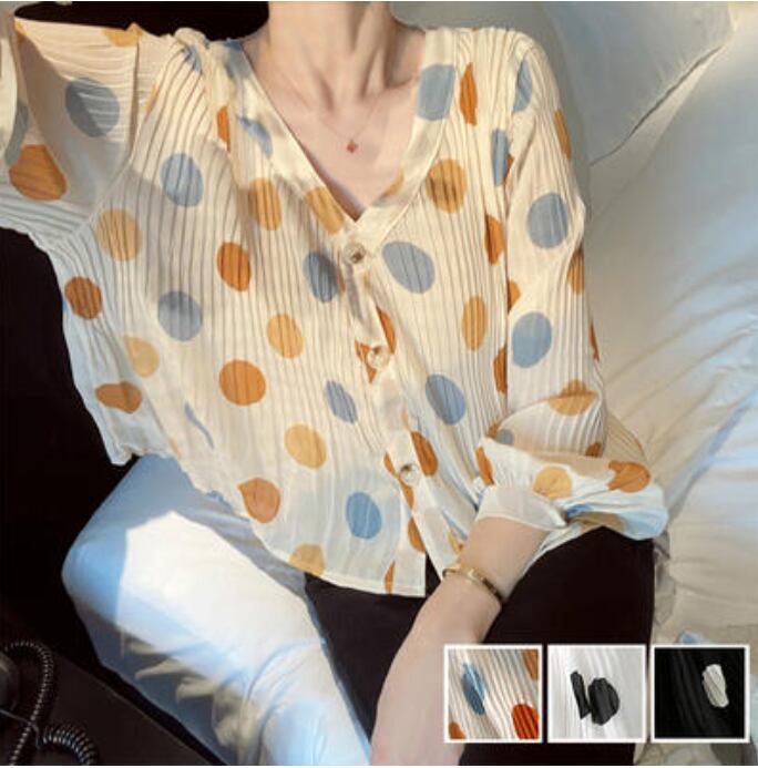 全3色 水玉 透け感 ブラウス フェミニン シャツ トップス レディース シャツ きれいめ カジュアル ブラウス かわいい シフォン プリーツ 長袖 エレガント ドット 体型カバー 二の腕カバー お腹カバー シアー パフスリーブ ベージュ ブラック 黒 ホワイト 白 春 夏 秋 20代 30代 40代 50代