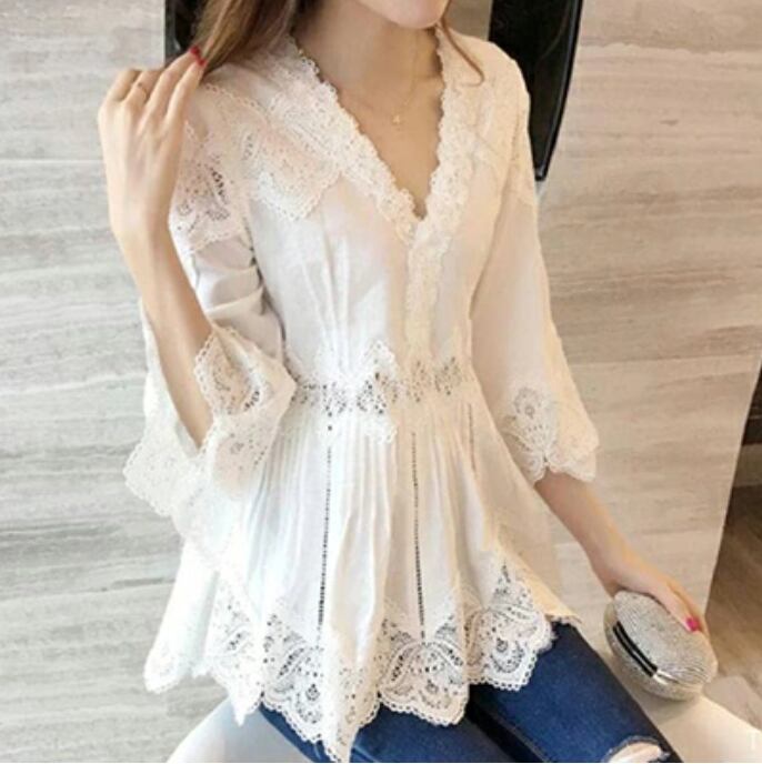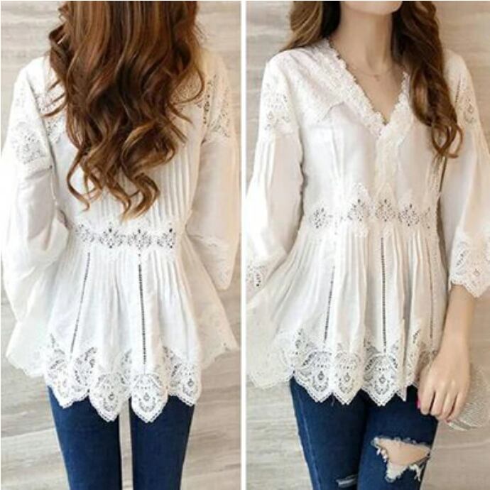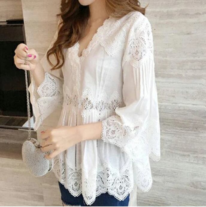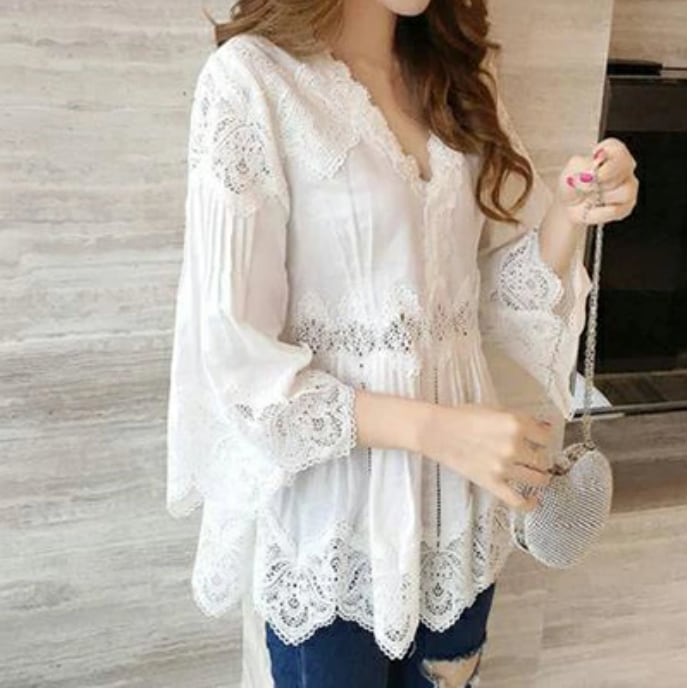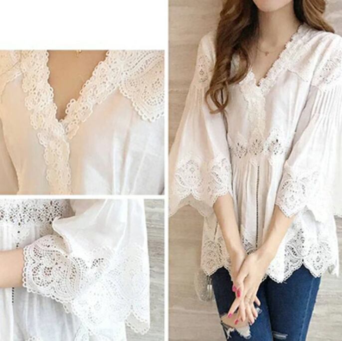 大きいサイズ XL 2XL トップス レディース きれいめ 袖あり レース コットン ホワイト シャツ 白 ブラウス 綿 おしゃれ ルーズプル オーバーサイズ 涼しげ カジュアル カットソー 七分袖 ゆったり 体型カバー 二の腕カバー ラウンドネック 春 春夏 春秋 夏 20代 30代 40代 50代