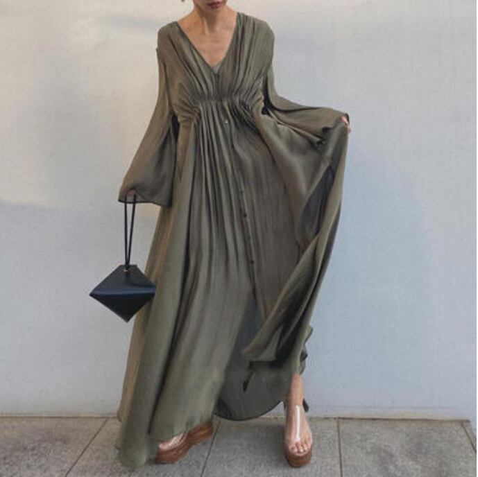 ワンピース ロング丈 マキシ丈 エレガント カジュアル おしゃれ 夏 長袖 レディース 可愛い ワンピ ドレス フレアスリーブ 薄手 涼しい Aライン フェミニン とろみ感 ナチュラル ゆったり 体型カバー Vネック グリーン 春夏 秋 20代 30代 40代 50代