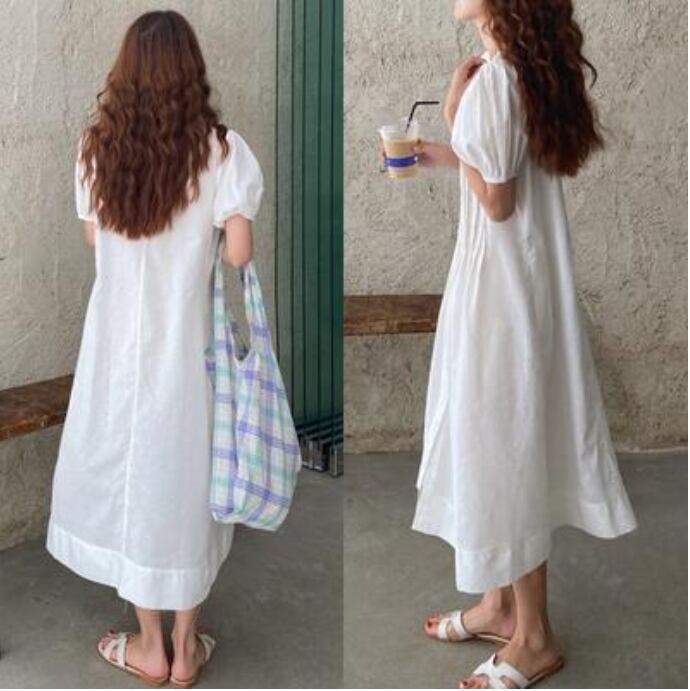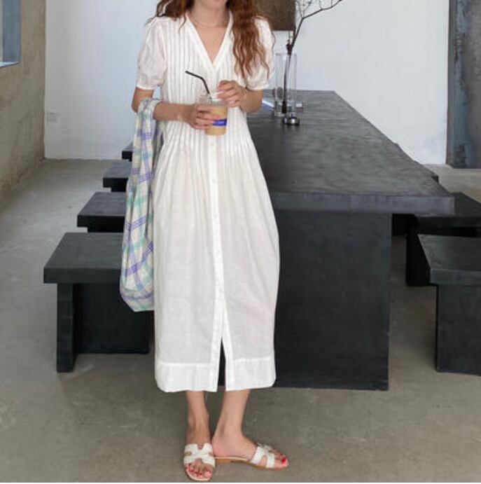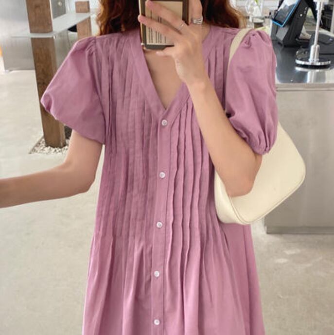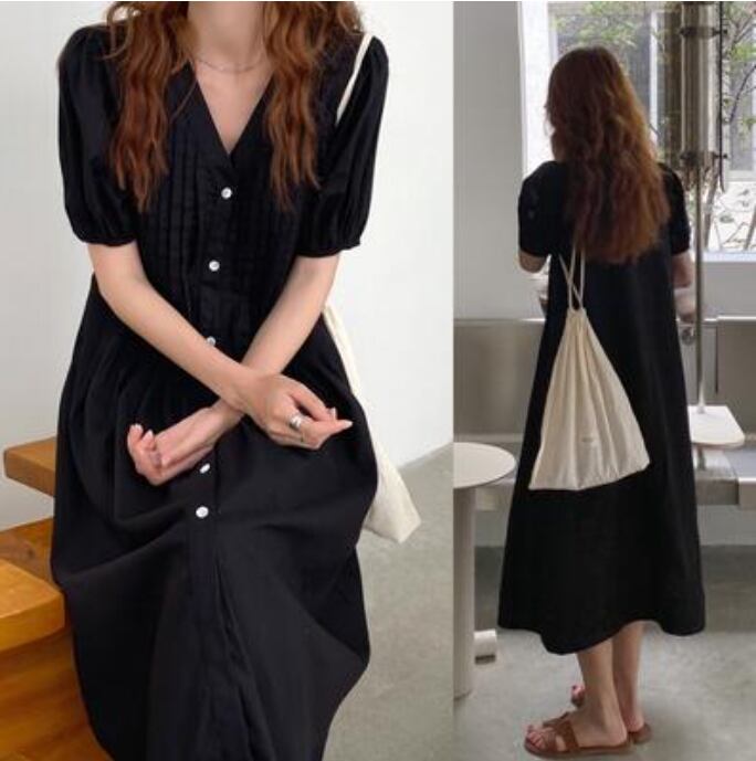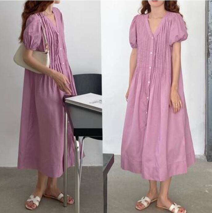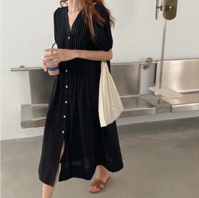 全3色 ワンピース ロング丈 ミモレ丈 カジュアル おしゃれ 夏 長袖 レディース 可愛い ワンピ ドレス パフスリーブ 薄手 涼しい Aライン フェミニン プリーツ ナチュラル シンプル ゆったり 体型カバー Vネック ホワイト 白 ブラック 黒 ピンク 春夏 秋 20代 30代 40代 50代