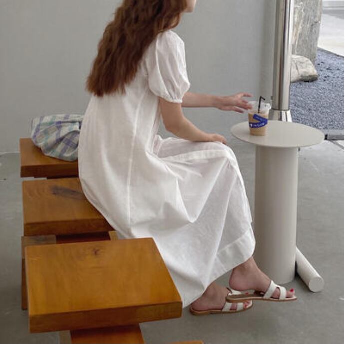トレンドのパフスリーブがポイントのミモレ丈ワンピースです。