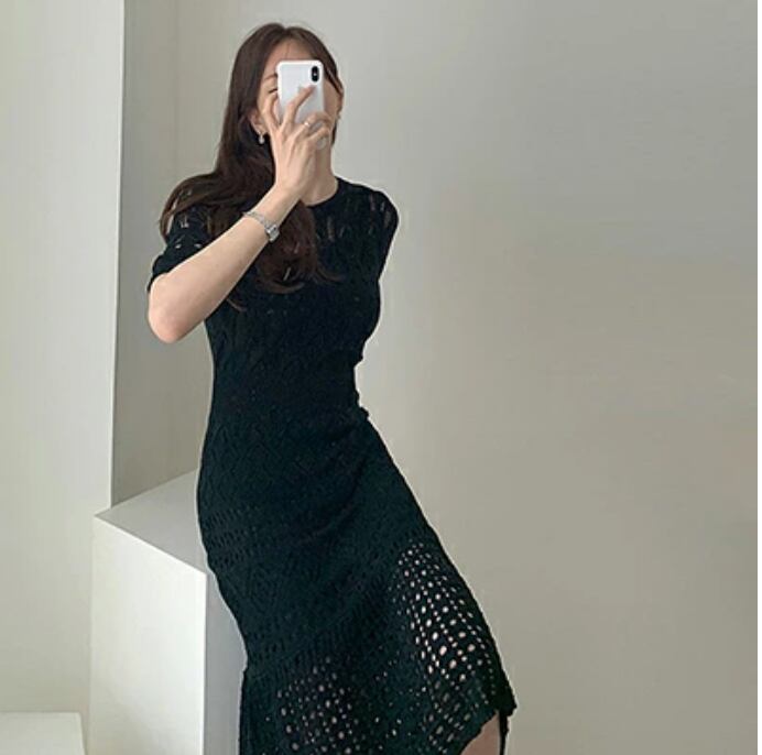全4色 ニット ワンピース レース 薄手 涼しい 半袖 コットン 綿 ひざ丈 ミモレ丈 ワンピ ドレス おしゃれ レディース 可愛い きれいめ 春 夏 春夏 ホワイト ブラック ブルー ネイビー 紺 白 黒 20代 30代 40代 50代