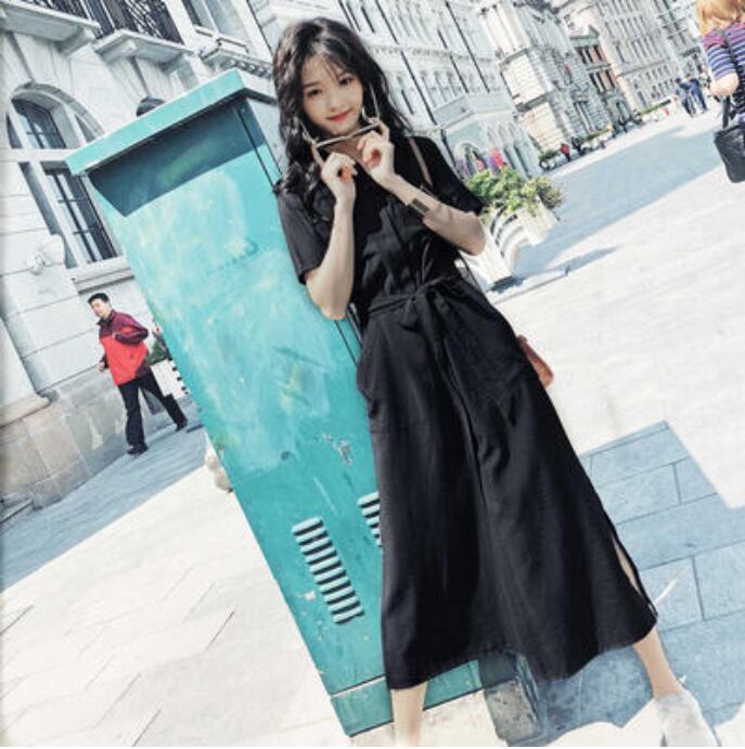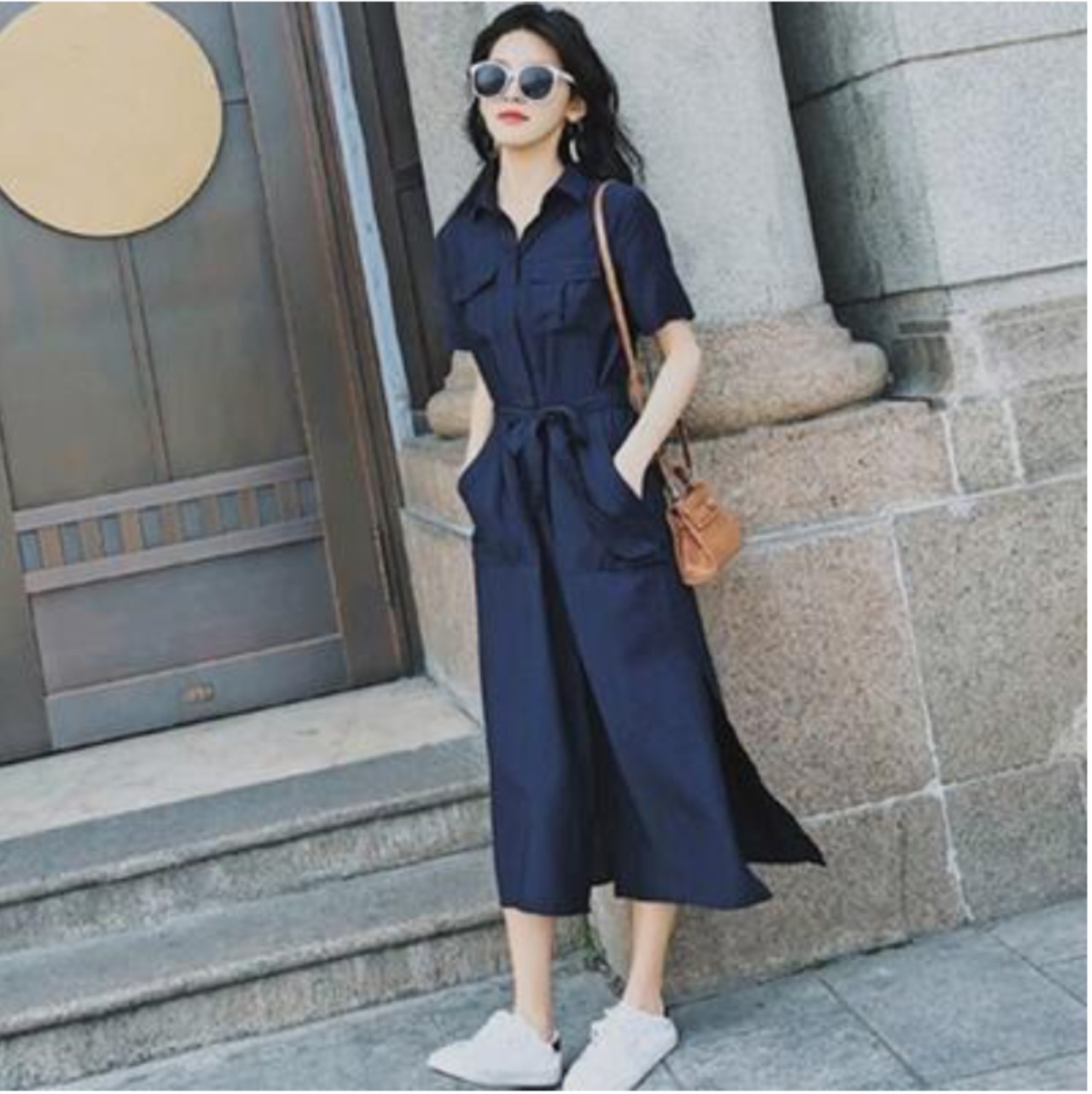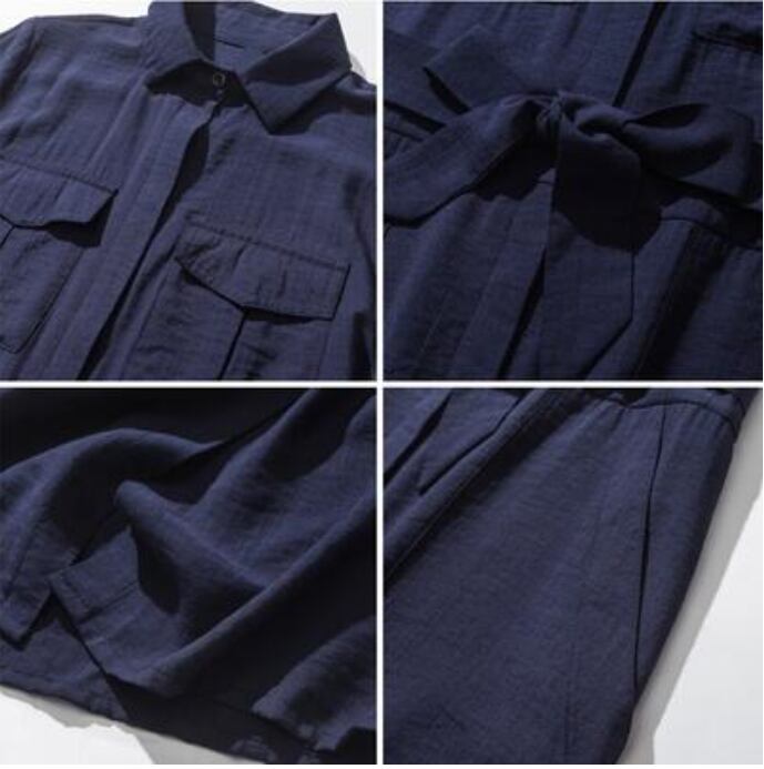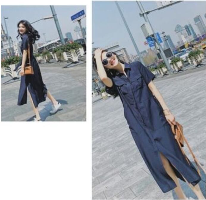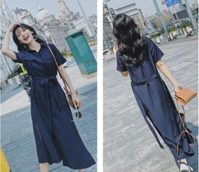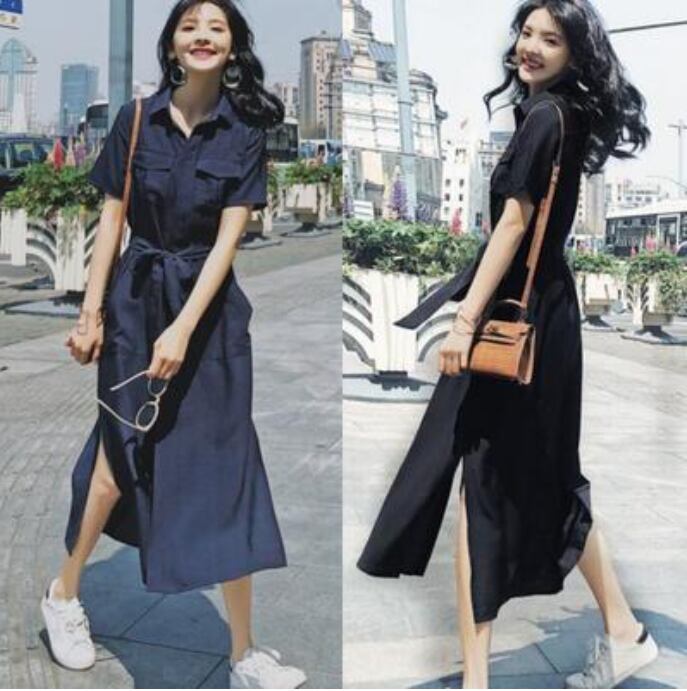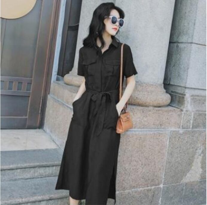 全2色 ワンピース ミモレ丈 カジュアル おしゃれ 夏 半袖 レディース 可愛い ワンピ ドレス シャツワンピ 薄手 涼しい Aライン フェミニン ウエストリボン きれいめ スリット 体型カバー ハイウエスト 大きいサイズ 通勤 春夏 秋 ブルー 青 ブラック 黒 20代 30代 40代 50代