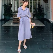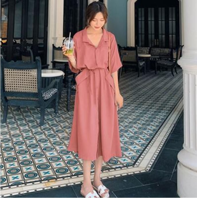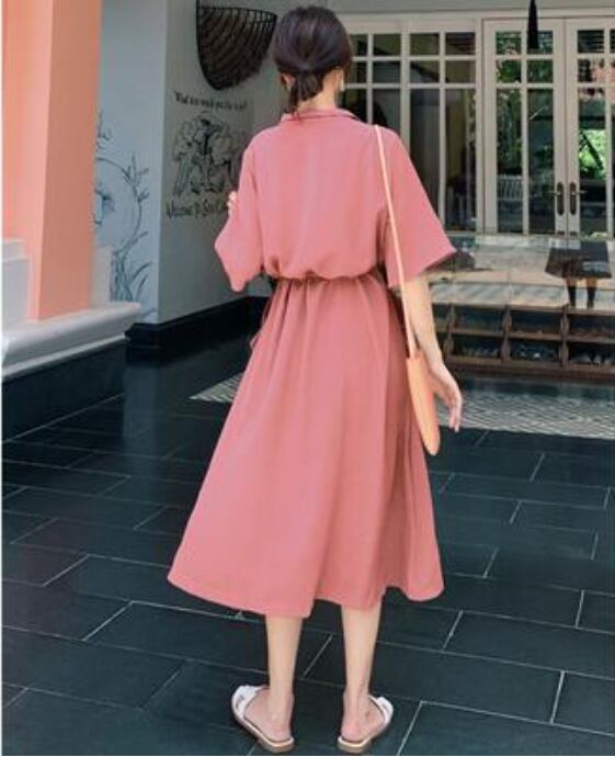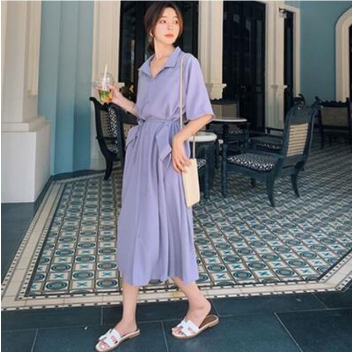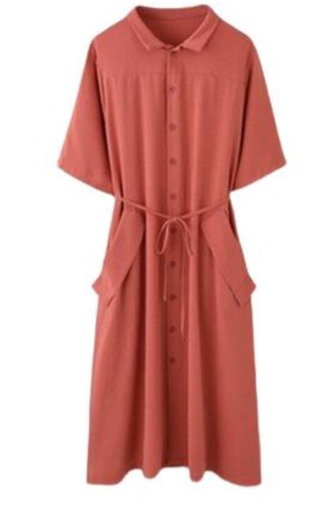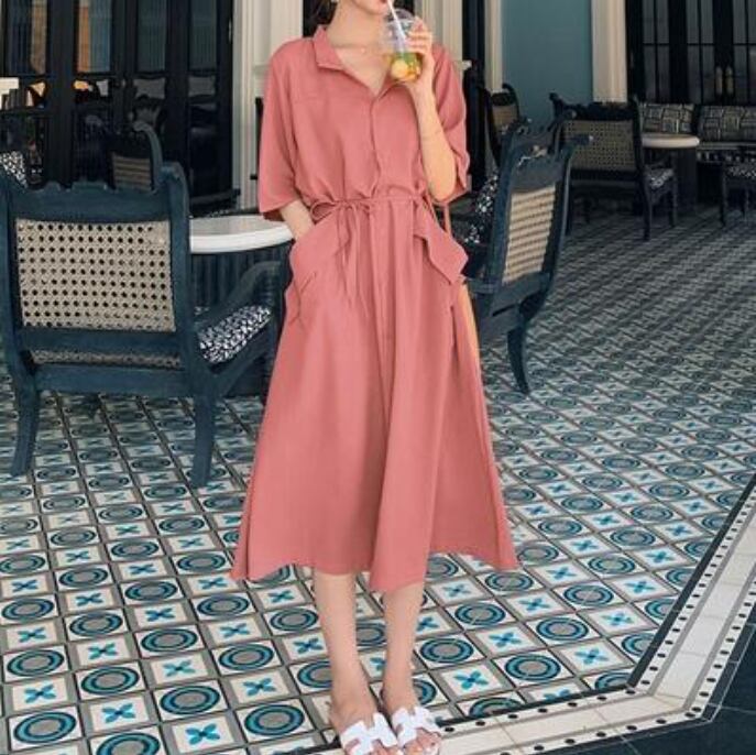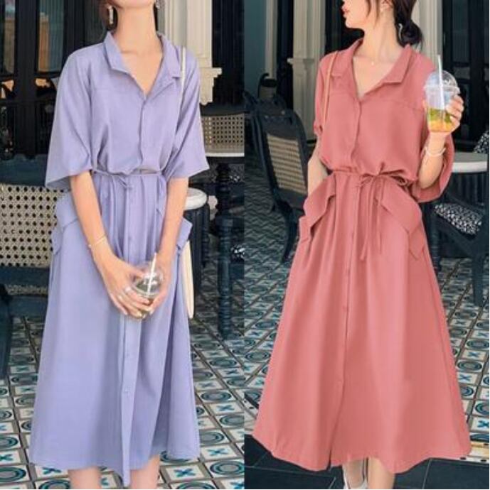 全2色 ワンピース ミモレ丈 カジュアル おしゃれ 夏 半袖 レディース 可愛い ワンピ ドレス シャツワンピ 薄手 涼しい Aライン フェミニン ウエストリボン きれいめ 体型カバー ハイウエスト 大きいサイズ 通勤 春夏 秋 ブルー 青 レッド 赤 20代 30代 40代 50代
