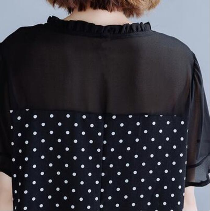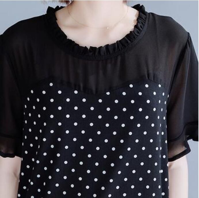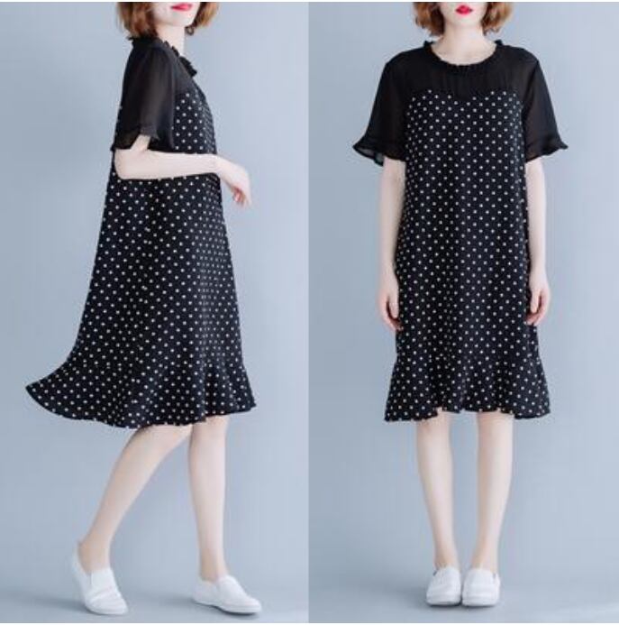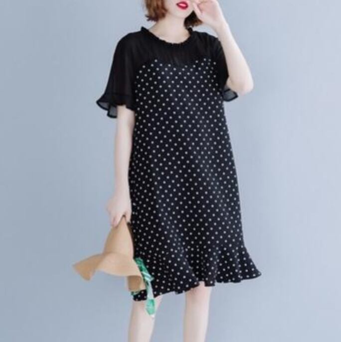 ドット 透け感 フェミニン フリル シフォン ワンピース ひざ丈 きれいめ カジュアル おしゃれ 夏 半袖 レディース 可愛い ワンピ ドレス 薄手 涼しい 大きいサイズ 春夏 秋 ナチュラル 切り替え お出かけ 2XL 3XL 4XL ブラック 黒 20代 30代 40代 50代