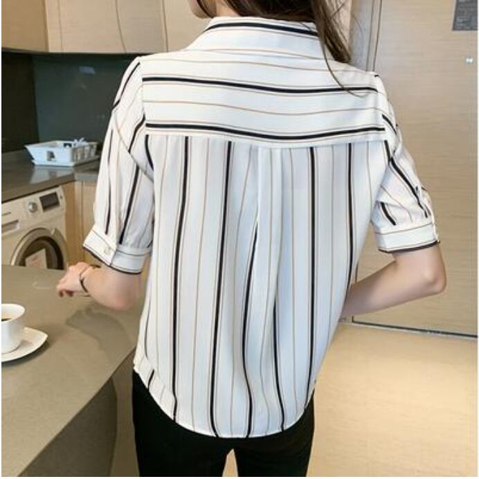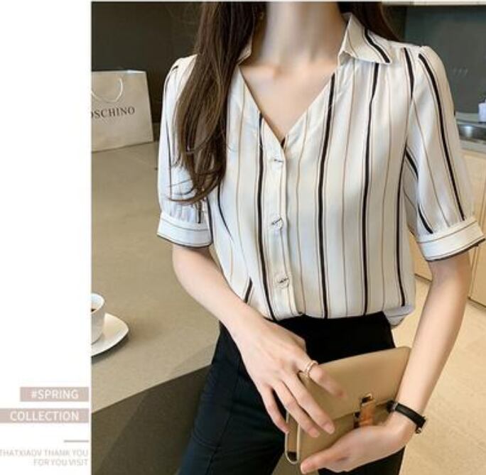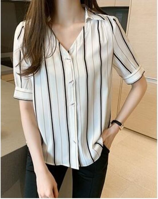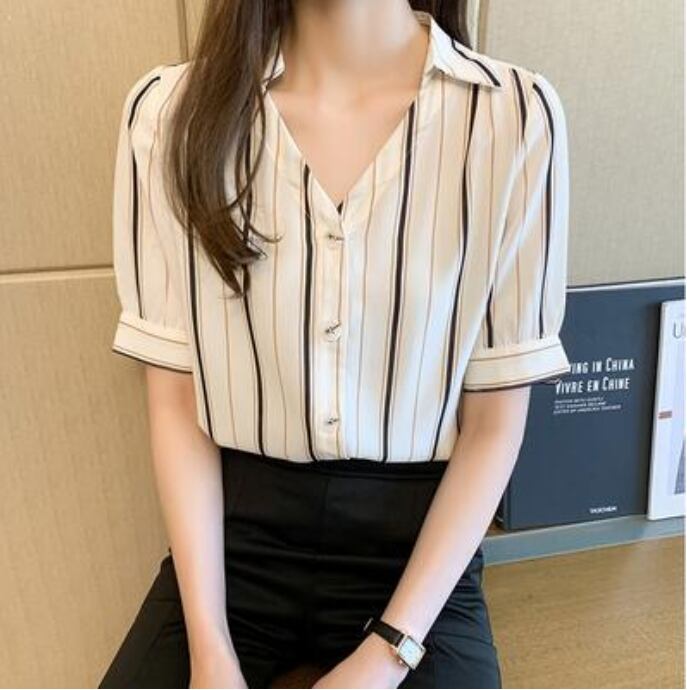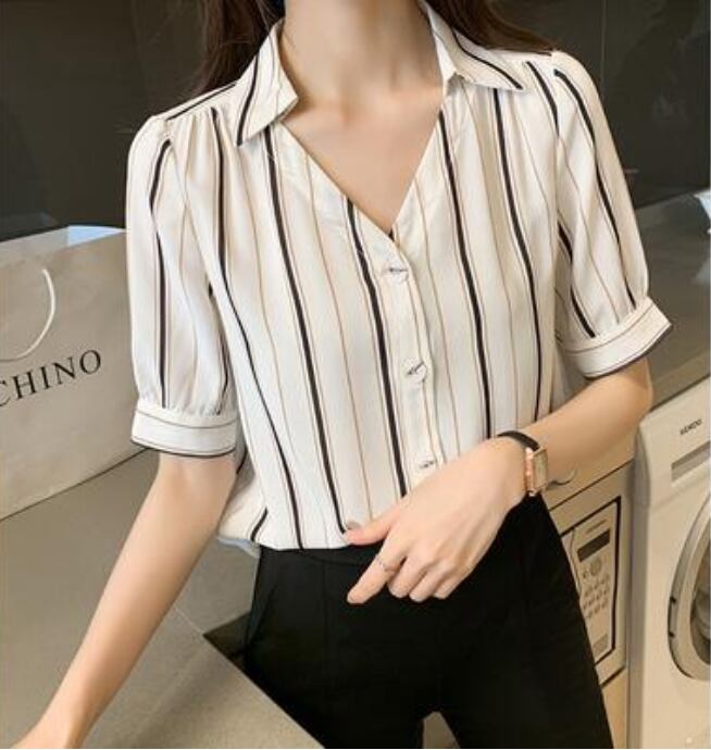トップス レディース ブラウス きれいめ カジュアル おしゃれ 夏 春夏 春秋 かっこいい 半袖 エレガント シフォン シャツ ストライプ 開襟 Vネック 涼しい フェミニン パフスリーブ 大きいサイズ オフィス ホワイト 白 20代 30代 40代 50代