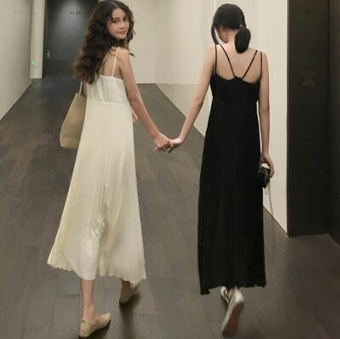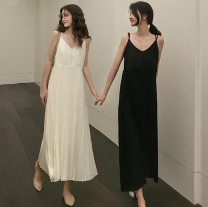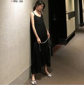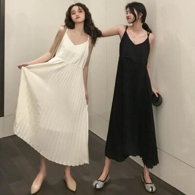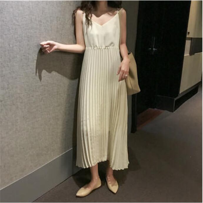 全2色 ワンピース ミモレ丈 プリーツ カジュアル おしゃれ 夏 ノースリーブ キャミワンピース レディース 可愛い ワンピ ドレス ロングワンピ きれいめ フェミニン ハイウエスト 春 春夏 秋 シンプル お出かけ 大きいサイズ ブラック 黒 ベージュ 20代 30代 40代 50代