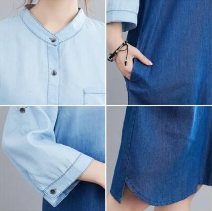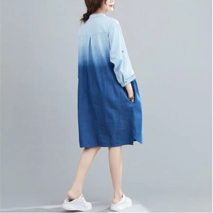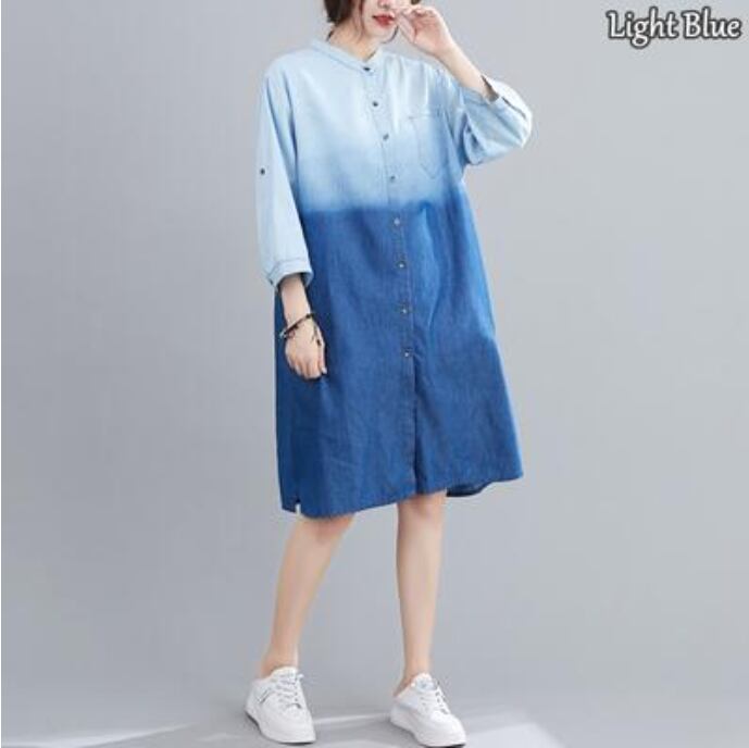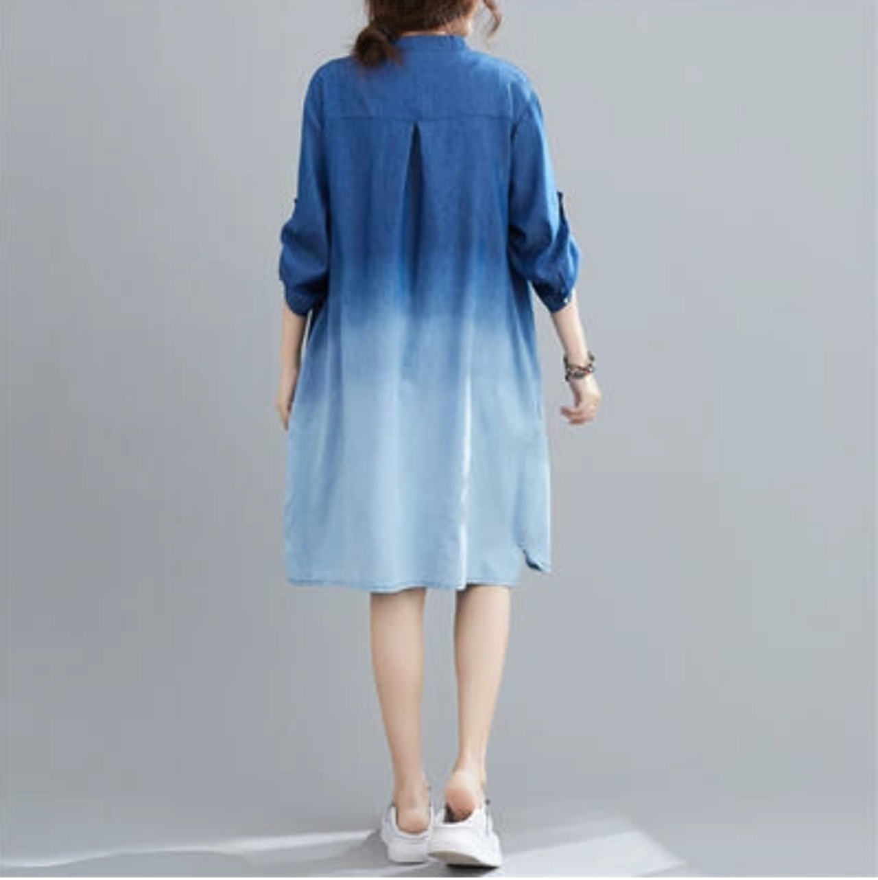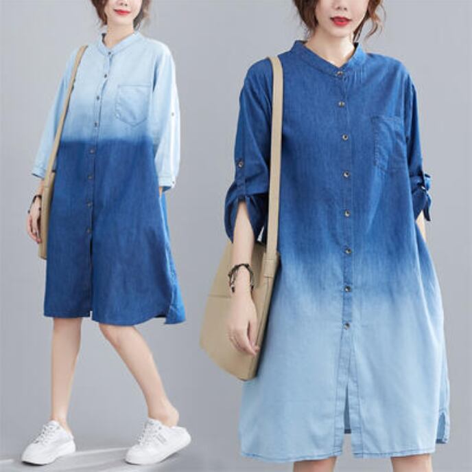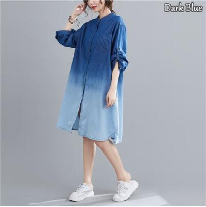 全2色 ワンピース ひざ丈 カジュアル おしゃれ 夏 袖あり 七分袖 レディース デニム 可愛い ワンピ ドレス シャツワンピース 羽織り かっこいい グラデーション バイカラー 体型カバー 春 春夏 秋 チュニック シンプル バンドカラー ネイビー ブルー 20代 30代 40代 50代