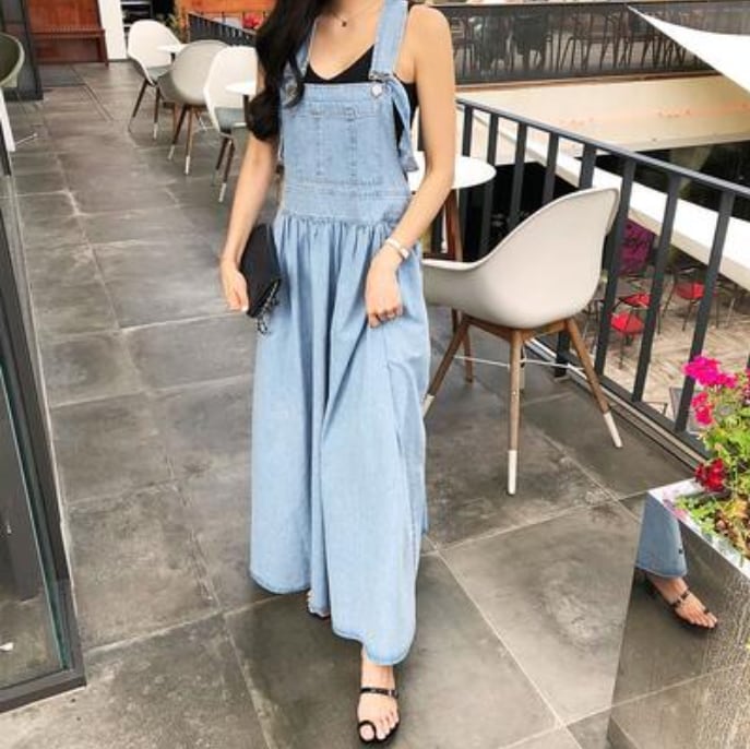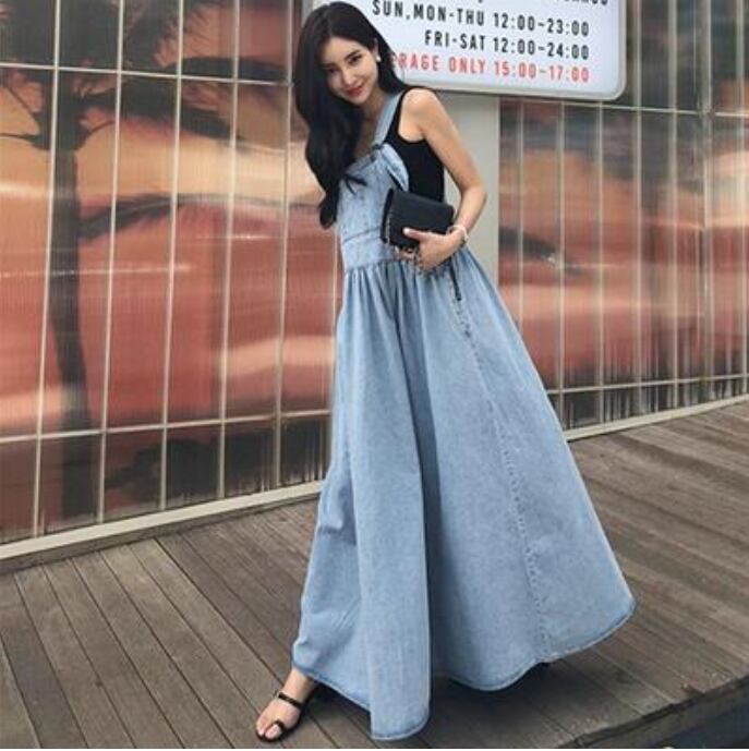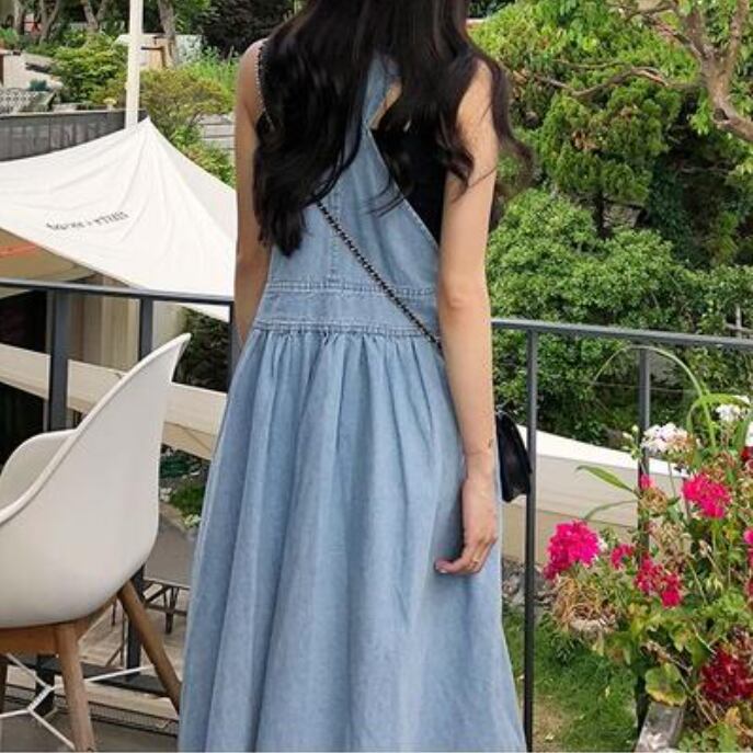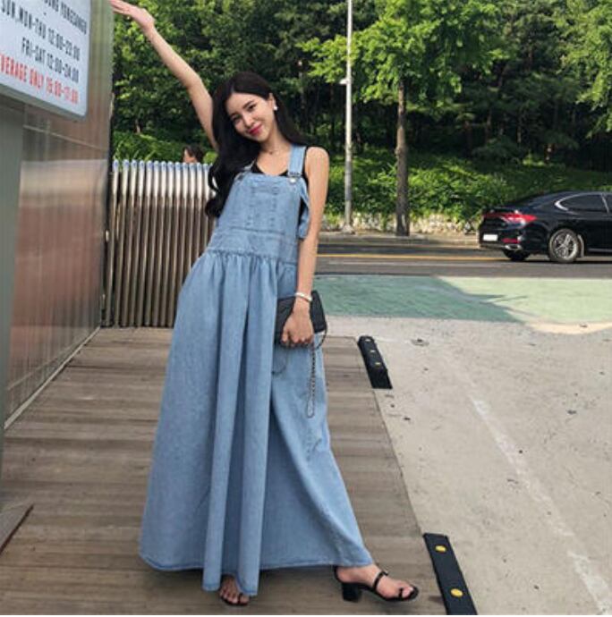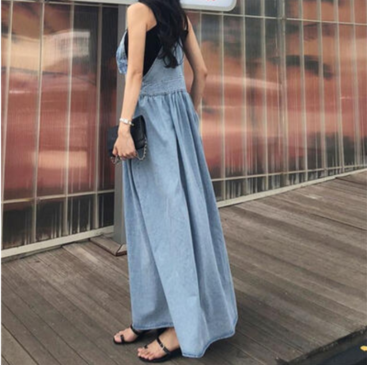 大きいサイズ XL 体型カバーワンピース ロング丈 デニム サロペットスカート カジュアル おしゃれ 夏 ロングワンピ マキシ丈 ジャンパースカート レディース 可愛い ワンピ ドレス シンプル ゆったり 春 夏 秋 Aライン オールシーズン ブルー 20代 30代 40代 50代