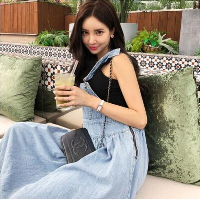 大きめサイズでゆるっと着られるデニムサロペットスカート。