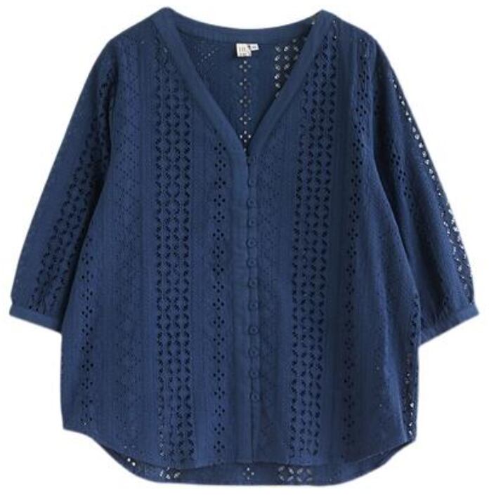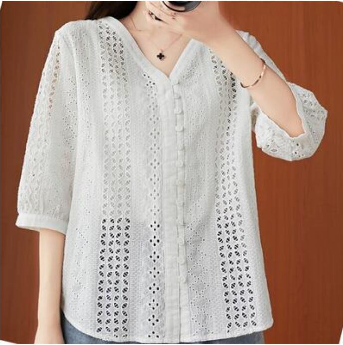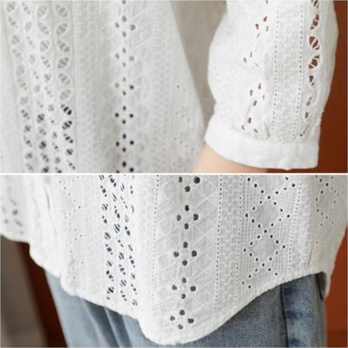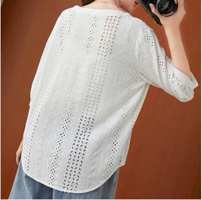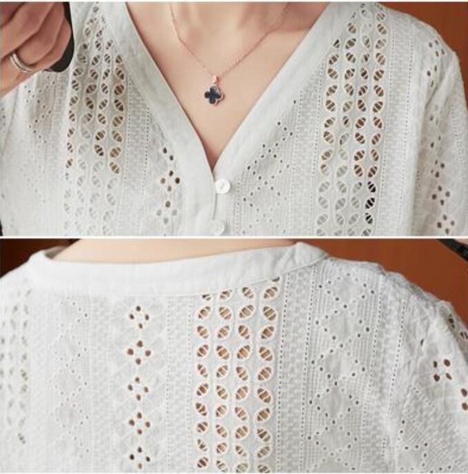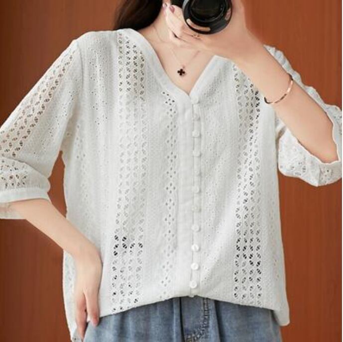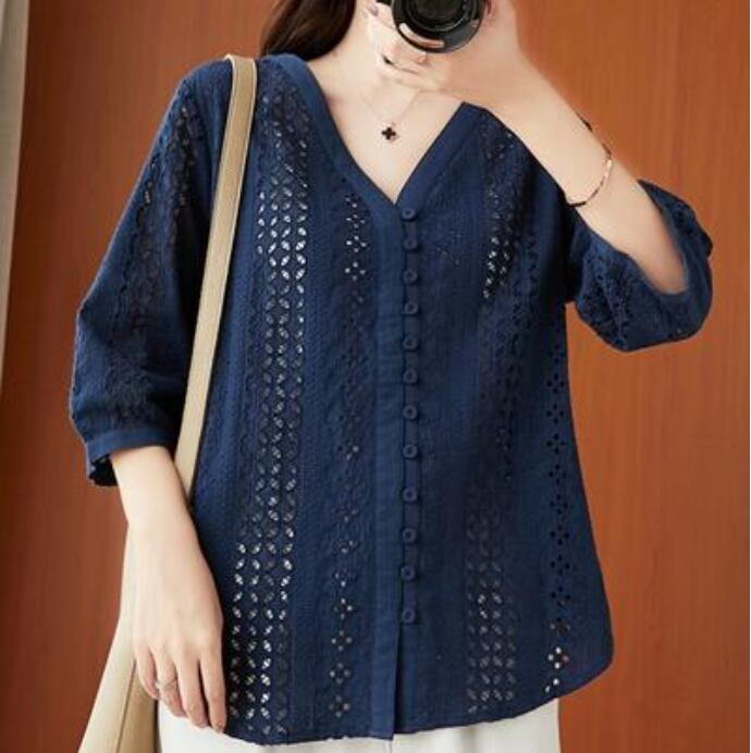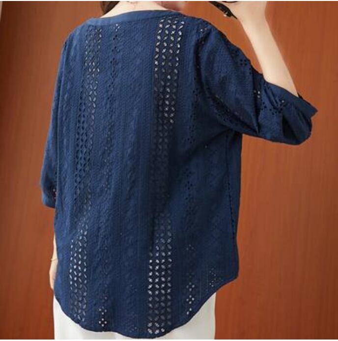 全2色 フェミニン 可愛い 袖ありトップス レディース ブラウス シャツ きれいめ カジュアル 七分袖 夏 春 レース おしゃれ Vネック 春 夏 秋 透け感 シンプル お出かけ 抜け感 こなれ感 上品 薄手 エレガント オフィス ホワイト 白 ネイビー 20代 30代 40代 50代