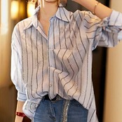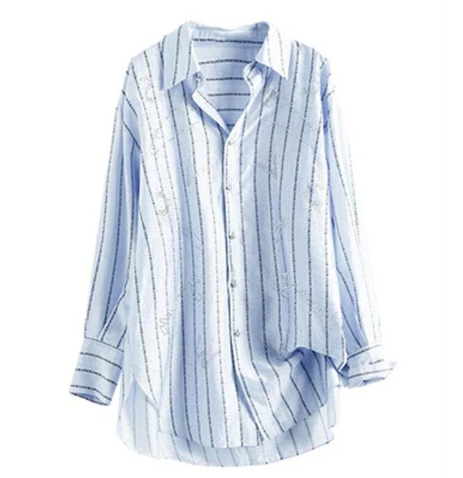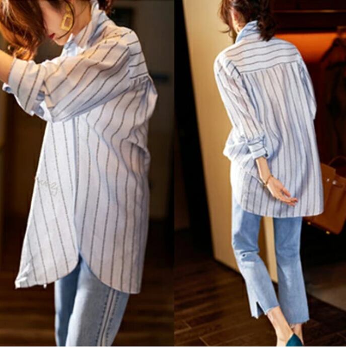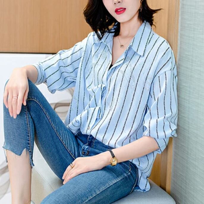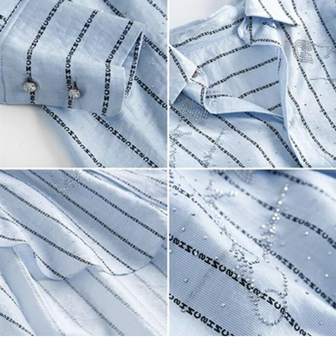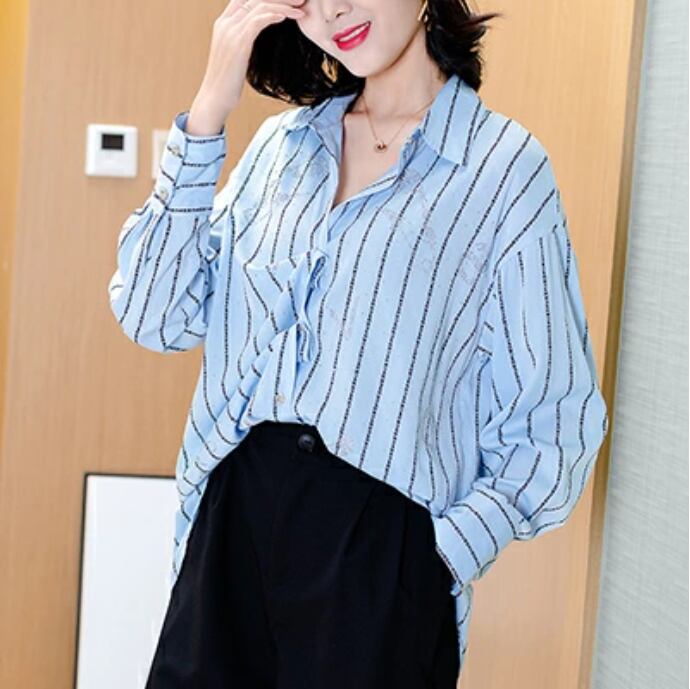 着痩せトップス レディース ブラウス シャツ きれいめ ボーダー 長袖 夏 春 おしゃれ フェミニン 可愛い 春夏 春秋 秋 こなれ感 シンプル お出かけ セレブ感 上品 薄手 エレガント オフィス ブルー 20代 30代 40代 50代 通勤 コーデ マニッシュ ストライプ XL ラインストーン