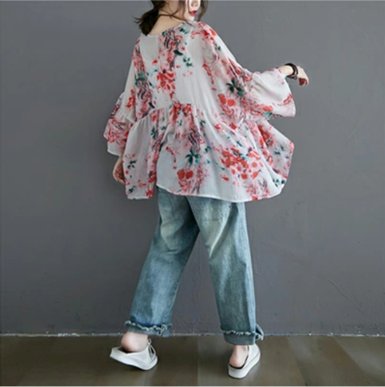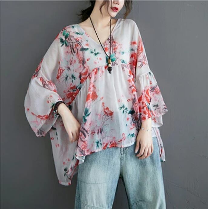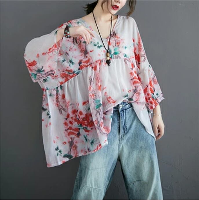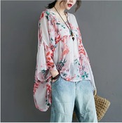透け感のある生地に華やかな花柄がプリントされたリネン混ブラウス。