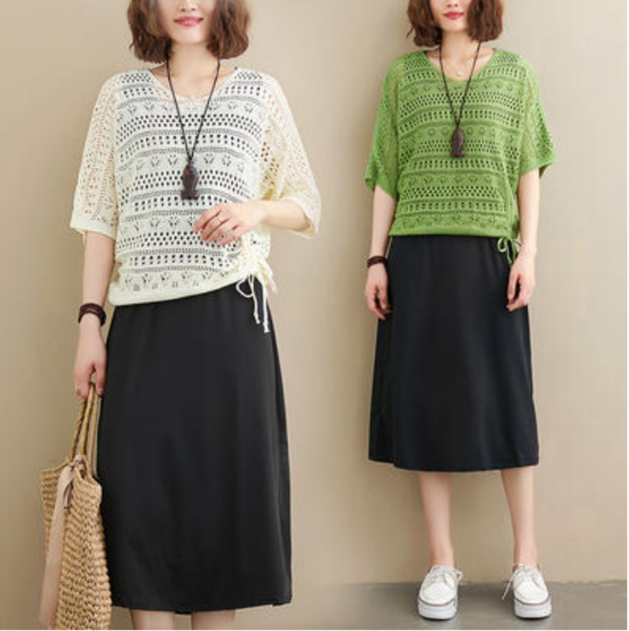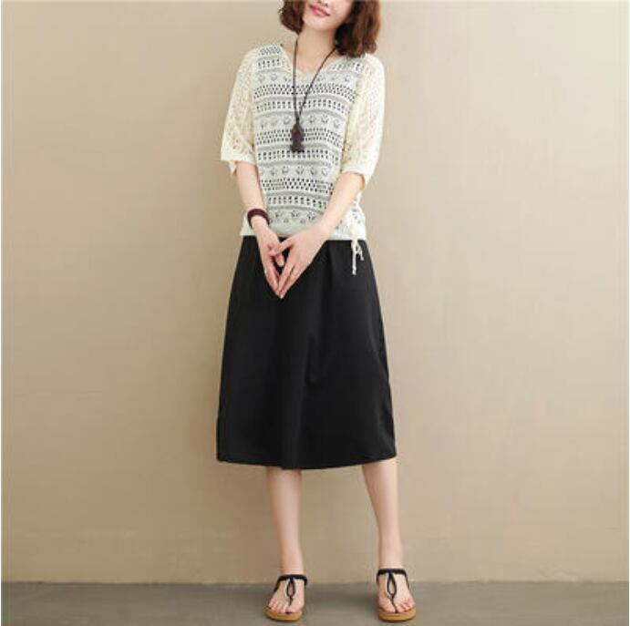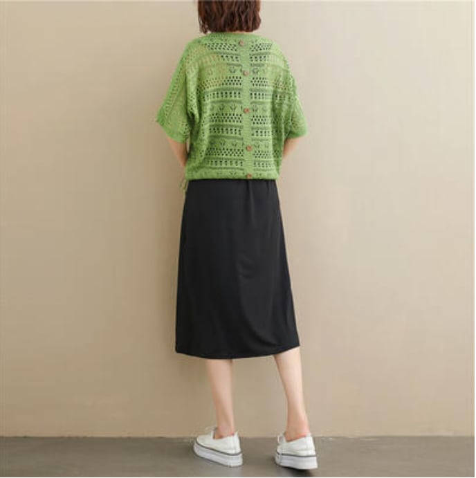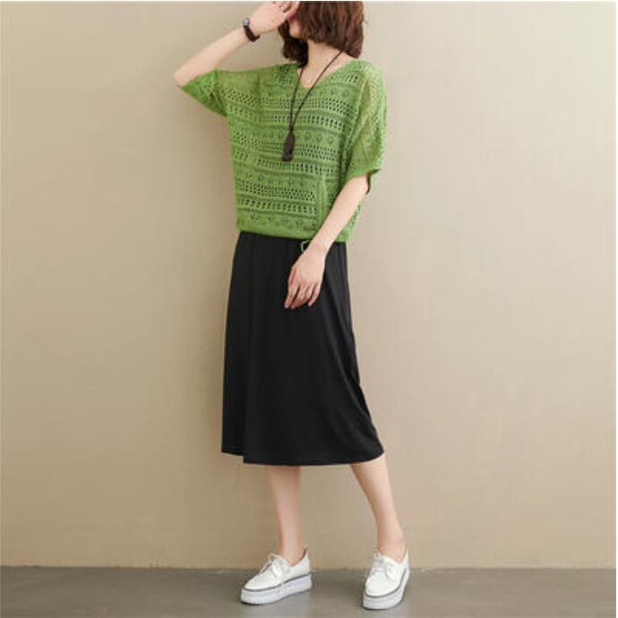 全2色 セットアップ 2点セット レディース カジュアル ワンピースセット おしゃれ 春 夏 カットソー ニット レース シンプル 可愛い 半袖 楽ちん ひざ丈 体型カバー 春秋 春夏 透け感 グリーン ホワイト 白 ブラック 黒 カーキ 20代 30代 40代 50代