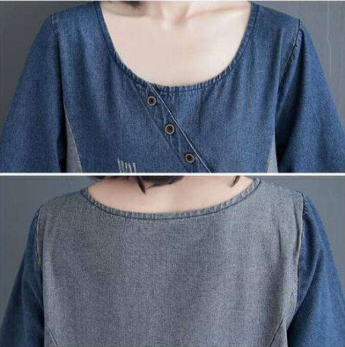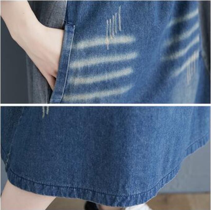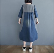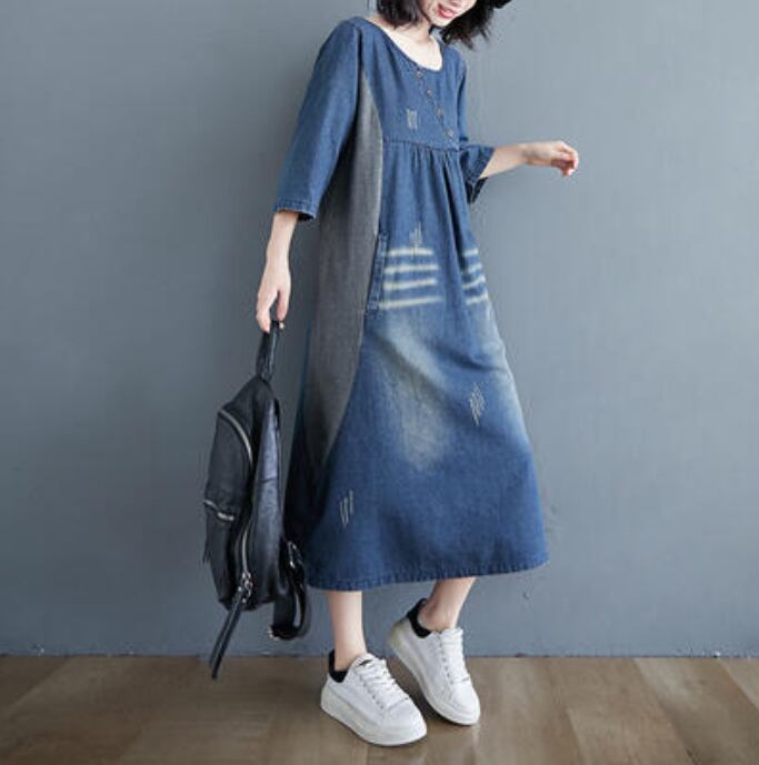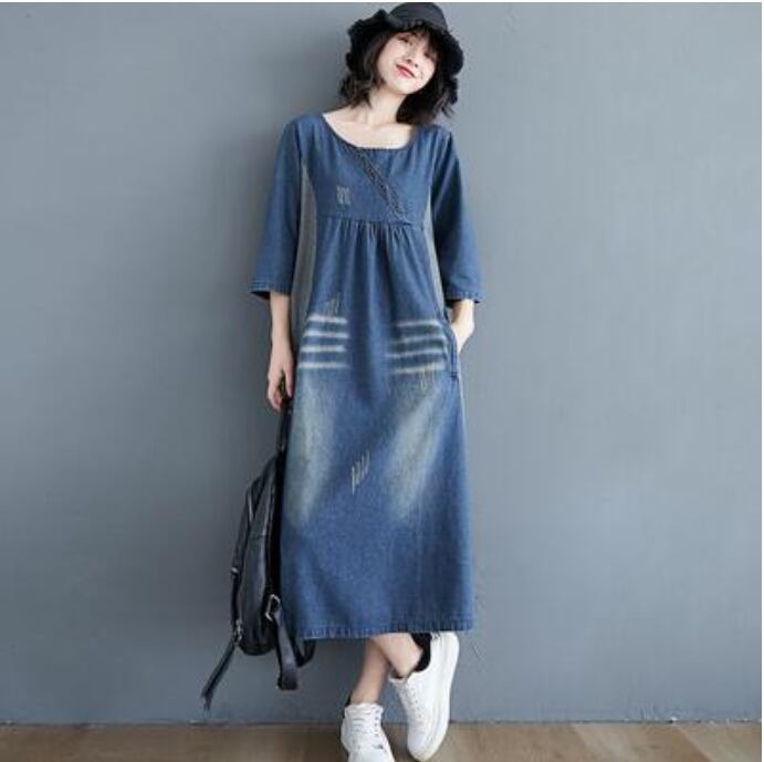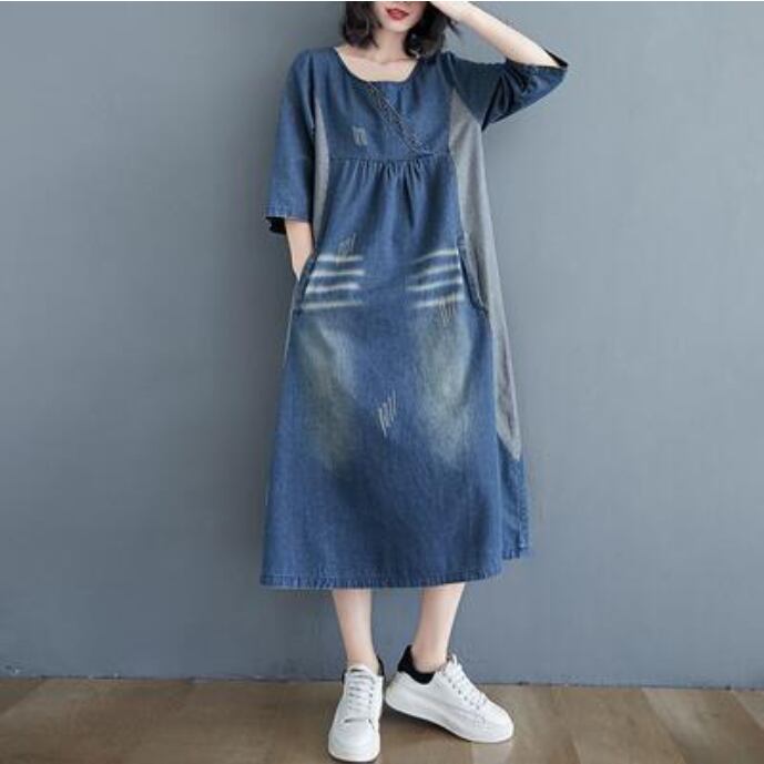 ワンピース ミモレ丈 デニム カジュアル おしゃれ 夏 七分袖 レディース 可愛い ワンピ ドレス ダメージ Aライン 切り替え 色落ち かっこいい ヴィンテージ ゆったり 体型カバー 大きいサイズ 2XL 春夏 秋 ブルー 20代 30代 40代 50代